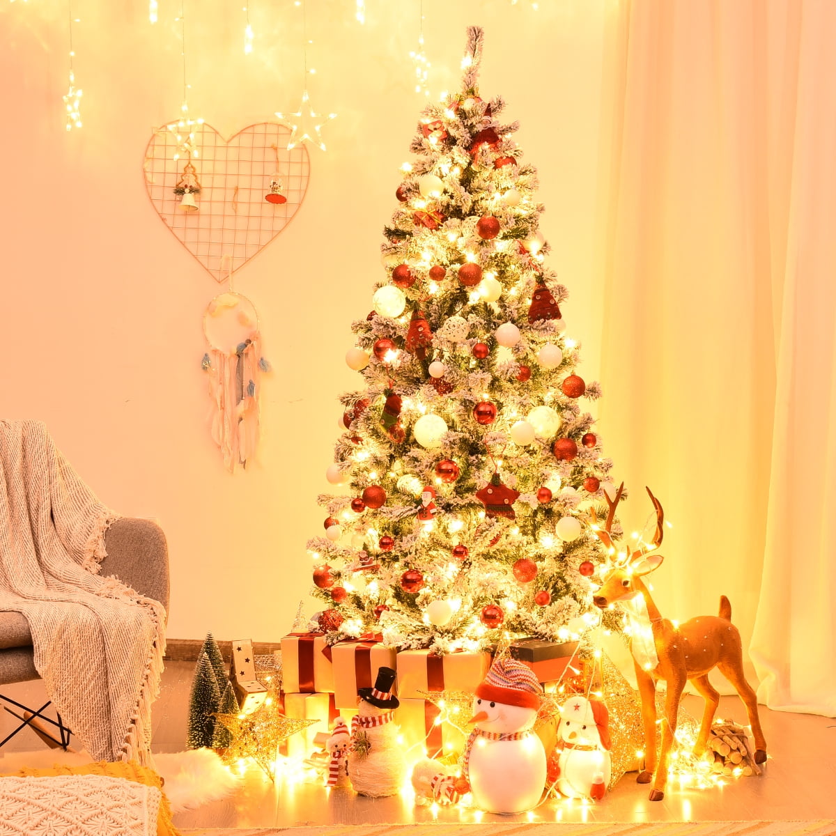Costway 6 ft Pre-Lit Premium Snow Flocked Hinged Artificial Christmas Tree with 250 Lights