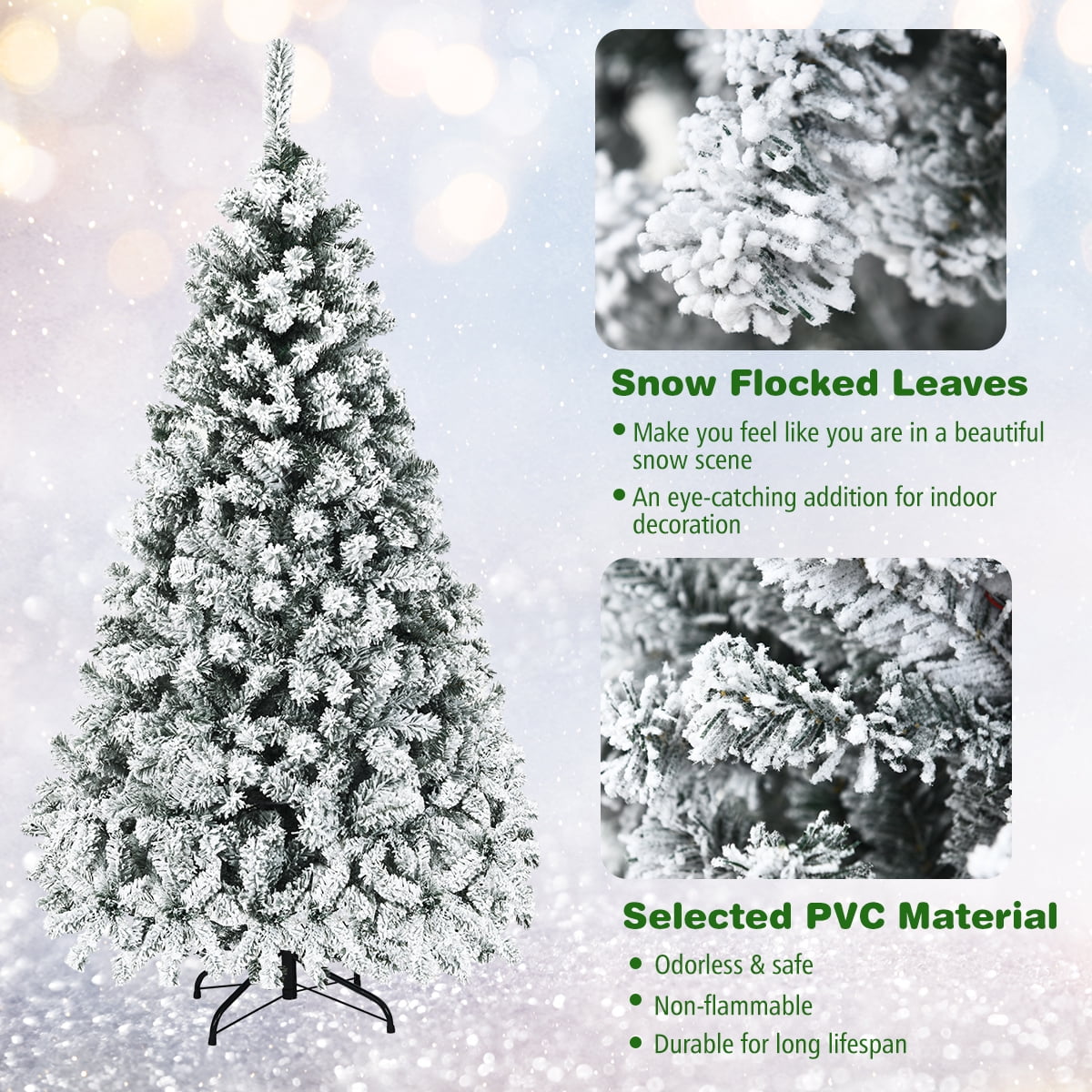 Selected PVC with Snow Flocked Design: This lush Christmas tree is made of environmental-friendly and non-flammable PVC material, which is harmless and safe to use. Besides, the leaves with realistic flocked snow create a unique winter feeling, making the whole tree leafier and fluffier. Pre-lit LED Lights: This Christmas tree is equipped with 250 LED lights with warm white color, which is energy-efficient and long lasting. And UL certified adapter is safe to use. Glowing warmly from our centerpiece tree’s branches can provide the perfect brightness, creating a soft and calm mood for the room. Easy to Assemble with Hinged Design: In a few simple steps, this Christmas tree with 3 sections is easy to assemble, disassemble and store. And the hinged branches will expand easier to save your time and energy. Just arrange it a little, hang the decorations, and a beautiful Christmas tree is finished. Dense Branches for Versatility: With 600 branch tips and snow flocked leaves, this full-bodied Christmas tree is like a real tree covered with snow. The 6 ft stereoscopic tree is an attractive addition to blend perfectly with the winter scenery. It is ideal for home, shops, schools, etc. Sturdy Metal Stand: Compared with other cheap plastic base, our reinforced metal stand will provide the tree with greater support and ensure good stability. Foldable x-shaped stand can keep the tree standing upright and prevent the tree from falling. And non-slip foot pads can protect the floor from scratches.