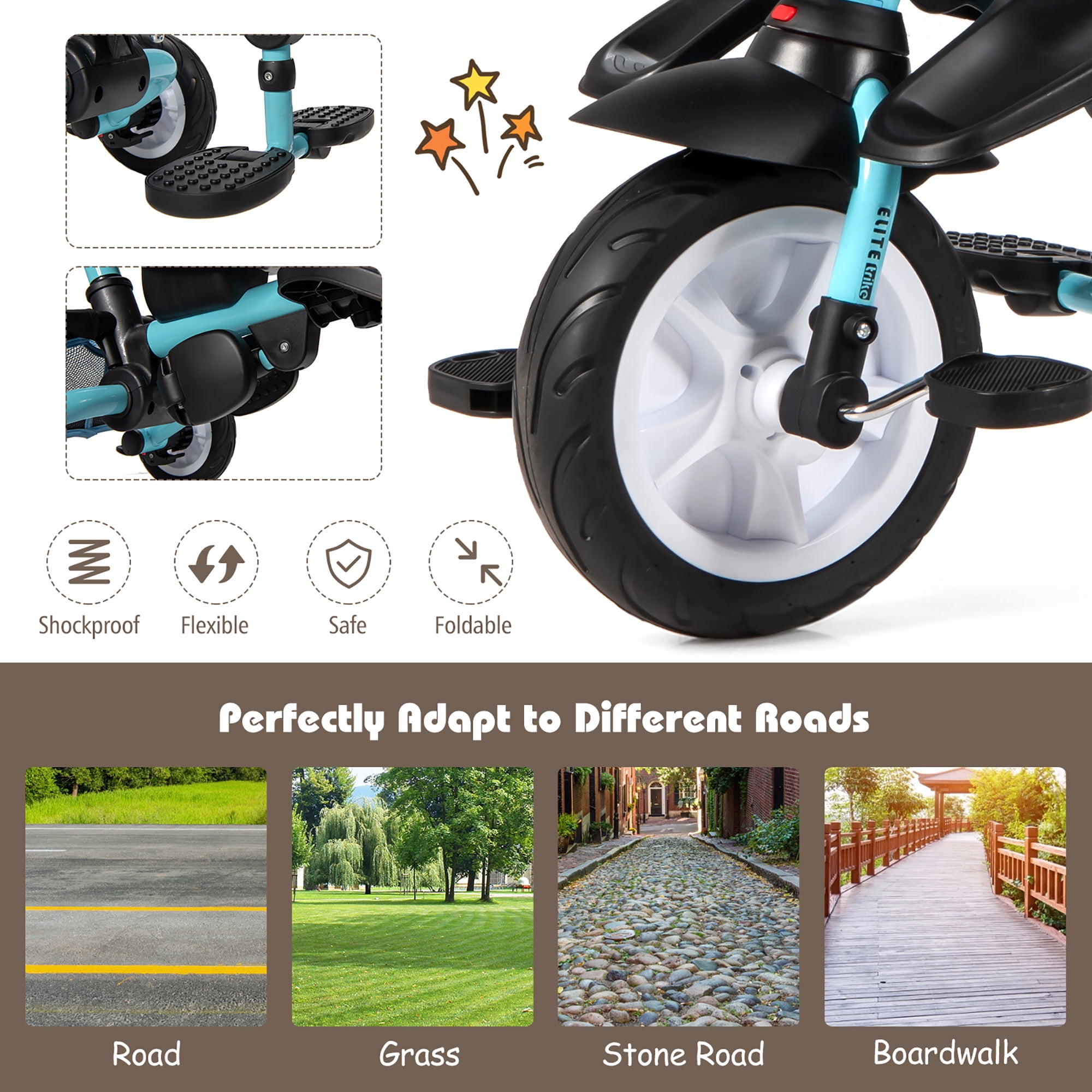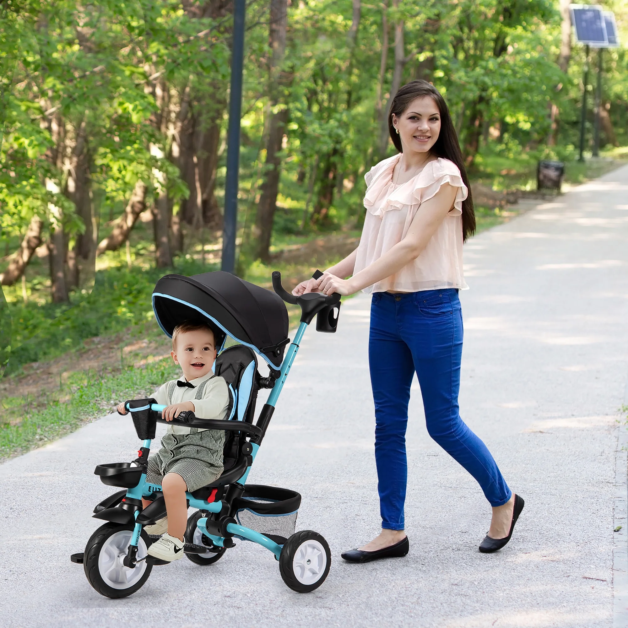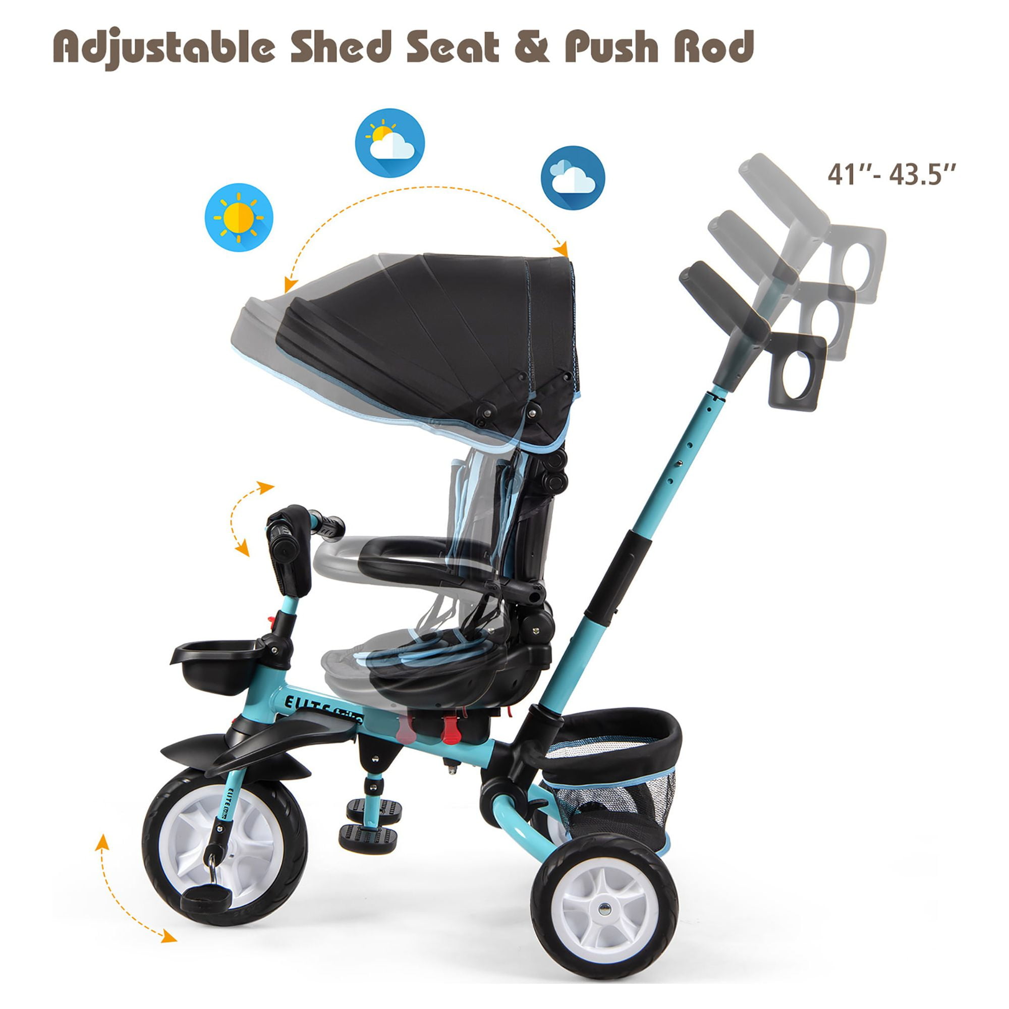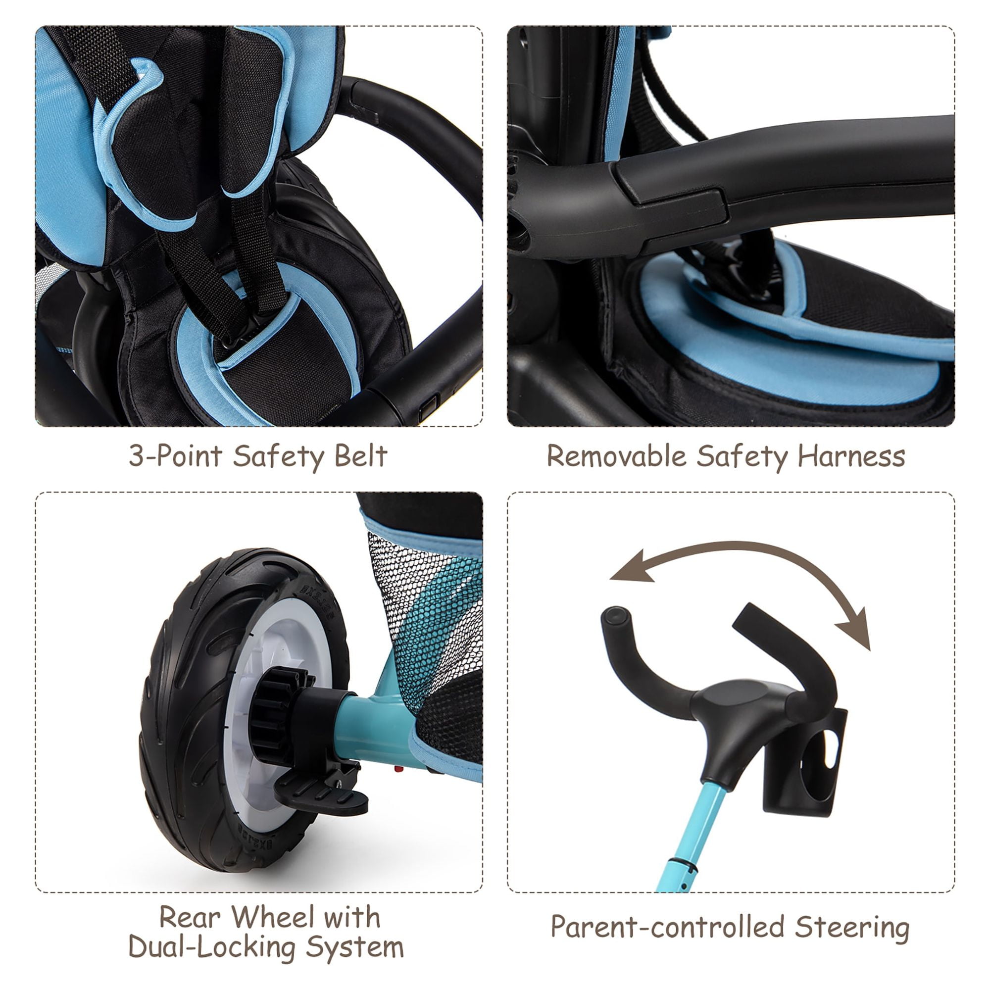Our baby stroller tricycle is suitable for children from 12 to 50 months of age and can provide them with 6 ways to ride, including baby tricycle, steering tricycle, learning tricycle and classic tricycle. The adjustable push rod on the back can help parents to better adjust the direction of the tricycle. Besides, the 360-degree rotatable seat increases the face-to-face interaction between the kids and the parent and helps the baby appreciate the outside scenery. Damping wheels with brakes have high wear resistance, can effectively brake and adapt to a variety of roads. In addition, the three-point safety belt and guardrail can provide the baby with maximum safety and comfort in any mode.