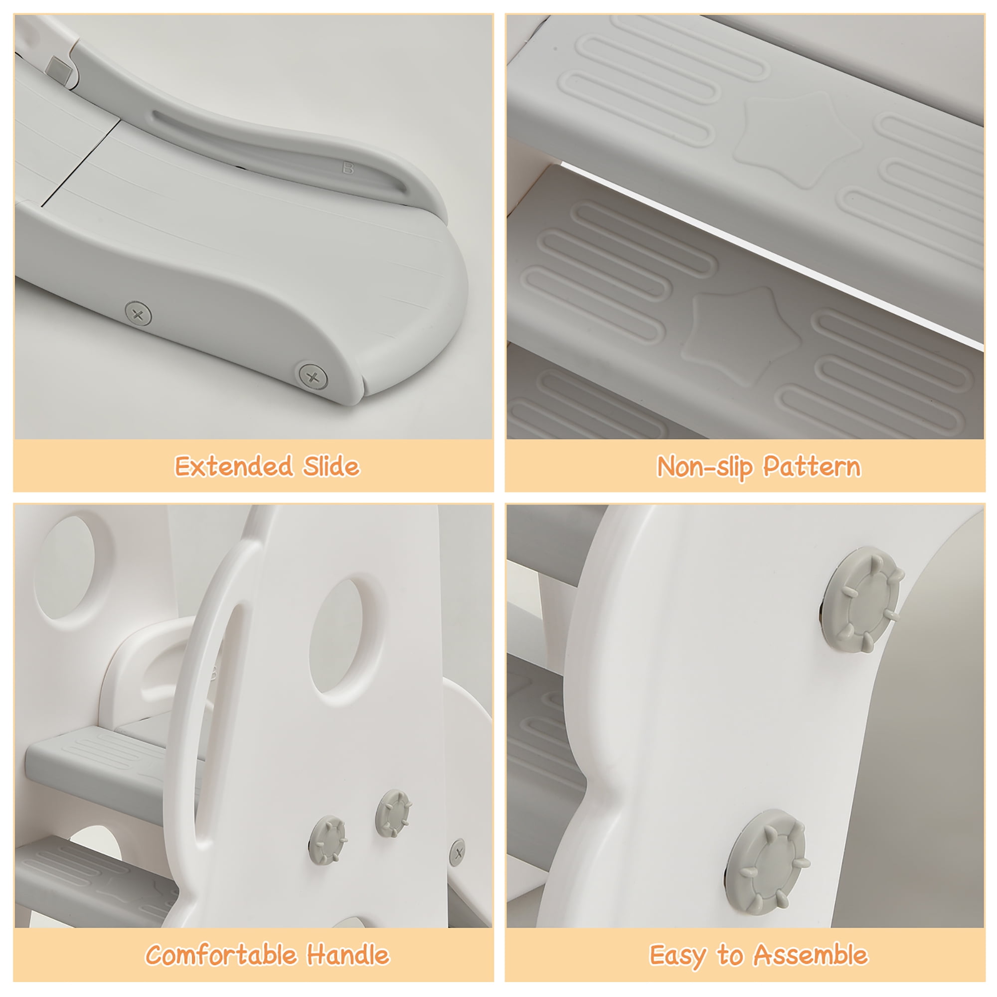 This colorful game set offers 6 functions: smooth slide, climbing ladder, sturdy swing, adjustable basketball stand, football gate and golf hole combinations, which are suitable for home use. All activity elements are sized for toddlers and kids. This 6-in-1 kids climber slide playset greatly meets your children’s different needs. Made of high quality HDPE and PP material, this kids’ slide and swing set ensures your kids’ safety while using it. Additionally, stable construction adds more safety, and you can inject sand or water into the wide base to increase overall stability. The smooth slide with anti-slip steps ensures smooth slide and safely land. Besides, the adjustable swing with T-shaped forward-leaning safety protection can accompany your kids while they grow up. It is the perfect gift for your children. Feature 6-in-1 playing set develops kids’ hand-eye coordination ability and balance ability Well-selected HDPE and PP material for long time service 3 ball games include basketball hoop, football gate and golf hole Long slide with 3 activity zones for smoothly slide and safe land Adjustable swing and basketball rack grows with your kids Anti-slip steps for convenient and safe climbing Safety harness and T-shaped safety protection ensure the safety of your baby The water injection base offers strong stability Easy to assemble with detailed instruction Specification Color: White Material: HDPE, PP Overall dimension: 68” x 77.5” x 42.5”-47.5” (L x W x H) Net weight: 39.5 lbs Weight capacity of slide: 110 lbs Weight capacity of swing: 44 lbs Recommended age: 2-7 years old Package includes: 1 x Slide and swing set 1 x Basketball 1 x Football 2 x Golf 1 x Golf club 1 x Instruction