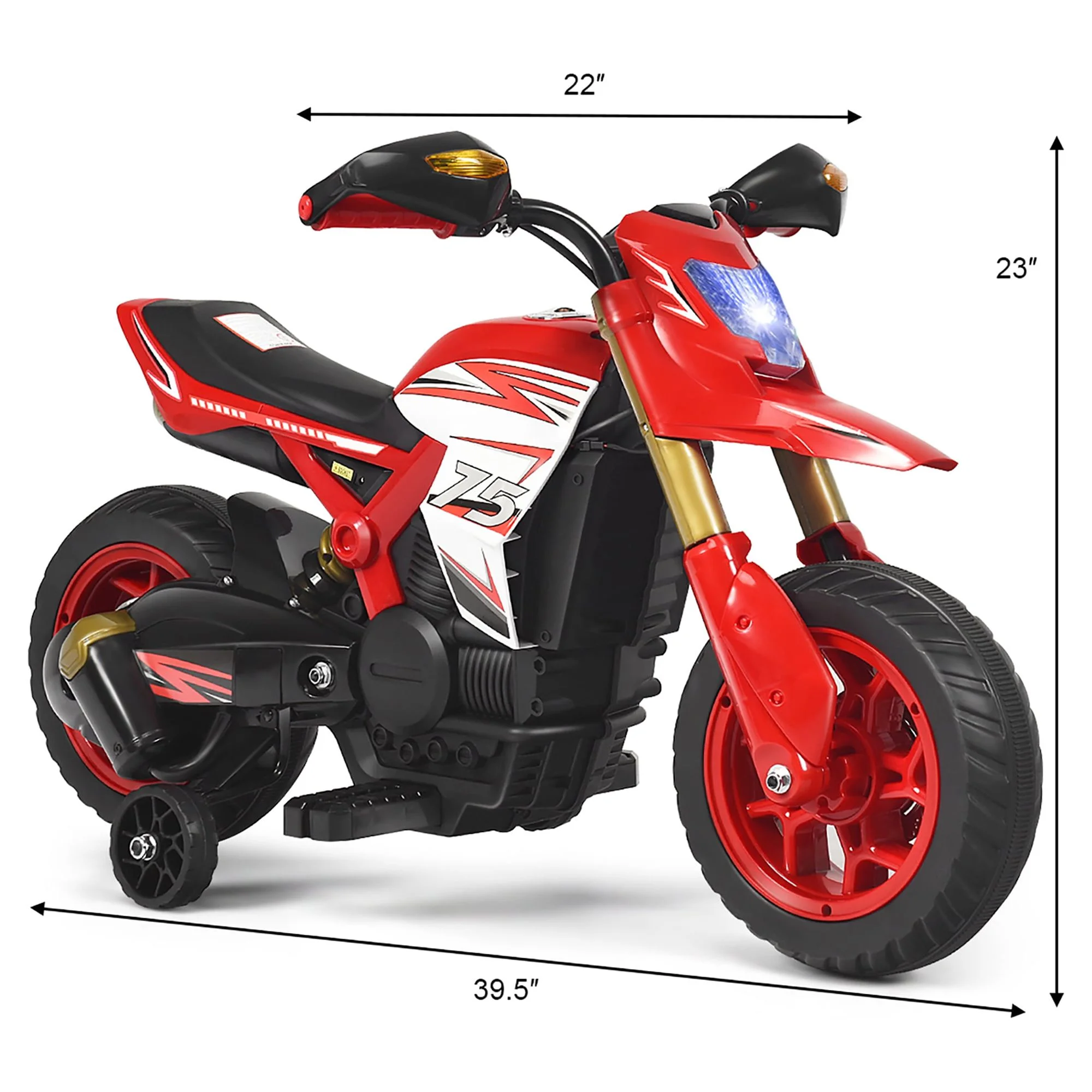 If you are looking for a gift to surprise your dear kids, this battery powered motorcycle will be a perfect choice. Compared with ordinary 2-wheel structure, the motorcycle designed with training wheels is capable of enhancing steadiness during driving, so as to secure your kids. Plus, the wear resistant wheels allow kids to ride on all sorts of ground, indoor or outdoor, to let your kids enjoy the driving time. It also takes the comfortableness during driving into consideration, and curved seat fitting well with kids’ body curve is the best proof. You kids will sooner be skilled in driving this motorcycle as it is fairly easy to operate, which only need to press the forward button on the handle. This cool motorcycle will accompany your kids and create a happy childhood memory. So why you are you still waiting to bring it home? Feature Forward button beside the handle for convenient and simple start Equipped with training wheels to let kids drive with great stability Curved and wide seat for higher comfort Anti-Slip wheels, wear resistant, durable, suitable for different kinds of ground Rechargeable design, longer driving time after a full charge Bright headlight makes more realistic driving experience Cheerful gift for kids, either boys or girls, brighten their daily life Specification Color: Red Material: PP, Iron Overall Dimension: 39.5″X 22″ X 23″ (LXWXH) Charger Output: DC 6V Battery: DC 6V, 4.5 AH Speed: 2.5-3 km/h Net Weight: 17 lbs Weight Capacity: 66 lbs Recommended Age: 3+ Years Package Includes: 1 X Kids Ride On Motorcycle 1 X Charger 1 X User Manual