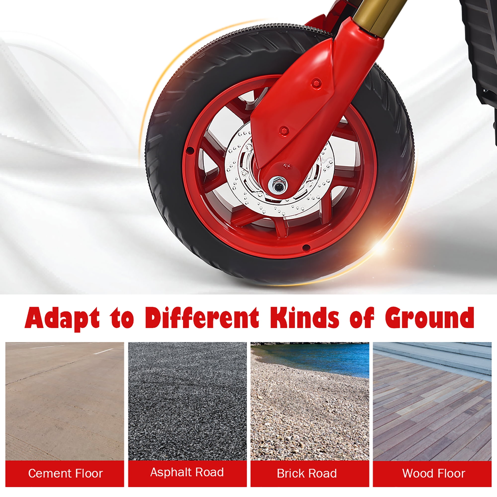 Simple & Comfortable Driving Experience: No any required complex operation, kids just need to press the forward button and then they can enjoy a fantastic driving experience. And curved seat fitting well with kids’ body curve is capable of improving the level of driving comfortableness. And foot rest at both sides makes it convenient to put feet for a rest as well. Training Wheels for Higher Safety: There are 2 training wheels which keep the motorcycle as steady as possible while preventing it from falling over to enable higher safety. Furthermore, the motorcycle features a low gravity so that kids can drive it with higher stability. In this way, you are supposed to trust your kids driving it. Ride on a Variety of Ground: The wheels featuring excellent wear resistance allow kids to ride on all sorts of ground, from wood floor to cement, from plastic racetrack to brick ground. Nearly no limitation to place, kids can enjoy their driving time. Besides, anti-slip tire pattern increases the friction with ground, capable of enhancing safety further. Rechargeable Design & Bright Head Light: It comes with a charger that helps you get this battery powered motorcycle fully charged for longer driving time. The input socket can be easily found beneath the seat. Meanwhile, the bright LED headlight will light up dark surroundings when the motorcycle moves forward so as to add more fun. Cool-Looking Gift Ideal for Kids: No needless to say, the motorcycle with stylish appearance will attract kid’s attention at the first sight, perfect as a birthday, Christmas gift for them. It will accompany your kids and create joyous childhood memories.