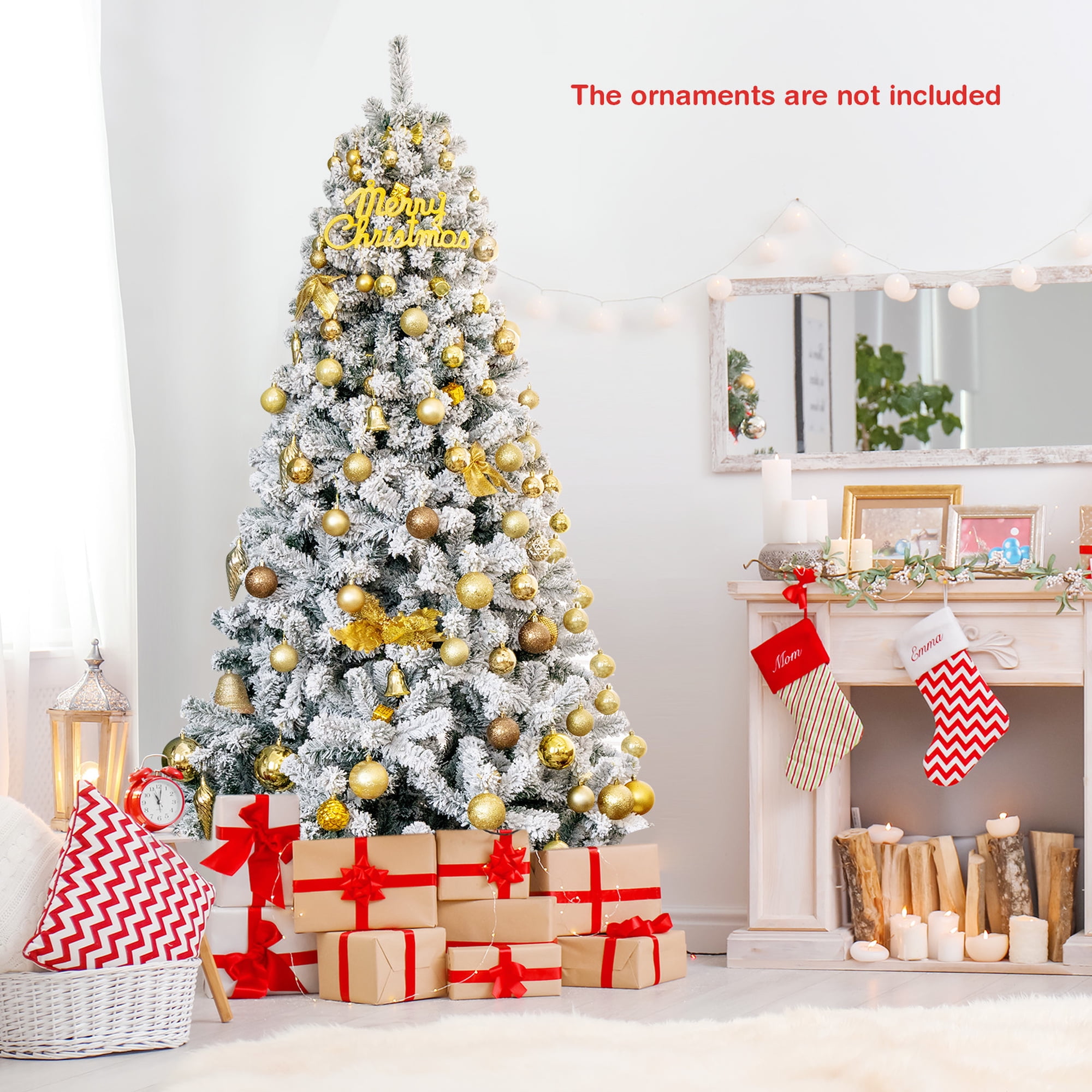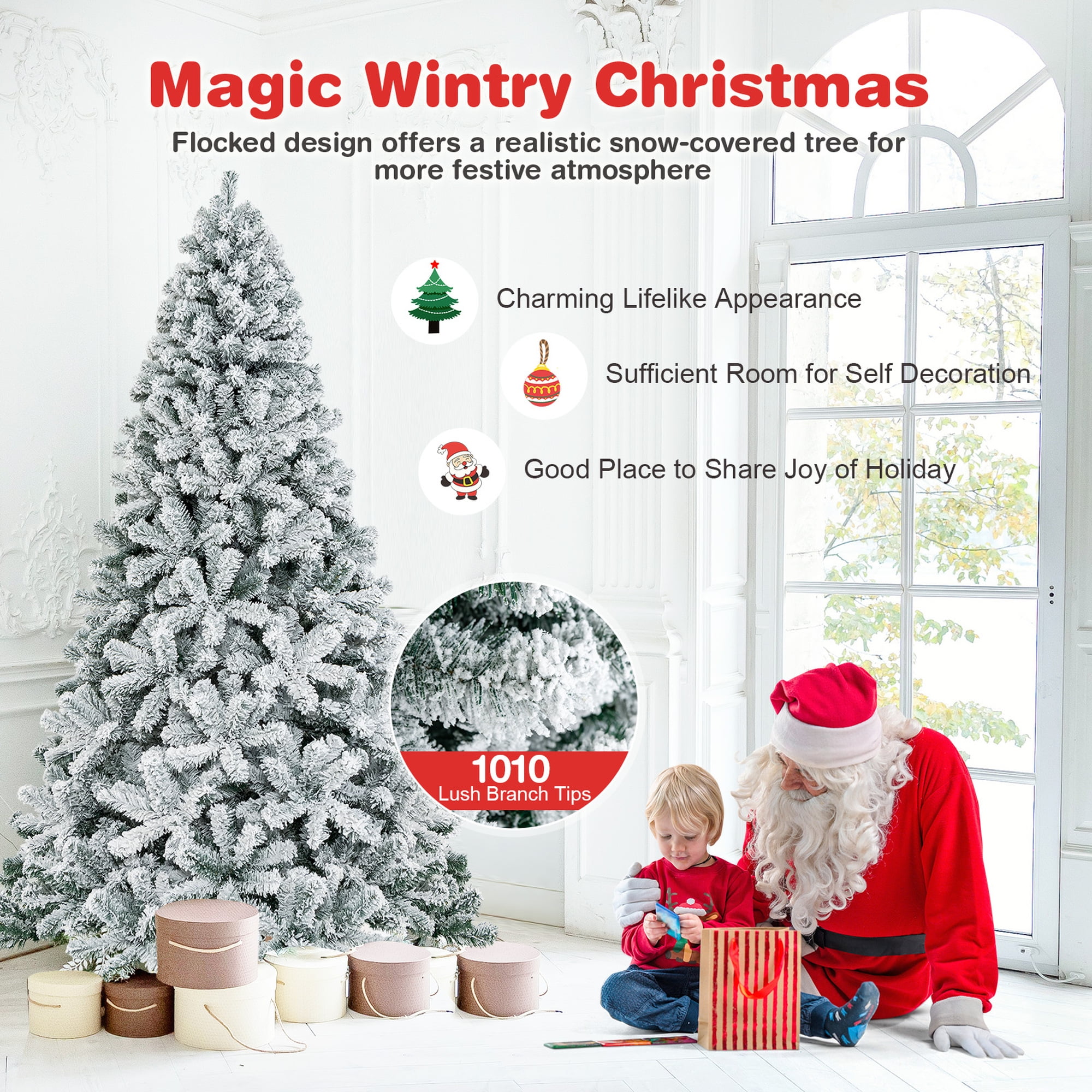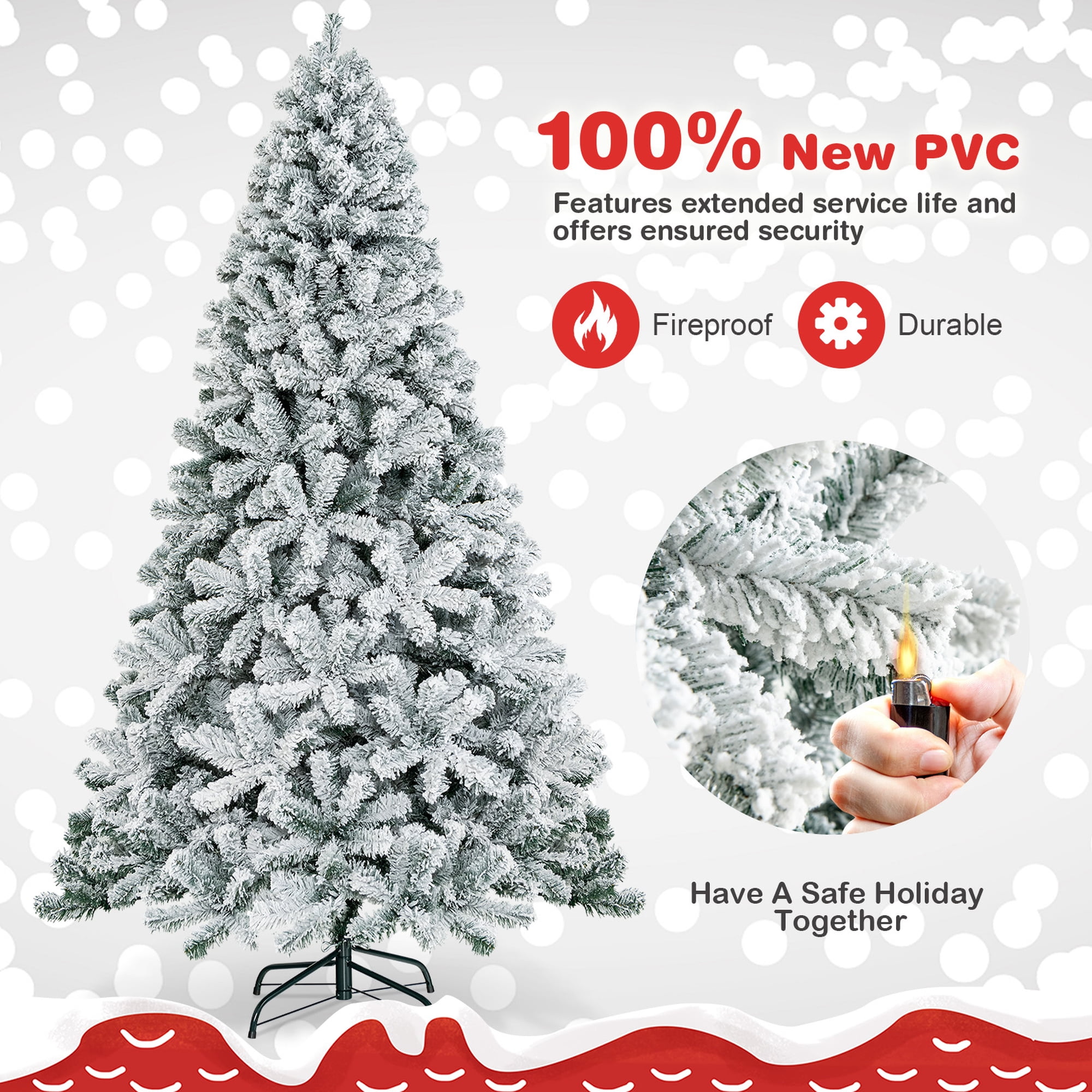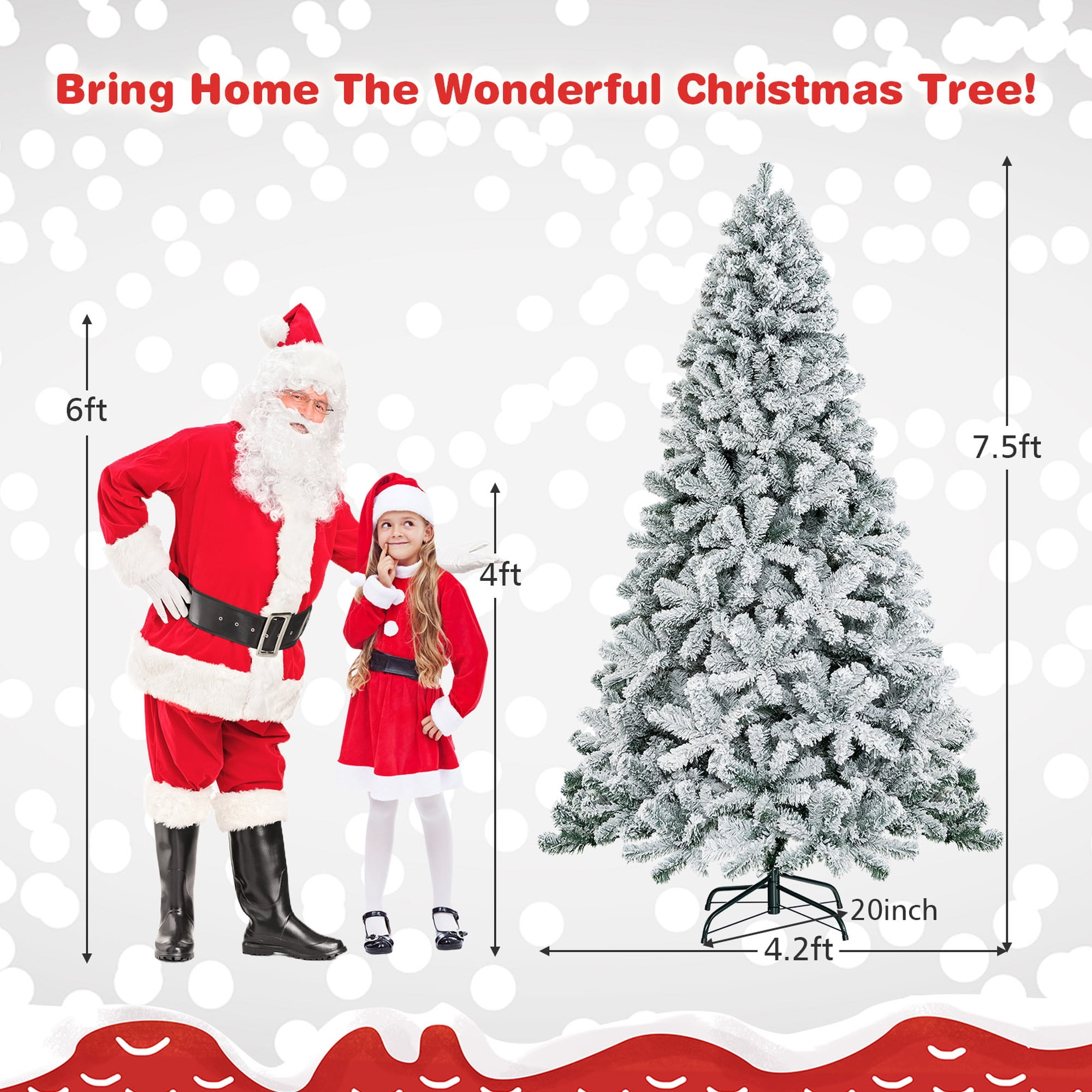 This is our brand new 7.5ft Christmas tree which is designed with 1010 branch tips and snow flocked leaves to offer an elegant and lush appearance. Simple Christmas tree allows you to decorate it freely with Christmas stockings, colored balls, lights or other ornaments according to your own preferences. It is effortless to make the tree fluff due to its hinged construction, while also facilitating its assemble and storage. Foldable X-shaped iron stand with foot pads prevents breakage and enhances the balance of the tree, providing stability to keep the wondrous Christmas tree standing all year around. Whether for your home, courtyard, or for commercial places like shops, hotels, the snow flocked tree is the perfect eye-catching decoration to add multiple fun and Christmas flavor to your life! Feature Crafted with 1010 branch tips for leafy and realistic appearance Snow flocked leaves create an elegant and unique atmosphere Non-flammable and eco-friendly PVC material, not easily deformed Simple style without any ornament, decorate it as you like All hinged construction convenient for assembly and storage Separated into 4 sections, easy to be placed in a tree storage bag X-shaped metal stand, wear and breakage resistant, offer more stability Footpads effectively protect floors from scratching Eye-catching addition for homes, restaurants, shops and other business places Match any style of room, add a rich Christmas atmosphere to you Specification Color: as the picture shows Main material: PVC, iron Overall Dimensions: Diameter4.2’x7.5’H Number of Tips: 1010 tips Net weight: about 20 Lbs Package Includes: 1xChristmas tree 1xstand