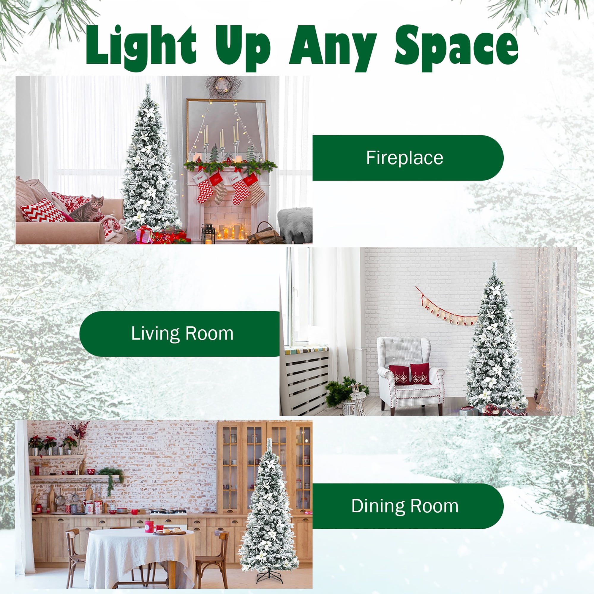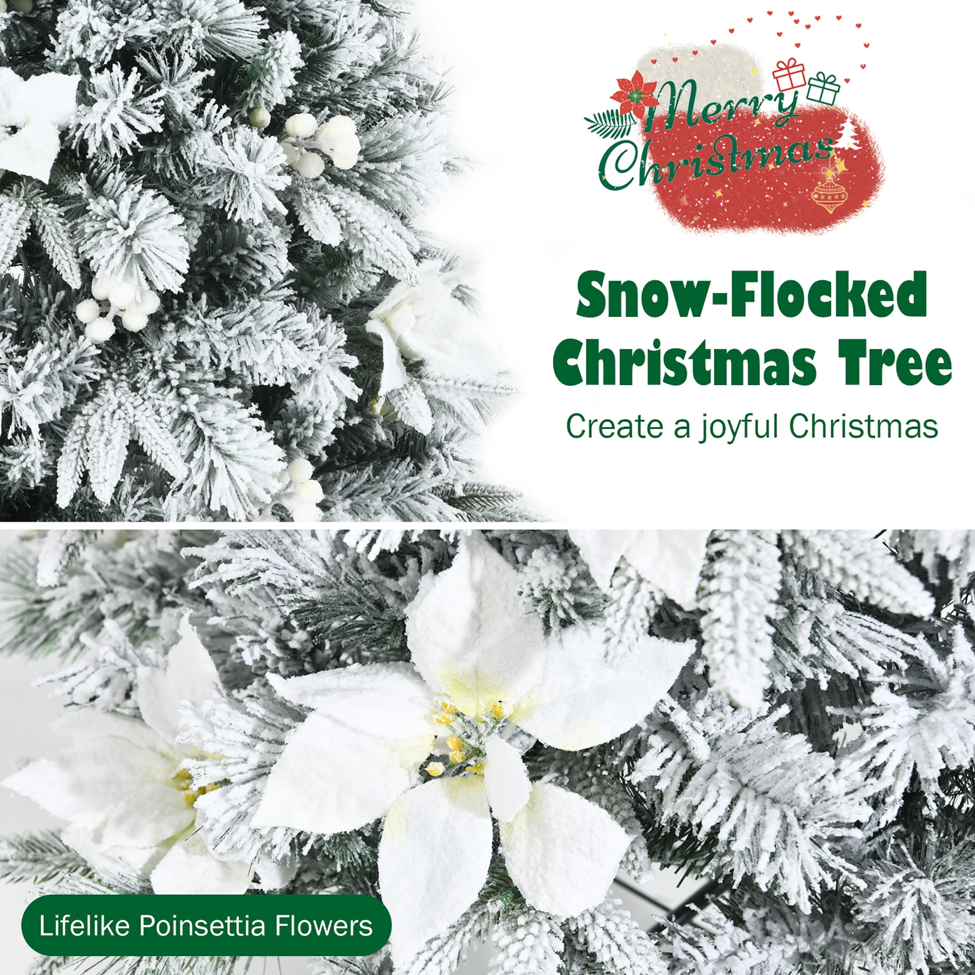 Costway 7ft Snow Flocked Christmas Pencil Tree w/ Berries & Poinsettia Flowers