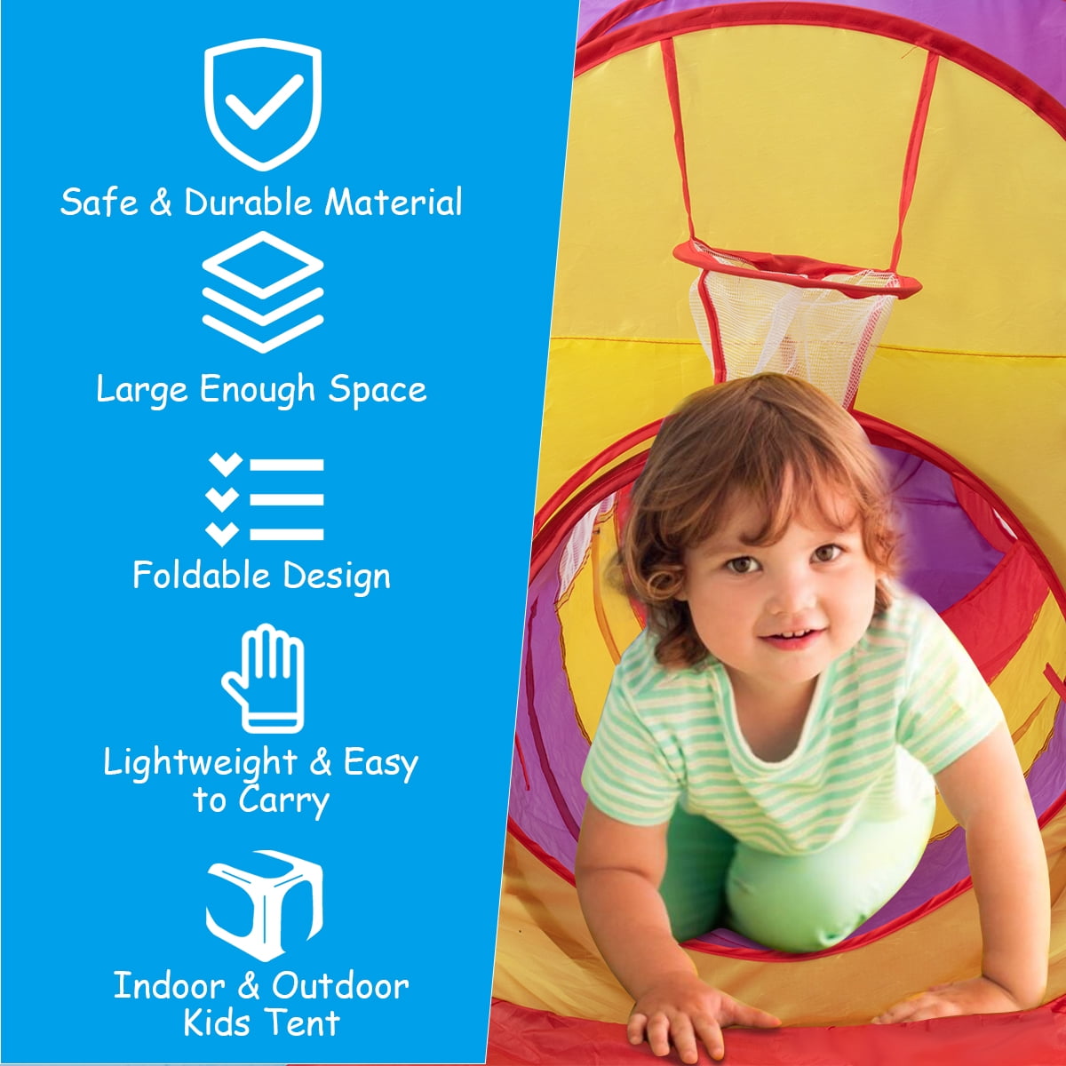 Do you want to built a game castle for your kids? Want kids to explore by themselves? Our 7pc Kids Tent completely meets your needs. Kids can crawl, play hide-and-seek, discover and explore in the tent. And you can fill the ball pit with hundreds of balls. Besides, our play tent has a basketball hoop, and kids can use it to practice shooting. In addition, this playhouse is made of 190t polyester, assuring you can use for a long time. When you get out, you can take it, because the tent can be folded separately and packaged inside a compact zipper storage case. 7pc Kids Tent, a good gift for your kids or your toddlers. Feature 7pc kids tents provides long-term entertainment for your children Fill the ball pit with hundreds of balls and let children play basketball 190t polyester guarantees a longer service life Spacious space allows parents and children to play together 7pc kids tent not only use to play, but also can store the kid’s toys Foldable design for easy assembly and carrying The perfect gift for children of various festivals Specification Color: Red, Yellow, Purple, Blue Net Weight: 6lbs Material: 190t Polyester cloth Triangular Play Tent Size: 31.5” x 31.5” x 35.5” (L x W x H) Square Play Tent Size: 29” x 29” x 29” (L x W x H) Ball Pit Size: 47” x 47” x 14.5” (L x W x H) Crawl Tunnel Size: 39.5” x 15.5” Backboard Size: 22” x 28.5” Ages: 18M+ Package includes: 2 x Triangular Play Tent 3 x Crawl Tunnel 1 x Square Play Tent 1 x Ball Pit with Hoop 1 x Zipper Carrying Case