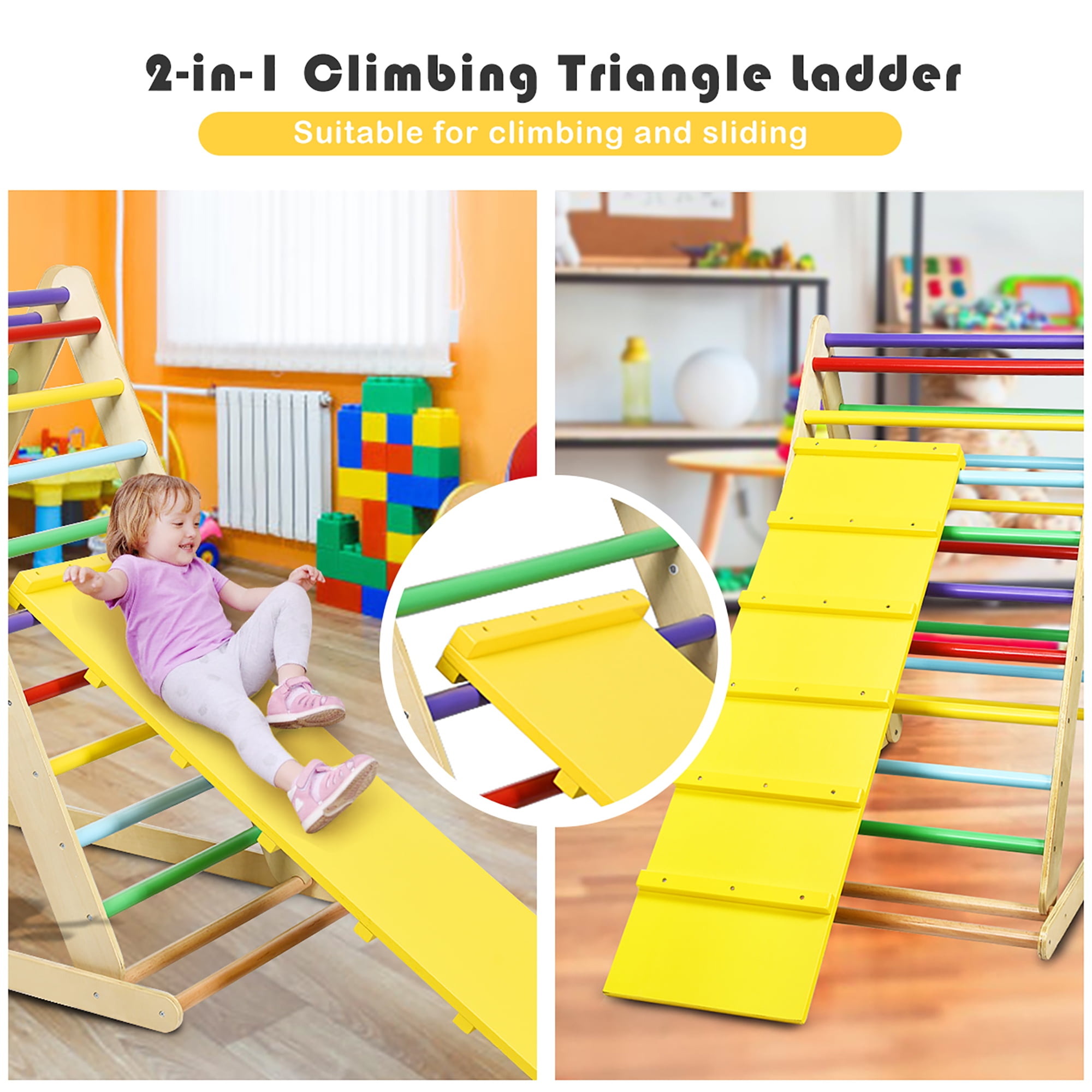 This climbing triangle ladder is a perfect gift for kids to have fun! It is made of high-quality natural wood and metal connections, which is very sturdy and durable. With a triangular structure and excellent workmanship, This 2-in-1 climbing triangle ladder comes with a ladder that can be used for climbing and sliding to help kids improve their sports skills and courage. In addition, the climbing triangle has a foldable design that allows easy storage and movement without taking up too much space. Assembly Video: Feature The smooth edges and exquisite workmanship protect children from injury With a high bearing capacity of 132 lbs for kids aged 6 months to 6 years The triangular structure provides a solid foundation to prevent collapse The surface is sprayed with non-toxic paint to protect children’s health Smooth waterproof surface makes it easy to clean and maintain 2-in-1 climbing triangle ladder allows kids to climb and slide An excellent choice to develop kids’ sports ability Made of high quality and sturdy natural wood Easy to assemble, saving you time and effort Specification Color: Colorful Material: Wood Product Size: 48” x 28” x 43.5” (L x W x H) Climbing Ramp Size: 47” x 14” (L x W) Folding Size: 28” x 7.5” x 47” (L x W x H) Net Weight: 35 lbs Bearing Capacity: 132 lbs Applicable Age: 6 Months – 6 Years old Package includes: 1x Climbing Triangle 1x Ladder 1x User’s Manual
