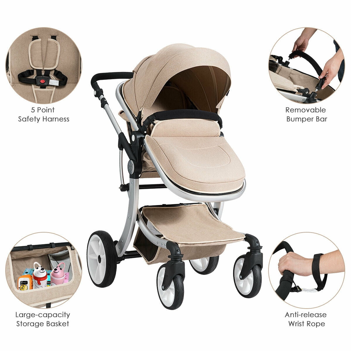 Costway Folding Aluminum Infant Bassinet Reversible Baby Stroller W/ Diaper Bag Beige