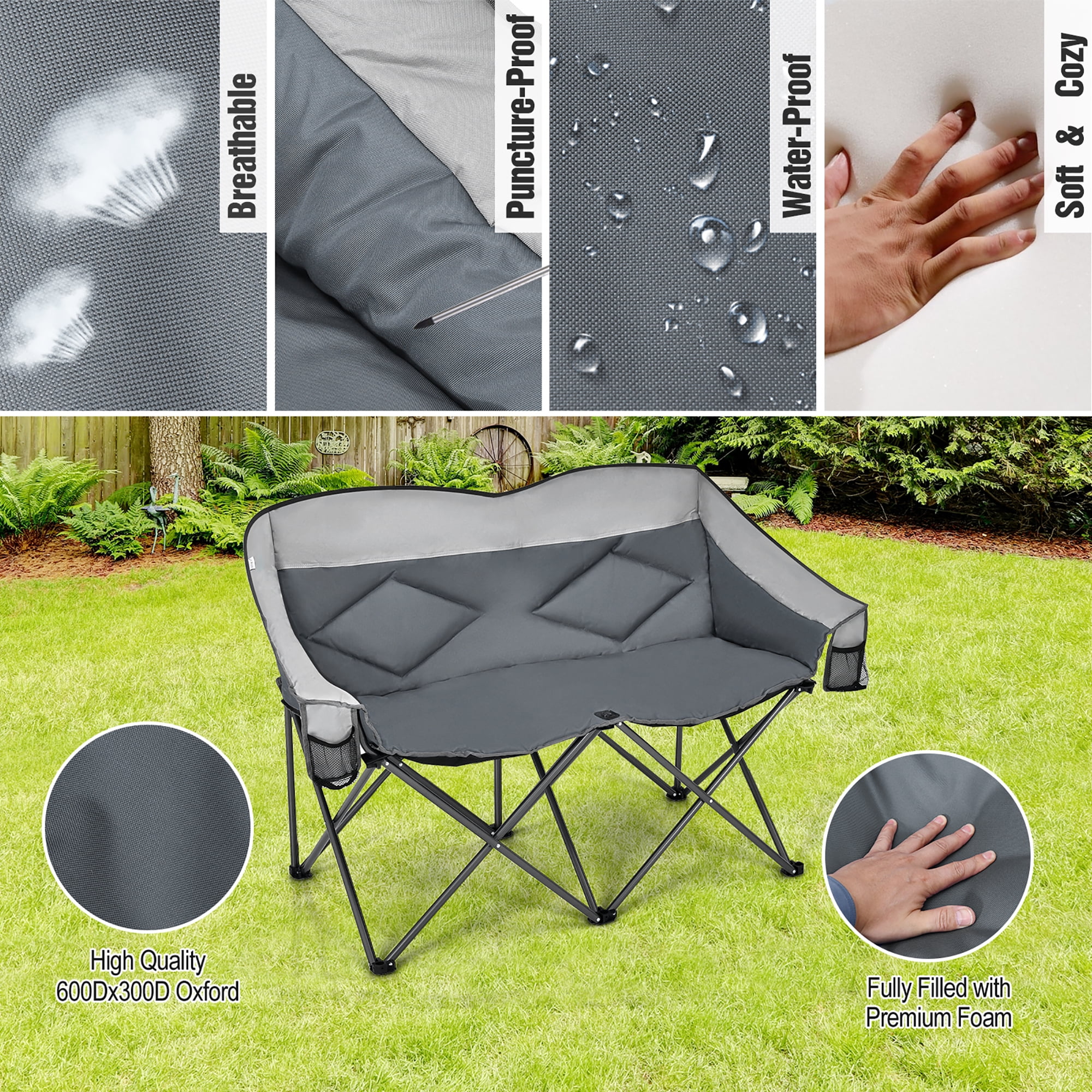 Costway Folding Camping Chair Loveseat Double Seat w/ Bags & Padded Backrest Gray
