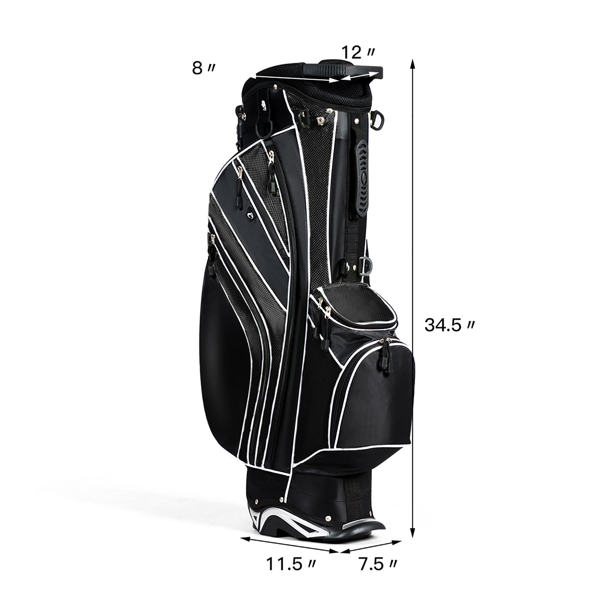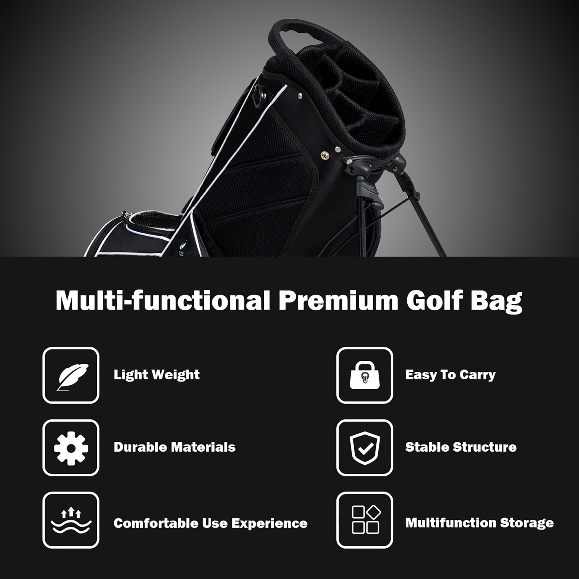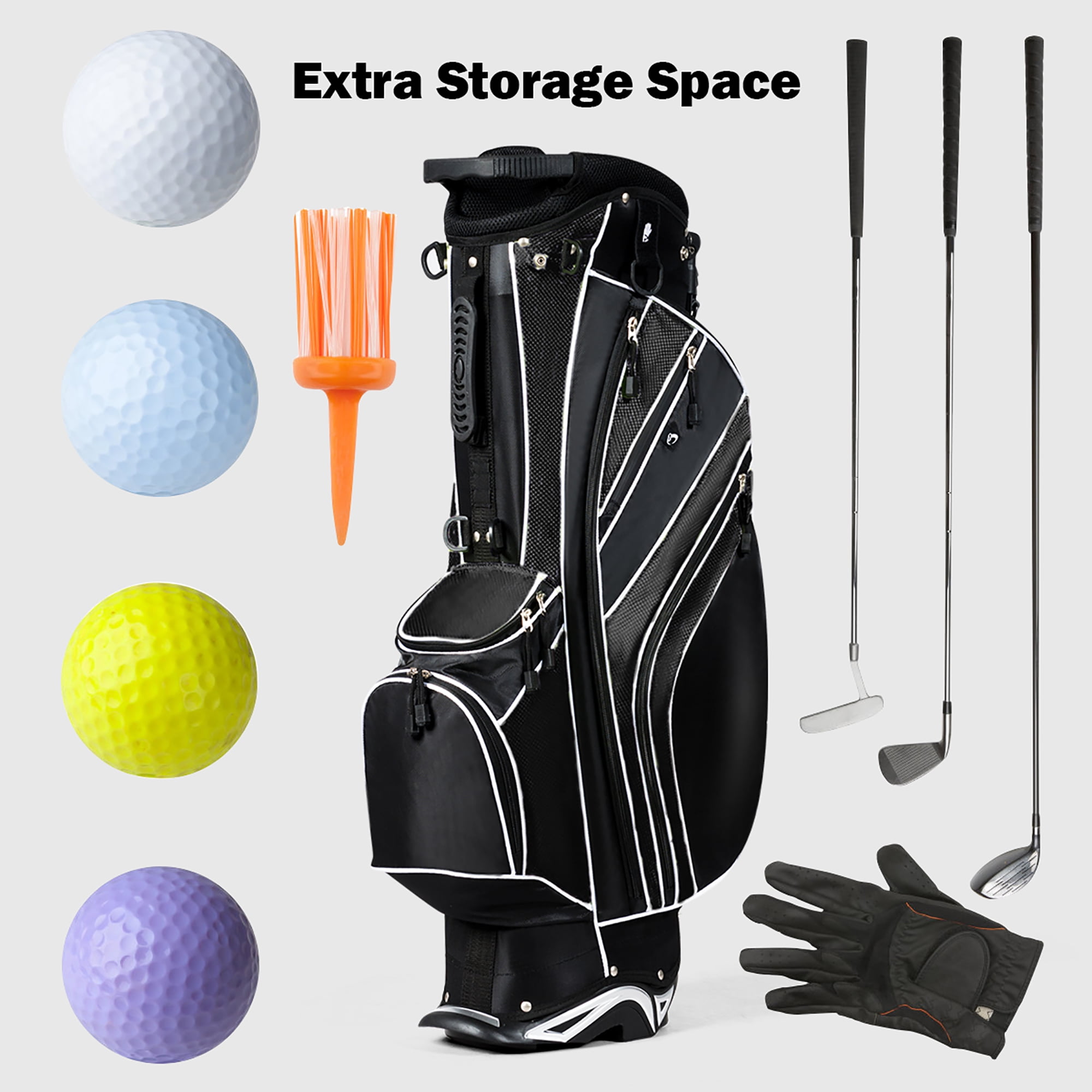 This Brand New Golf Stand Bag Is Perfect For Walking Golfers. It Comes With Shoulder Strap And Full Length Dividers To Protect Your Golf Sticks. The bag is extremely lightweight and easy to carry while you are walking. It comes equipped with a durable stand that has angled feet and a stand lock strap. 8 total pockets Offers Plenty Of Storage Pockets And Convenient Features making organization easy while the double strap provides extra comfort. Do not Hesitate To Buy It! Note:The Golf Sticks In The Pictures Are Not Included In The Package. Feature Ergonomically Designed 6 Way Divider To Divide Sticks Clearly Extra large golf ball pocket, hook and loop glove holder, Specially designed Umbrella Holder Padded, adjustable carry straps reduce pressure points in shoulders for superior carrying comfort 8 total pockets provide plenty of options for secure accessory, gear, and apparel storage Durable automatic stand with anti-slip foot pads for stand security on a variety of terrain Bag weighs approximately 6 lbs. Specification Color:Black Material:Polyester Fabric, Within The Three Fiber Supporting Tube, Aluminum Paint Foot Pipe Support, A Rubber Foot Pipe Bracket, PP Plastic Parts, Plastic Chassis Size Of Head Frame:11”x 8” Bag Length:32.5” Unit Weight:6lbs Package Includes:1 X Golf Stand Bag