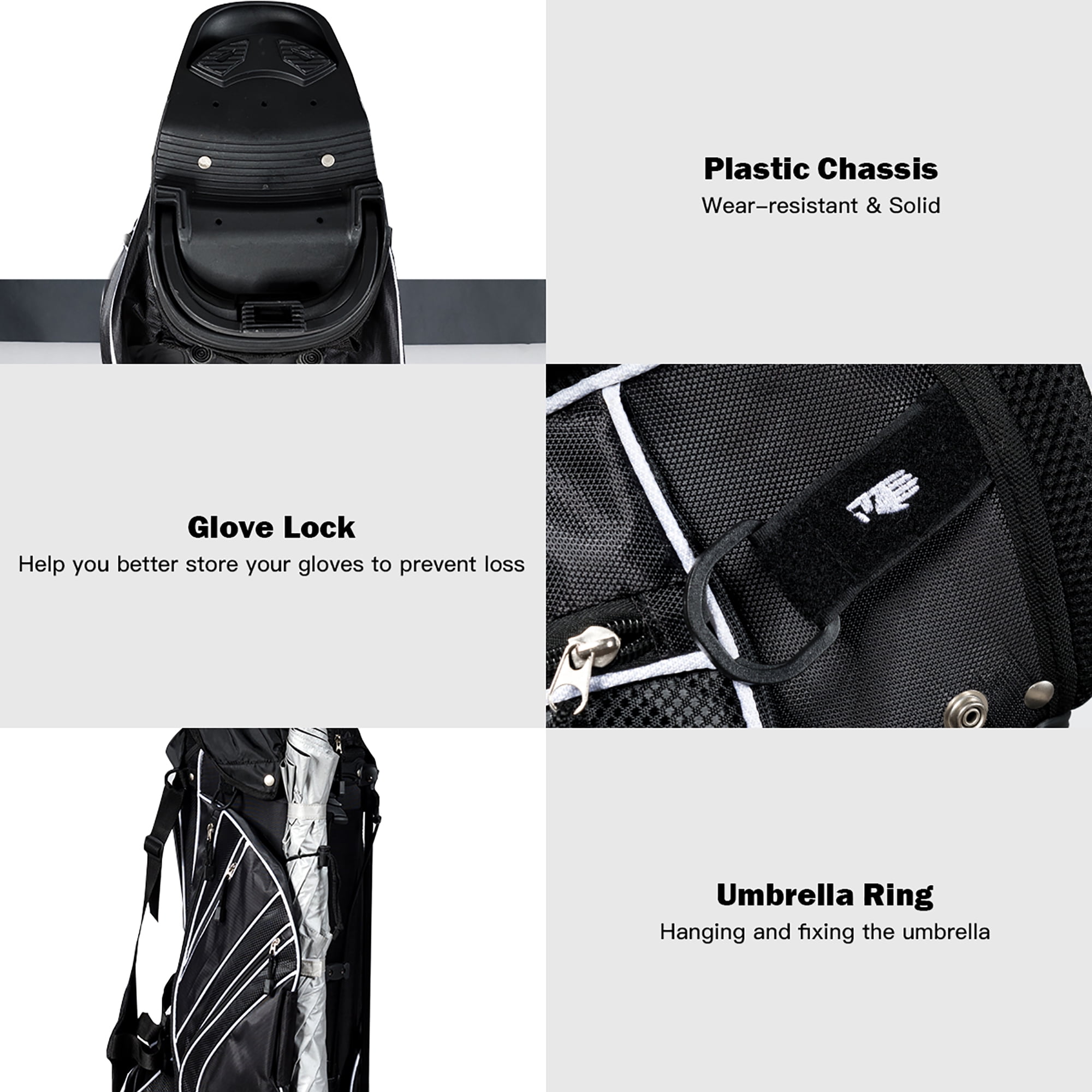 Water Resistance: Made of sturdy material, this sunday golf bag is water resistance to avoid any liquid to permeate. And its sturdiness can well up to the additional wear and tear while using it. It surely guarantees you a durable lifetime for its sturdy construction. Reasonable Capacity: Featuring light weight of only 6lbs and portability, golf stand bag 6 way dividers surprisingly offers you enough space to accommodate your golf clubs. There are 8 pockets on this bag to bring you additional storage space, which you can put various accessories in. Considerate Added Values: Backpack-style shoulder strap for extra comfort provides you a convenient handle on the side to quickly carry and go. And the special zipper design adds both practicability and aesthetics to this product. Specially designed umbrella holder offers you a good assistance. Premium Travel Helper: golf carry bag is quite great for traveling for it takes up very little space in a trailer, camper, or car trunk due to its compact body. You can just take it to your desired place effortlessly. And the bag can be stored neatly when you do not use it. Foot Support: With a mixed color and durable automatic stand with anti-slip foot, it can stand steadily and balanced as you want to release your hands. And it can also stand straight with a plastic chassis. A rubber foot pipe bracket can well prevent the scratch.