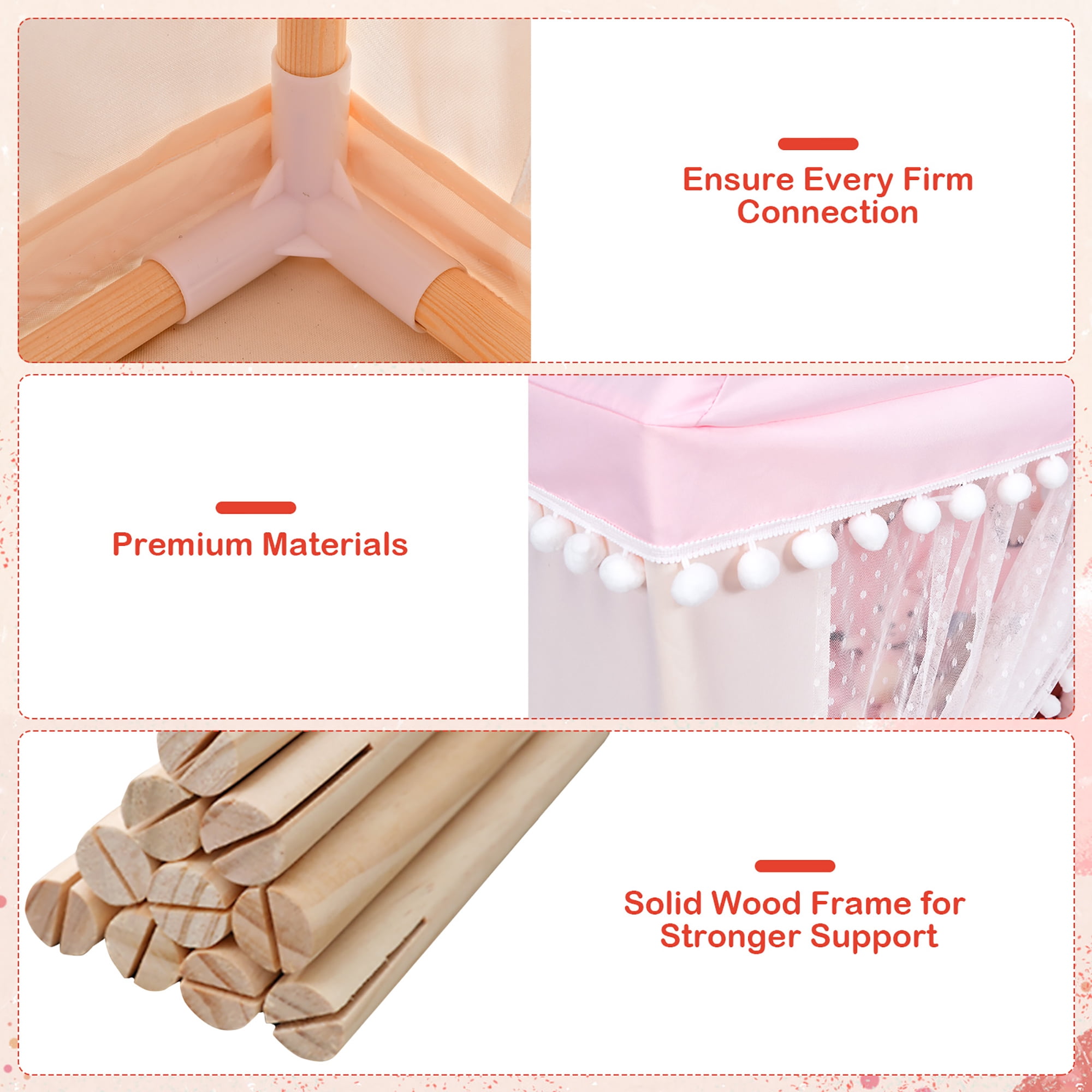 Spacious & Cozy Room: Perfectly sized space is large enough for both kids and parents to move freely in this playhouse. Equipped with a thick cotton mat and non-toxic & odorless oxford cloth, this kid’s house will provide a cozy corner for your kids and their friends. Stable Solid Wood Frame: Using solid wood as the frame, our product is super sturdy and just like a real house. Different from the traditional flimsy tent, this playhouse has stronger support for shape maintenance, which can guarantee safe in-house play for kids. Considerate Design: 2 breathable windows and a mesh curtain door will make the playhouse have good ventilation and visibility. The curtain can be separated and hung on two sides to keep the door open for quick access. And it is easy to assemble, disassemble and clean, saving you time and energy. Multipurpose Playhouse: It is very suitable to place this amazing kid’s little house at home, daycare center, backyard, park, etc. A relaxing space will be created for various activities, like reading books, playing chess and napping, increasing kids’ social intelligence and shortening the distance between kids and parents. Best Gift for Your Kids: This playhouse with an elegant and adorable appearance can easily catch kids’ eyes. Every kid should have his or her own secret base to develop innovation and independent thinking. It will undoubtedly be the perfect gift for your little prince or princess.