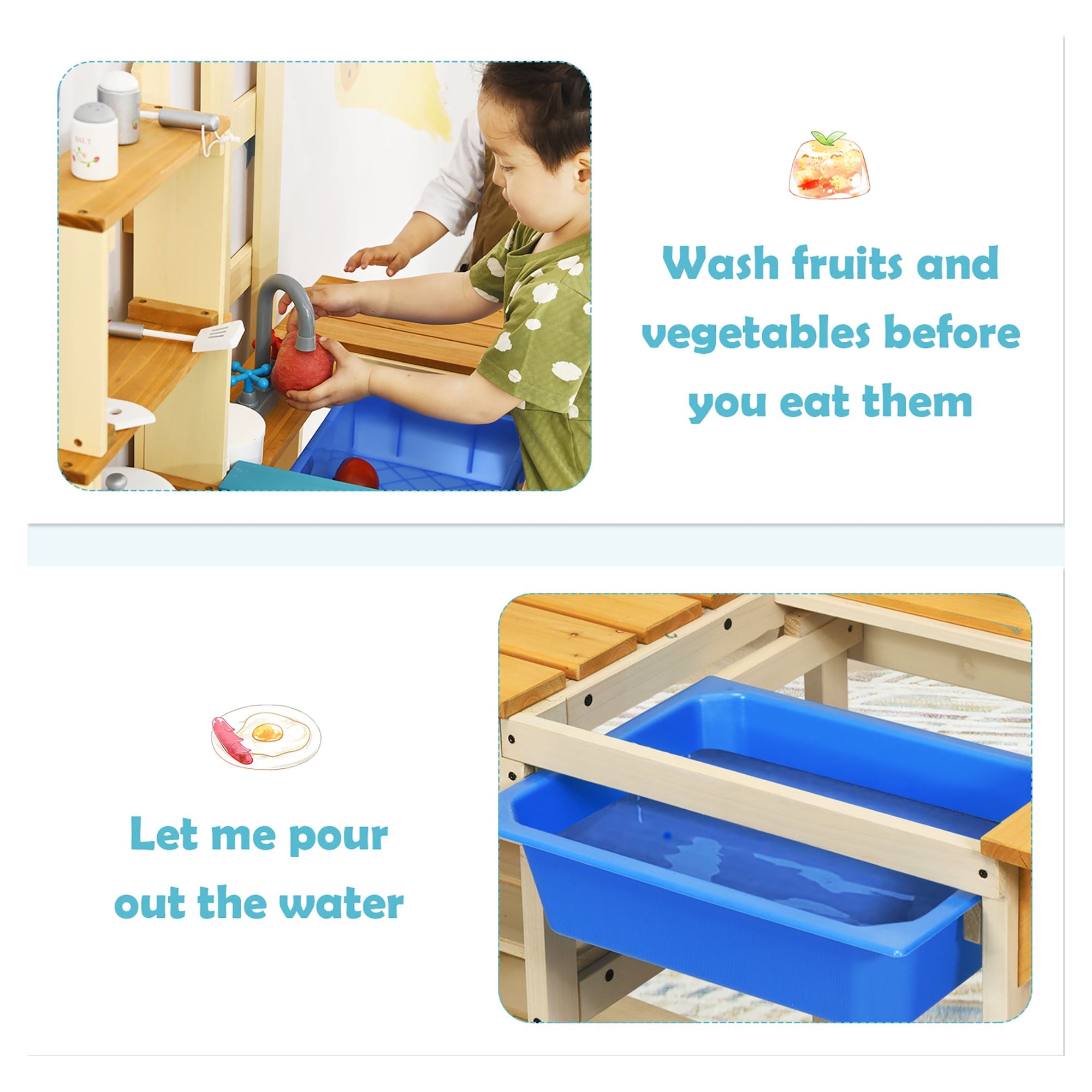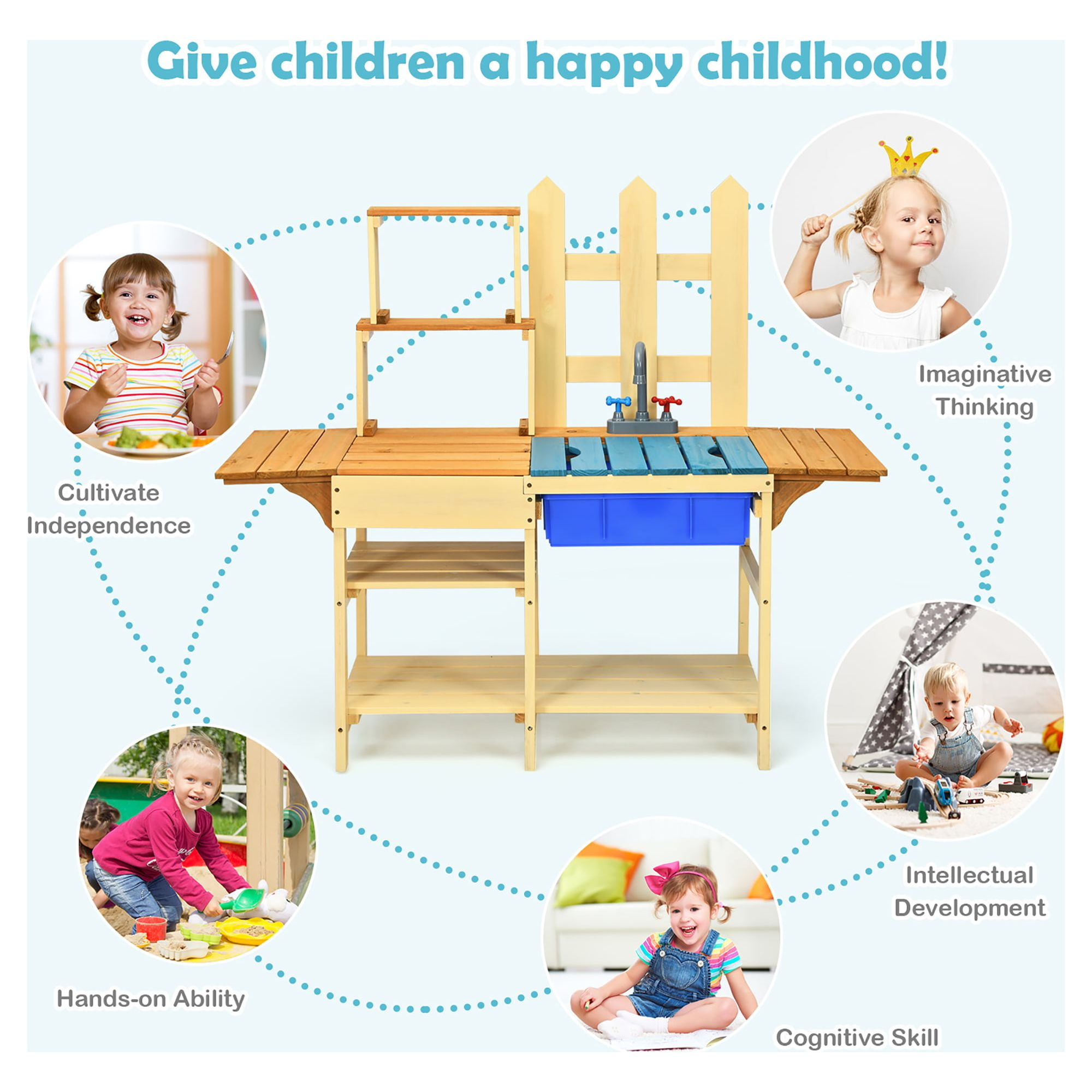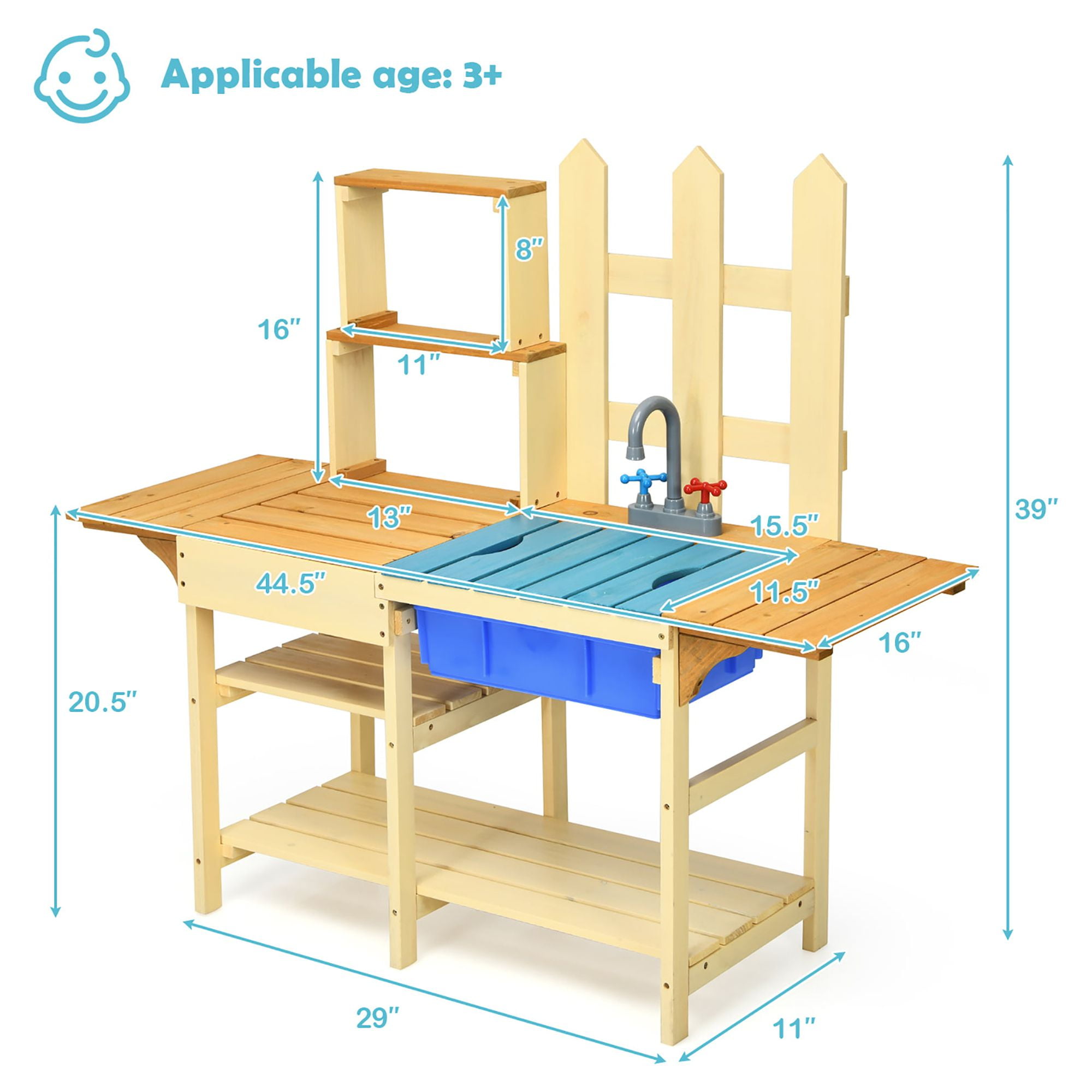 Our outdoor toddler kitchen is a good choice to accompany your child. Children always wants to learn the behavior of the parents in their childhood. Our kids kitchen can fully satisfy the child’s curiosity, allowing them to ”cook dishes”. Imagine stewing a mud soup, making a sand cake and decorating it with leaves in the garden. Your will give full play to his/her imagination, developing their intelligence. It not only promotes the feelings between parents and children, but also provides the baby with an opportunity for self-expression! Feature Made of natural fir wood to sturdiness and durability Includes plastic basin and faucet with smooth surface Let children experience the real cooking Ideal for outdoor use, like patio, garden, lawn, etc Perfect educational gift for children over 3 years old Cook with parents or friends to enhance relationship Open shelves for storing toy kitchen utensils Remove the blue board to start games Exert their imagination to make mud pies and puddle pops Easy to assemble under the direction of the instruction Specification Color: As Picture Shows Material: Fir Wood + Plastic Product Dimension: 44.5″ x 16″ x 39.5″ (L x W x H) Recommended Age: Over 3 years old Net Weight: 17 lbs Package Includes: 1 x Outdoor Toddler Kitchen 1 x User Guide
