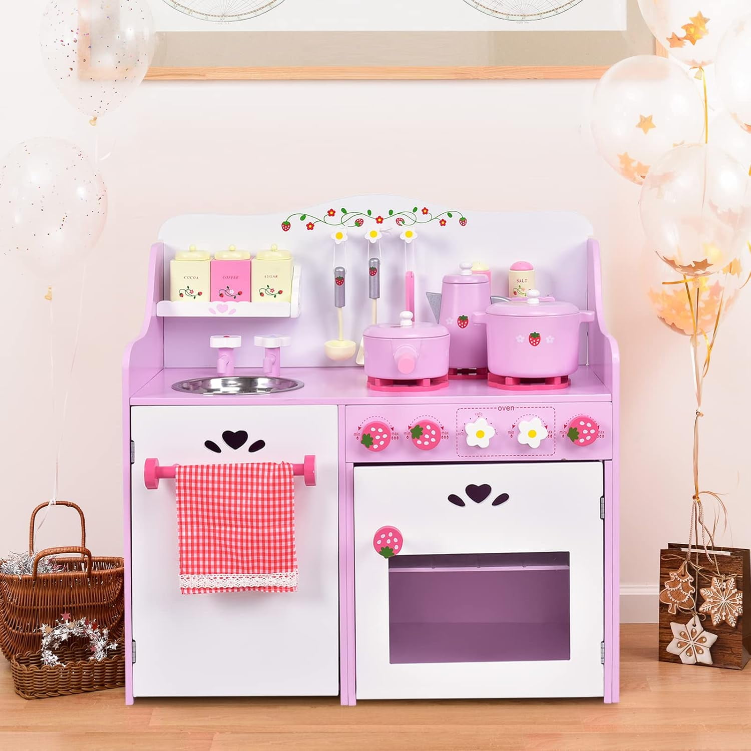 Costway Kids Wooden Play Set Kitchen Toy Strawberry Pretend Cooking Playset Toddler