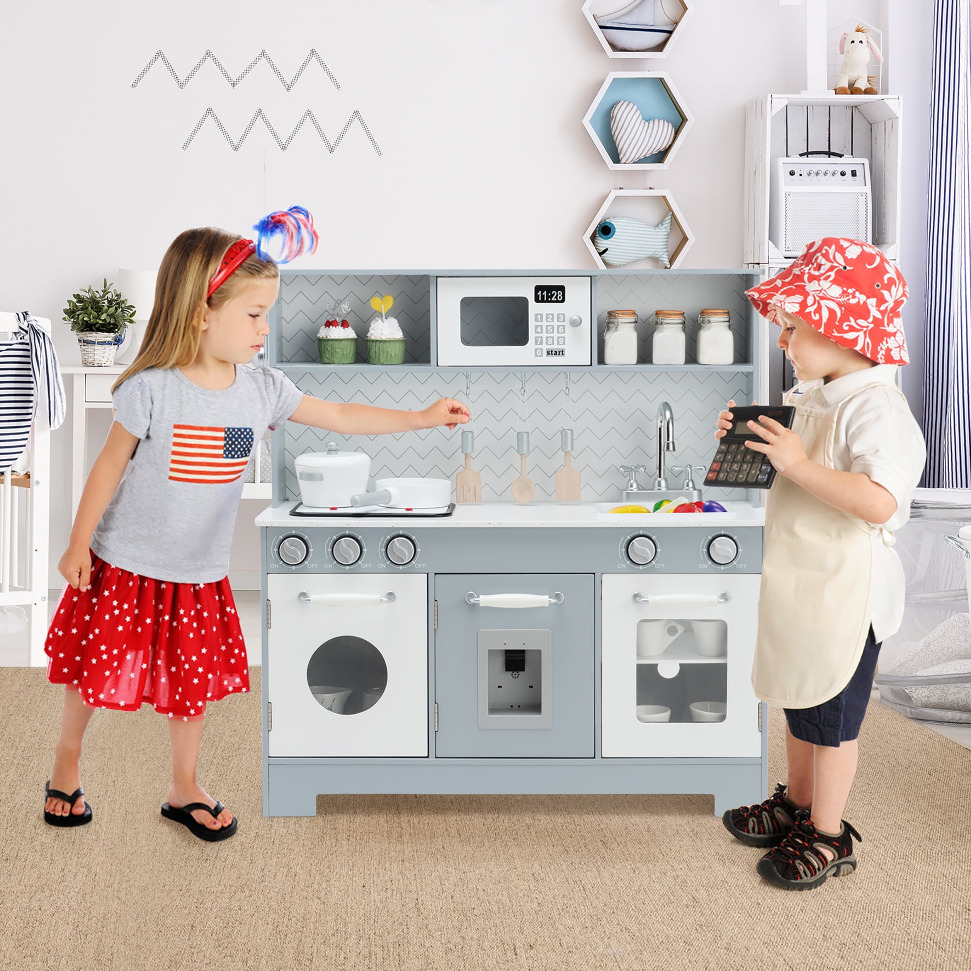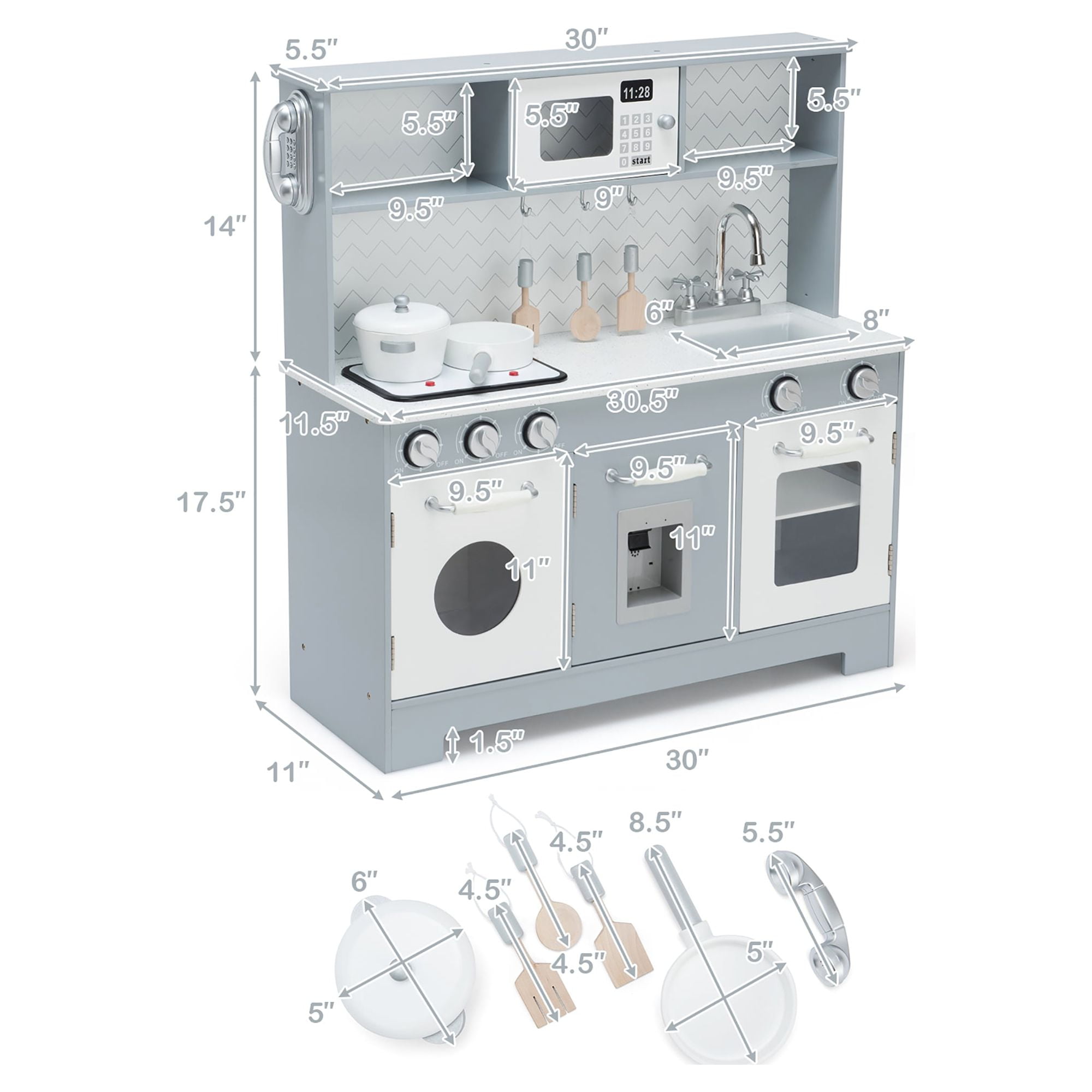 Have you been looking for an ideal gift to surprise your kids? If so, then this pretend play cooking set is the way to go! This play kitchen features a sink, a cordless phone, a simulated microwave, a stove with realistic light and sound, an oven and a water dispenser built-in light and sound. With realistic details and finishes, this kids kitchen playset encourages role play and lights up your little one’s imagination and creativity, helping to develop their hands-on ability, language expression and social skills. The durable MDF board construction is kid-safe and easy to wipe clean with a damp cloth for everyday messes. What are you waiting for? Have it and enjoy the cooking fun with your kids. Feature Realistic and stylish design draws kids’ attention in first sight Premium MDF board and PP plastic ensure stability and durability Help kids build good habits and enhance their social skills The oven and water dispenser are built-in realistic light and sound for fun Cheerful gift for both little girl and boys to brighten their daily life Removable sink and snap-on doors for easy cleanup Assembly Video: Specification Color: White and gray Material: MDF, PP Net Weight:28lbs Overall Dimension: 30”x 11”x 31.5” Suitable Age: Over 3 Years Old Package includes: 1 x Play Kitchen 1 x Pot 1 x Pan 3 x utensils 1 x Instruction