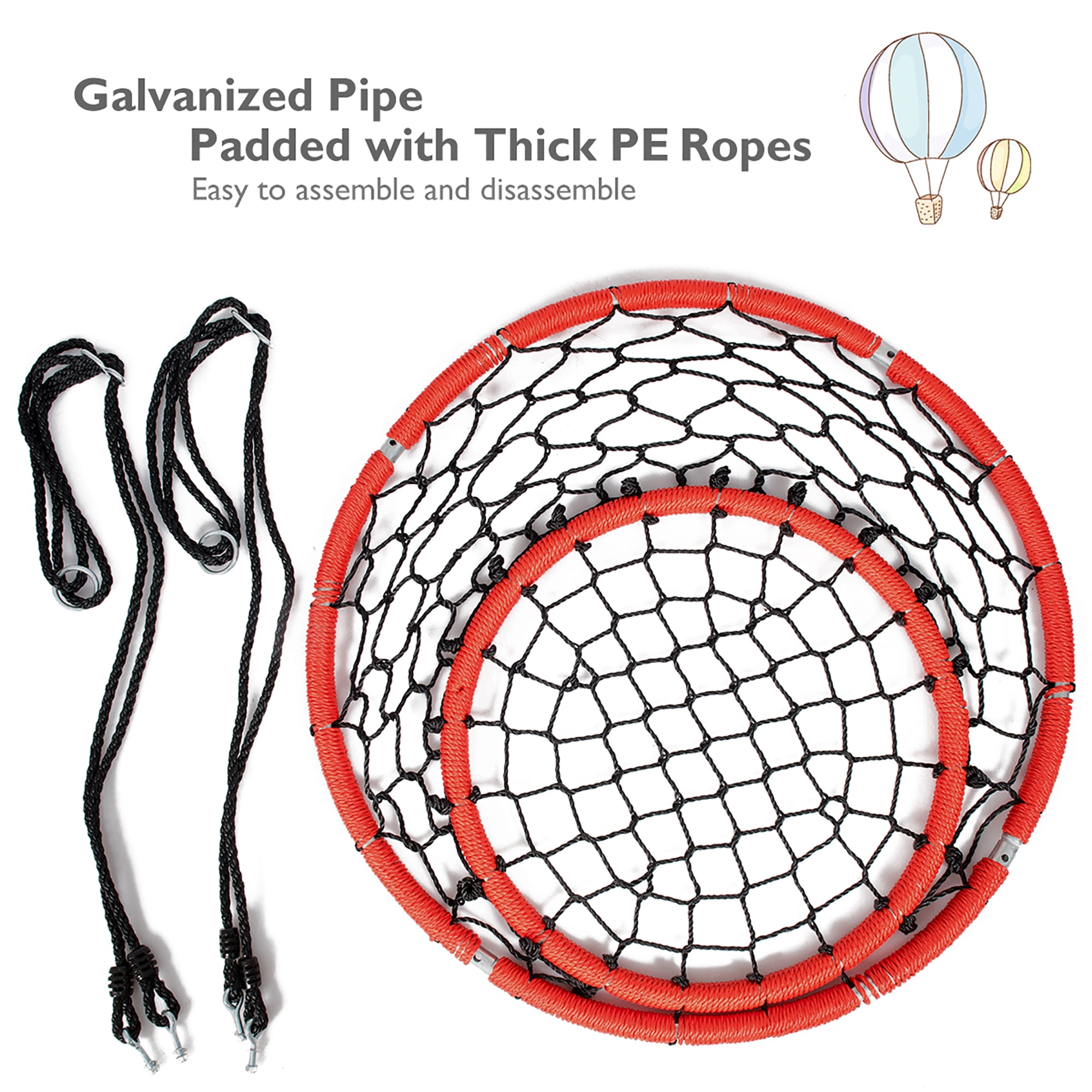 Year-round Fun for Kids: The web chair swing is popular among kids and adults! Its unique design and attractive appearance allow kids to swing excitedly throughout the year. There is no doubt that the entire family could harvest happiness from this product. Safe and Durable Materials: Considering the problems of safety, our web chair swing is made of sturdy galvanized pipes and thick ropes for long-term use. It has a strong load-bearing capacity and is spacious enough for kids to sit comfortably inside. Adjustable Height to Meet Your Needs: The rope is 63 inches in length, which can be adjusted as you like in the range from 40 inches to 63 inches. You can adjust the height and choose the most appropriate one for your kids to relax as the condition changes. Easy to Assemble and Use: If it’s complicated to put together and take apart a swing, it cannot be called as a good one. Rather, our swing was designed with simplicity. It’s universal and versatile design allows for quick and painless installation. Just take a moment to hang it from a large tree branch or attach it to a swing set. Multiple Functions for Various Situations: This round net chair swing can be used for many purposes, such as sitting, reading and playing. It will supply so much fun to both kids and parents! And it can be used in many places, such as backyard, park, tree, swing set and home.