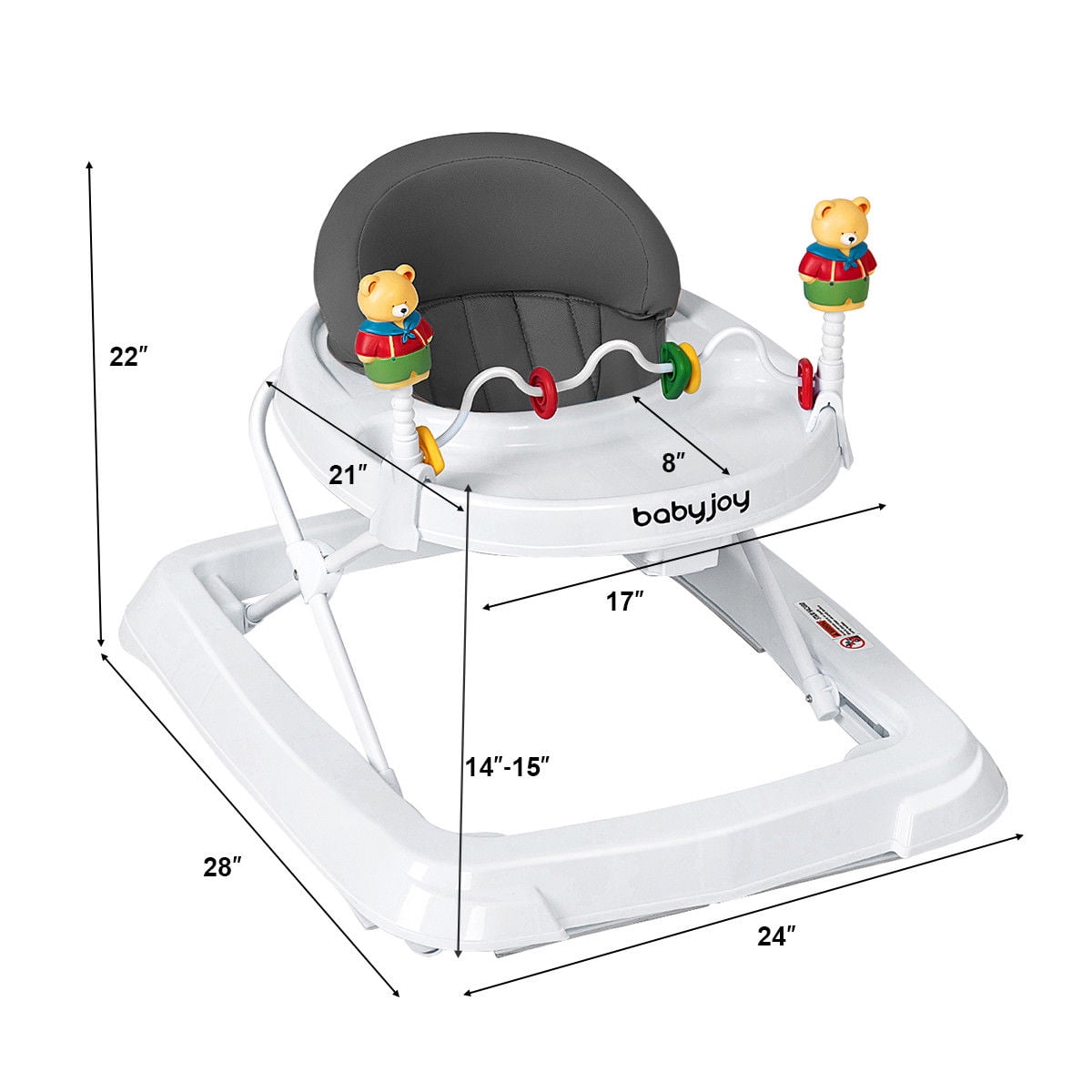 The baby walker is ready for your baby to buckle up and have fun while learning to walk! It features a loaded with fun and removable toy which makes your baby have hours of entertainment at their fingertips. Featuring a removable and washable seat pad, a removable toy, three different height adjustable seat and easy-fold frame design, the baby walker combines quality, convenience and fun for you and your little one. It is deserved to have one. Feature Comes with an removable toys for kids 3 adjustable height positions to grow with your child High seat back provides additional support and comfort Extra wide base for superior stability Fold flat for easier to transport or convenient storage when not in use 4 Sturdy wheels for easy moving A large plastic tray perfect for snack time or a favorite toy, easy to clean and sanitize Removable seat pad for easy washing Holds child up to 30 lbs Assembly Video: Specification Color: Grey Material: PP, TRP, Batting Dimensions: 24” x 28” x 22”(L x W x H) Net Weight: 8 lbs Bearable Capability: 30 lbs Package Includes: 1 x Baby Walker 1 x User Manual