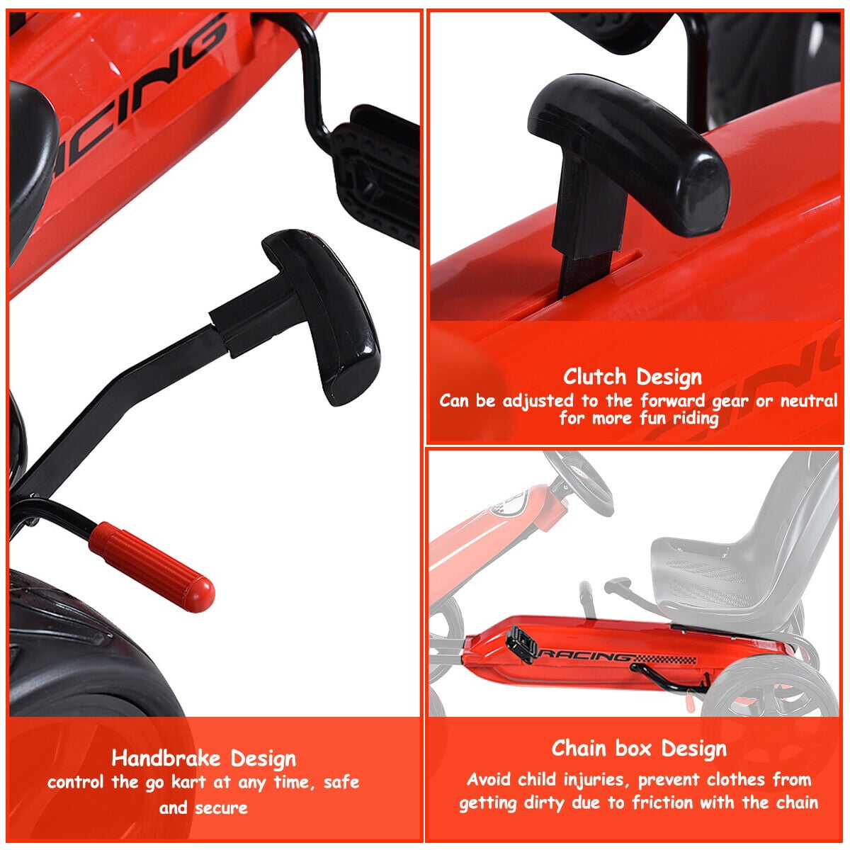 DURABLE &SAFE MATERIAL– Constructed by metal frame and Polypropylene plastic which is non-toxic, odorless, light- weighted for your kids to enjoy their happiness. They can play it no matter indoors OR outdoors, on a sunny day OR rainy day, this pedaling go-cart gives your child control over their own speed and is a fantastic way to keep them active and moving! RIDE IT AT EASE –This Go-kart offers effortless operation with no gears or batteries that require charging which perfectly avoid much issue from battery, wire connection, etc. Your kids could ride it by themselves and they can have an exercise in the meantime to keep healthy. the seat to a comfortable position with the growth of your kids. EASY OPERATION – Control the go kart by steering wheel to move forward/backward. Your kids can pull back the hand break next to the seat to stop this go kart. The gear lever is also included which is located on the middle of chain guard. Normally use the go kart when the gear lever pull forward. ADJUSTABLE SEAT – High backed bucket seat is a great support for your kids to lean on when they are exhausted and want to have a better rest. They can speed down at ease and control it freely. It also has TWO positions to be adjusted to fits your kids body. ANTISLIP STRIP ON THE WHEELS- EVA rubber wheels are in proper size and feature secure design for your kids to go many places like hard surface, on grass, ground which lessens the risk of hazard.