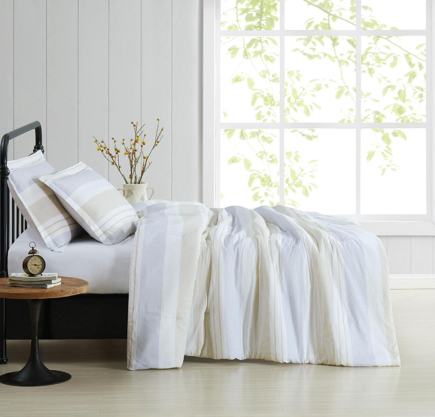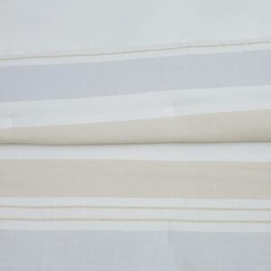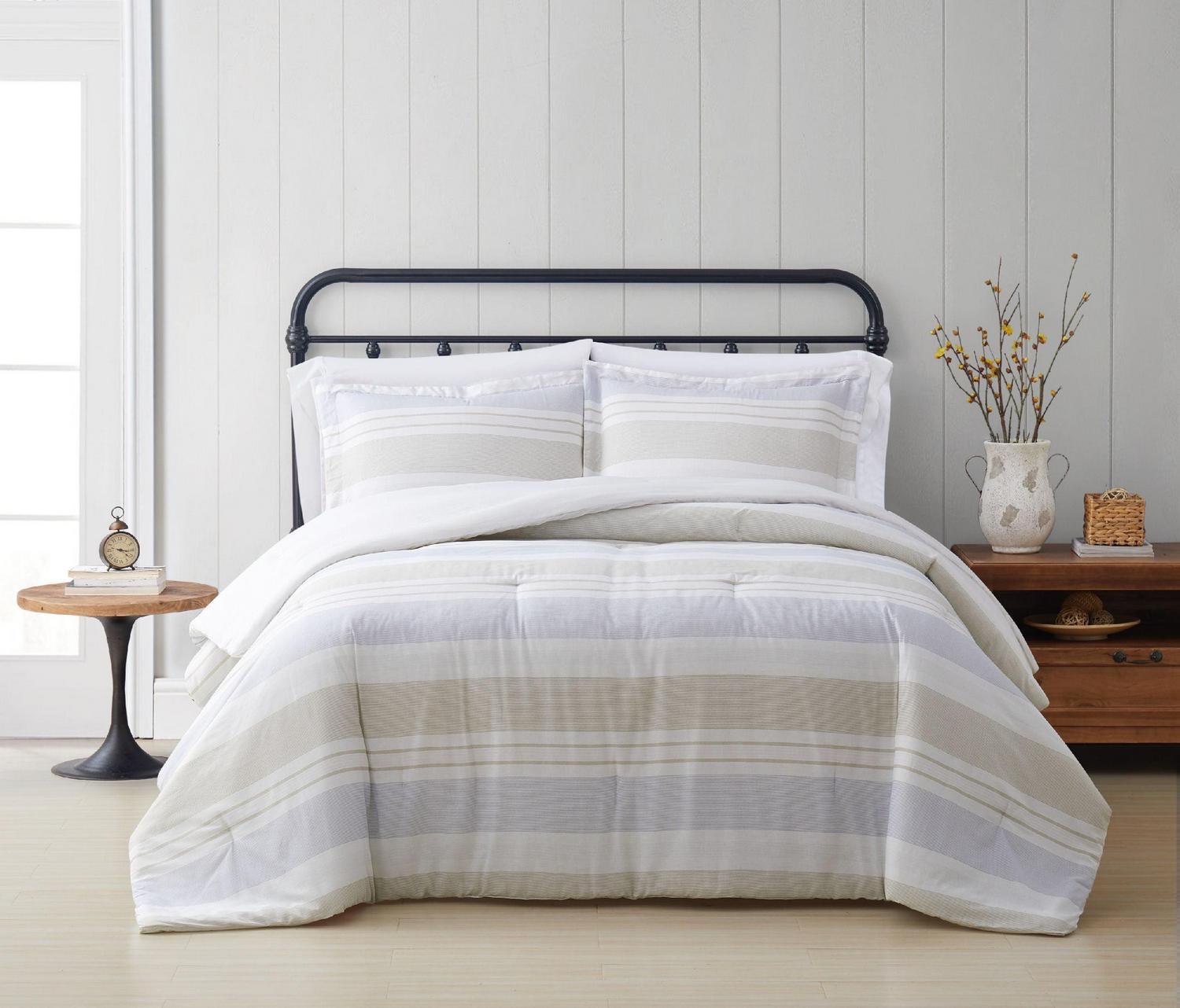 This horizontal stripe pattern is a classic and easily coordinated pattern for your home. Look closely and you will see that the individual stripes are made of smaller geometric and textured patterns to brings added depth to the pattern. Face cloth is 100% cotton fabric with a reverse in 100% microfiber polyester. The set includes pillow sham(s) to provide the complete look. Includes: one full/queen comforter 90×90 inches and two standard shams 20×26 inches. Face is 100% cotton, reversing to 100% microfiber. Filled with 100% polyester. This item is machine washable, but care should be taken to wash in appropriate size equipment to avoid damage. This item is imported from China.