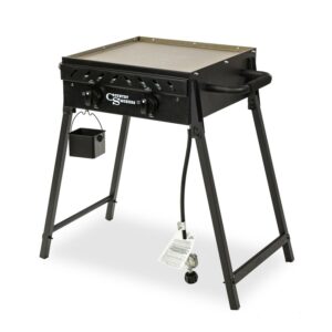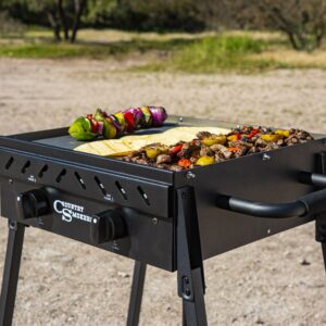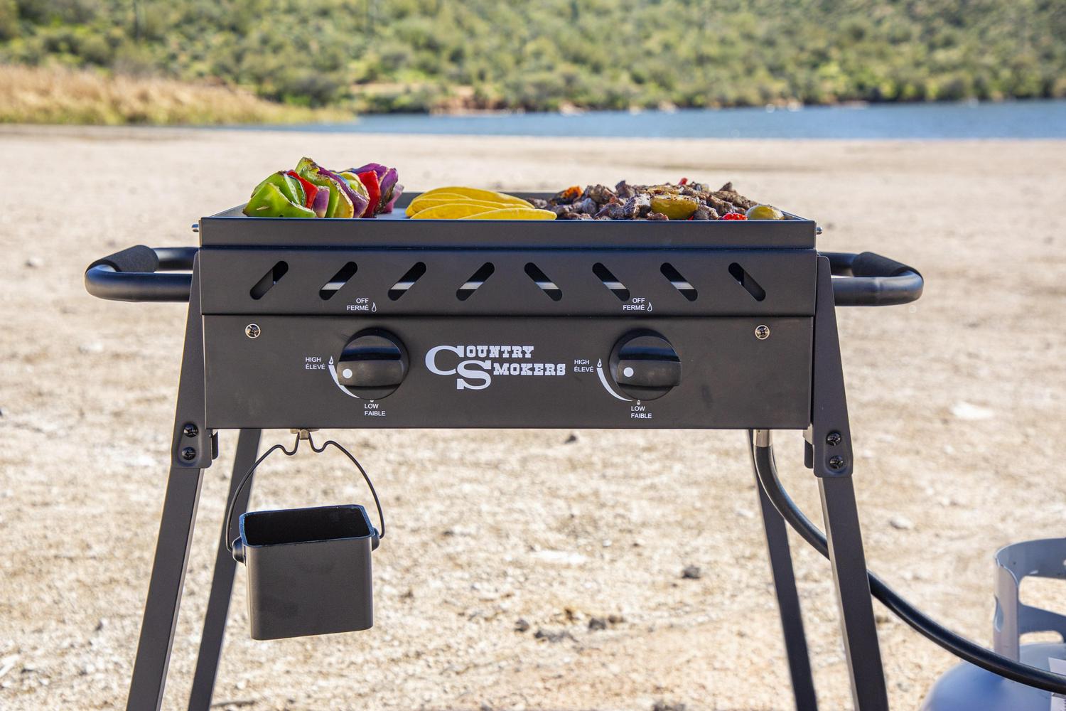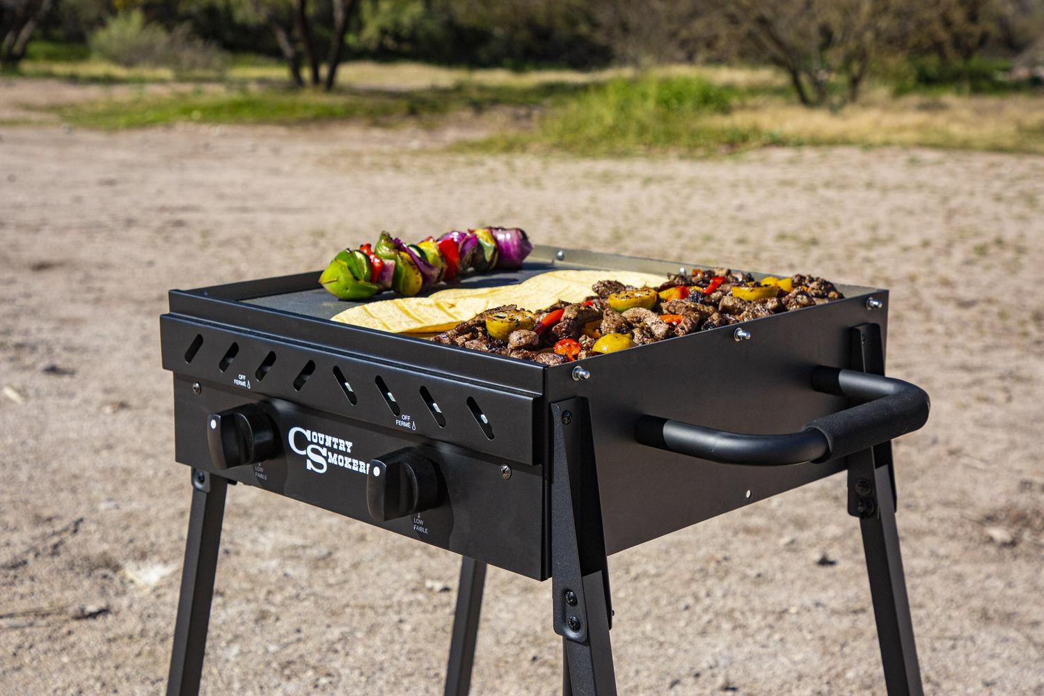 Bring your favorite recipes outdoors with the Horizon Series, plains 2-burner portable griddle by Country Smokers. This small and mighty griddle is built for any outdoor adventure. Griddle away in your backyard or whip up homemade meals during your next camping trip. The plains 2-burner griddle is a portable, lightweight cooking machine that can do it all. Made from heavy-gauge stainless steel, and offering 373 square inches of open griddle space, the Plains effortlessly allows you to craft mouthwatering recipes like fried biscuits, crispy pizza, or juicy grilled cheesesteak. The plains 2-burner portable griddle makes feeding a group of five-ish, fun, and easy to do. The steel griddle top comes pre-seasoned with organic plant-based oil, so it is ready to use right out of the box. Yes, it s that simple. With 22000 BTUs and two independent burners, the Plains Griddle lights quickly to offer powerful heat and control within seconds. Plus, no need to worry about temperature swings every time the wind blows. Thanks to the Plains extra-long protective sides, you can protect your burners and maintain heat – even when you re cooking in the wind or cold. So, gather your friends and family around for a savory meal with the versatile, lightweight, and portable Plains 2-Burner Griddle by Country Smokers.