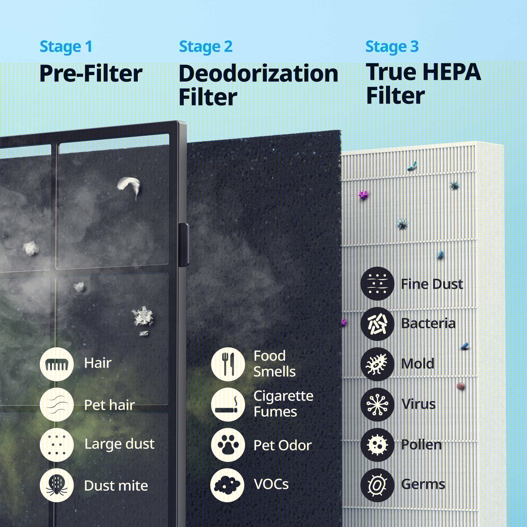 – 4Stage Filtration System (Pre-filter, Deodorization filter, True HEPA filter, Vital Ion) captures and reduces up to 99. 97% of particles 0. 3 microns in the air, including pollen, pollutants and other allergens. It also reduces volatile organic compounds and reduces odor.