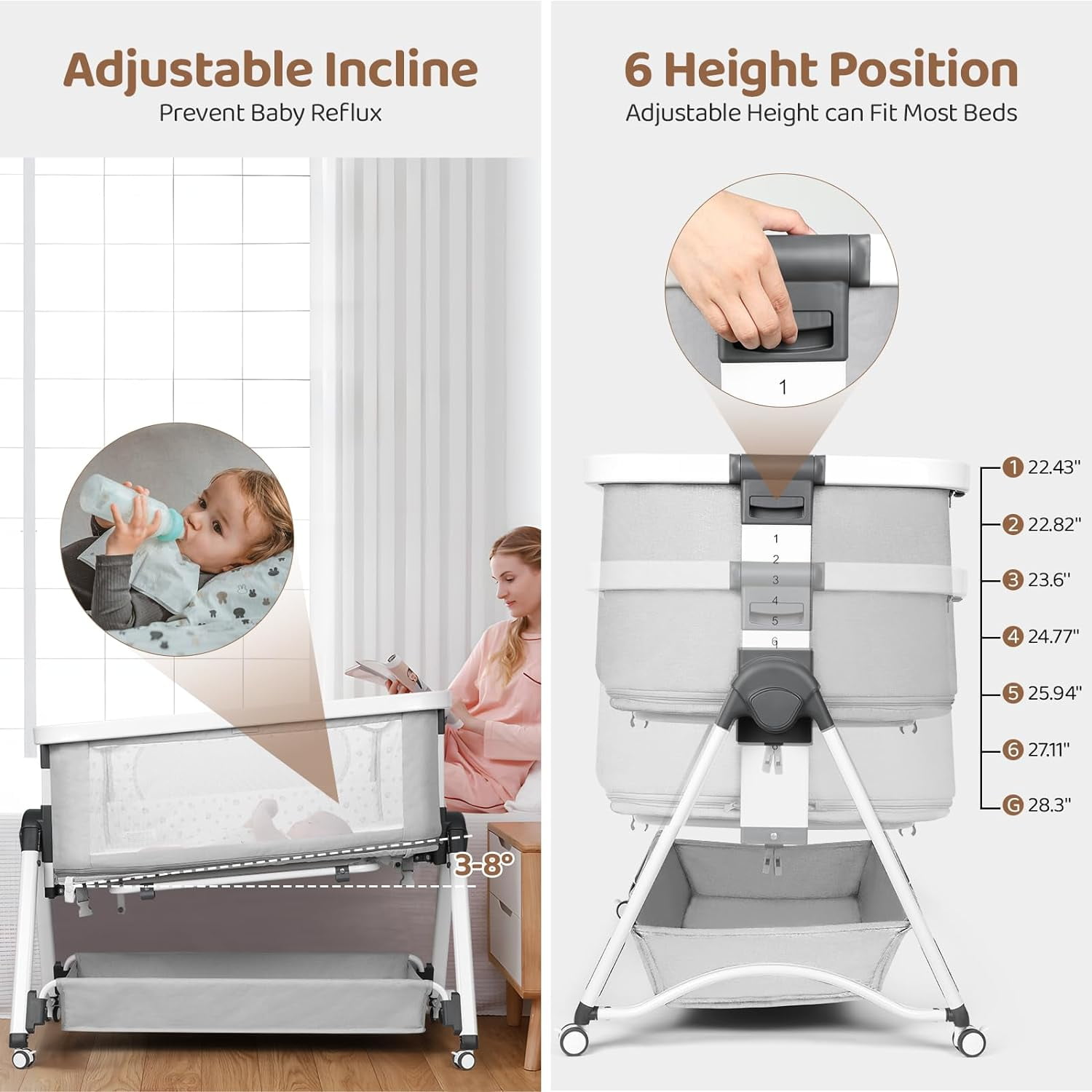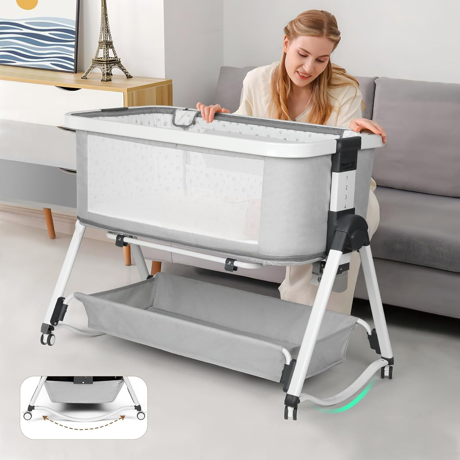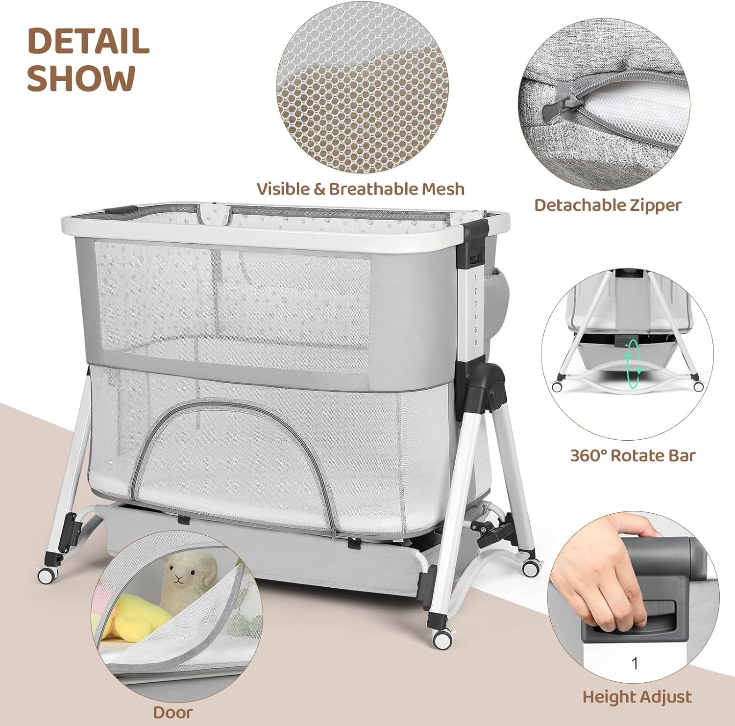 MULTIPLE FUNCTION – Cowiewie baby bassinet can be used as a baby cradle, baby playpen, or bedside sleeper attached to an adult bed. SAFE – Our bassinet inclined angle is 3-8° which is less than 10° as CPSC stated. This product is designed with a firm, flat sleeping surface that meets and/or exceeds all U.S. Consumer Products Safety Commission safety standards. ADJUST HEIGHT- 6 height positions (min 22”, max 27”) suit for most adults’ beds, allow breastfeeding easier. BABY CRADLE – Flip the bottom rocker of the bassinet can be converted into a baby cradle, better for soothing your baby to sleep. All the wheels can be detached. ULTRA STRONG – The frame of our baby crib is made from strong, sturdy aluminum, with a reinforced frame beneath the bassinet, it will not tip or get knocked over. COMFORT – Made of soft, skin-friendly fabric with breathable mesh on both sides, makes baby feel breathable and comfortable. Color: Light Gray; Gender: Unisex