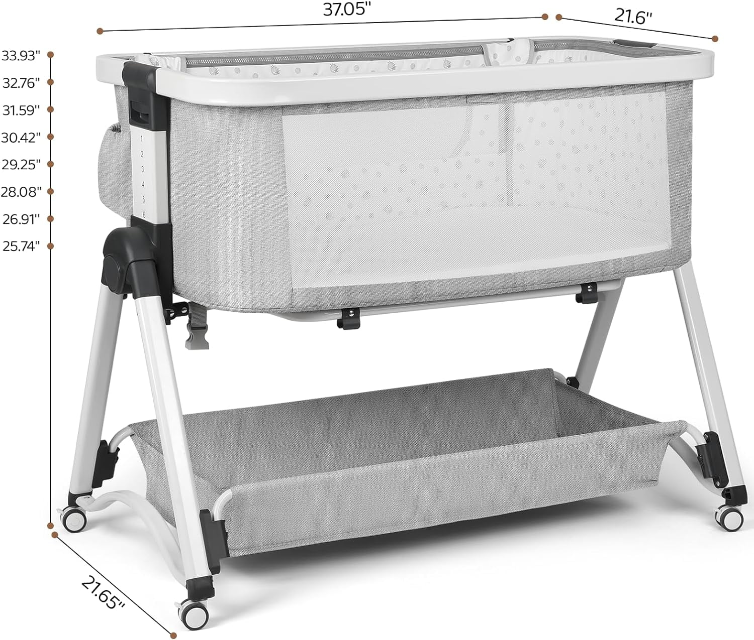 MULTIPLE FUNCTION – Cowiewie bassinet can be used as a beside crib & Travel Cot & Swingable Bassinet for baby or a bedside sleeper connected to an adult bed, Manufactured with soft skin-friendly fabric with both side breathable mesh design for make it easier for mom to take care of baby. SAFE – Our bassinet inclined angle is 3-8° which is less than 10° as CPSC stated. This product is designed with a firm, flat sleeping surface that meets and/or exceeds all U.S. Consumer Products Safety Commission safety standards. ADJUSTABLE BABY BASSINET- 6 height levels of our baby bassinet, allow breastfeeding easier, while fitting for all parents. Besides, Bassinets is removable with zipper, which keeps baby from curious pets while creating a cozy sleep space. BABY CRADLE MODE – Upgraded baby bassinet! Filp the bottom rocker of the bassinet can be converted into a baby cradle, better to soothe your baby to sleep. All the wheels can be detached. ULTRA-STRONG BABY CRIB W/ STORAGE – The frame of our baby crib is made from strong, sturdy aluminum, with a reinforced frame beneath the bassinet, it will not tip or get knocked over. Besides, there is a storage basket can be hanging on the frame, make it easier to access baby’s essential things, like toys, diaper, baby bottle, etc. SAFE & COMFORT – Suitable from newborn to toddlers, this bedside bassinet is crafted with sturdy iron and aluminum frame, the wheels and the brakes system allow bassinet to move around easily or stand stably. It comes with a handy carry bag so you can take, with you on days out visiting friends and family, or on any weekend away. Color: Light Gray; Gender: Unisex