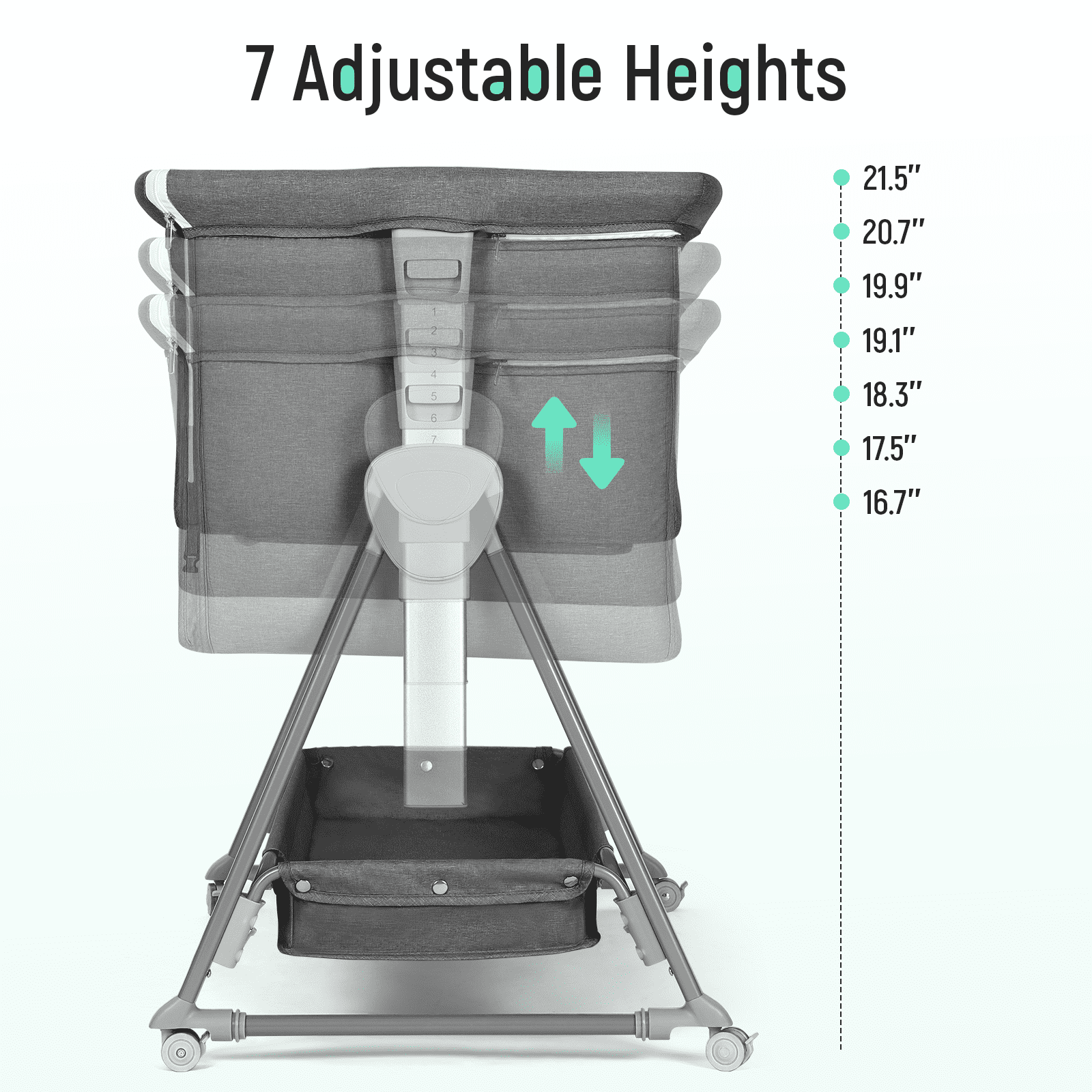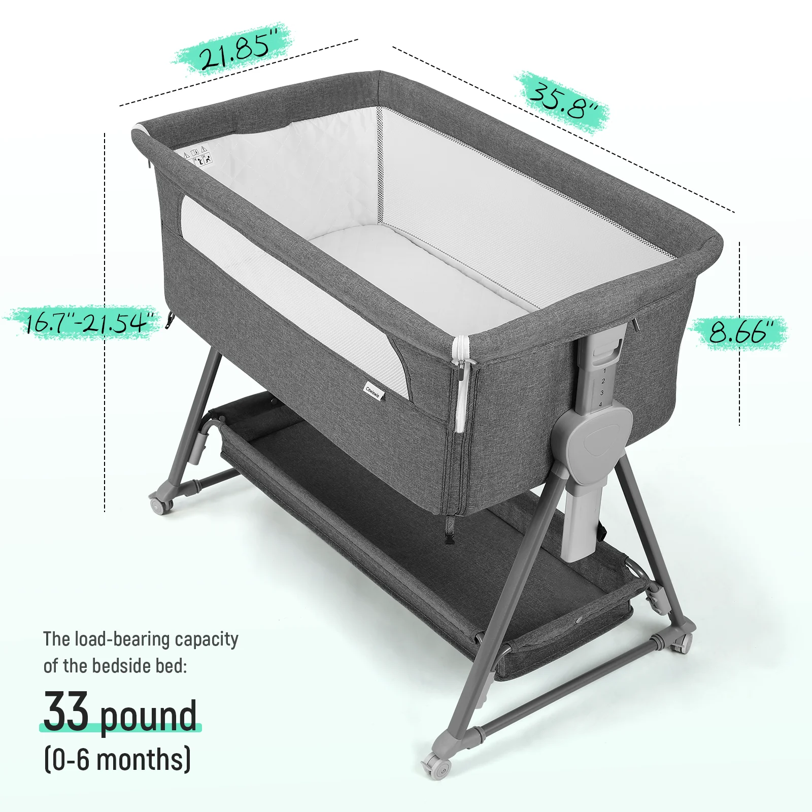 Specification: 1) Brand: Cowiewie 2) Color: Gray 3) Material: Aluminum Alloy + Linen + Mesh 4) Dimension: 36.6” x 22” x 32.3” (L x W x H) 5) Adjustable Height: 16.7in/ 17.5in/ 18.3in/ 19.1in / 19.9in/ 20.7in/ 21.5in off the groud 6) Mattress Dimension: 32.5” x 19” x 1.2” (L x W x H) 7) Product Weight: 17.5 lbs 8) Max imum Weight: 33 lbs 9) Applicable Age: 0-6 Months 10) Gender: Unisex 11) Package includes: – 1 x Bedside Crib – 1 x Large storage basket – 1 x Mattress – 1 x 2.3m Safety Strap – 1 x Instruction Bassinet inclined angle is 3-8° which is less than 10° as CPSC stated. This product is designed with a firm, flat sleeping surface that meets and/or exceeds all U.S. Consumer Products Safety Commission safety standards. Features: – Baby’s Small Private Space: Perfect For Any Incoming Newborn – Material Safety: Detachable washing nylon cloth + peach skin; sponge and wood board – Safety and Firmness: Strong and rust-resistant aluminum alloy frame ensures long service life. – More Reasonable Structure Size: Firm triangular structure and non-slip foot pads ensure high stability and baby’s safety. – Independent Space: It’s also convenient for mothers to take care of the baby at night. NOTE: The Storage Basket MUST be installed: the purpose is to strengthen the stability of the crib