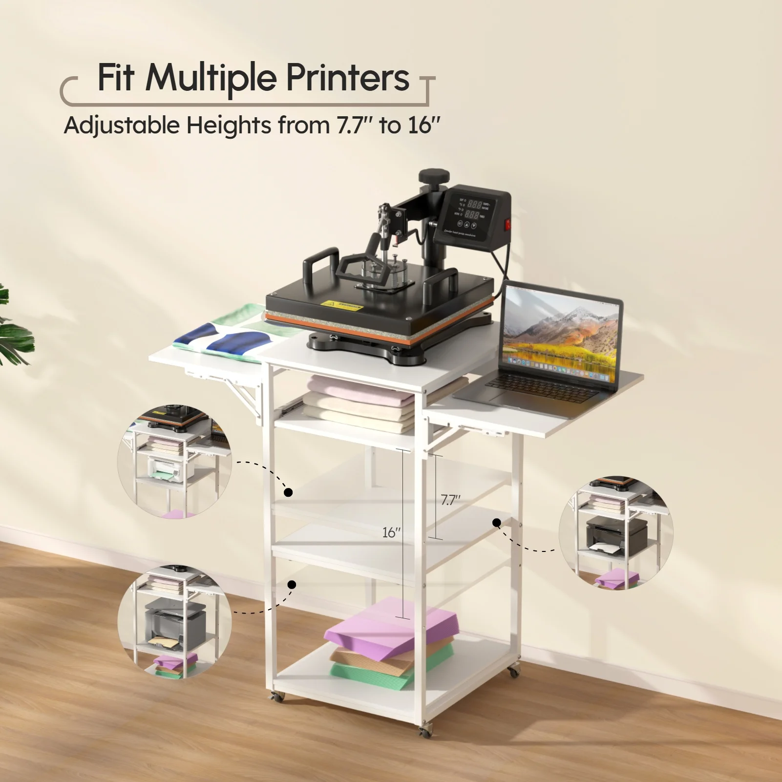 【Pull-Out & Height-Adjustable】The second shelf is a bonus pull-out tray. It can not only store some clothes either unprocessed or in cooling, but also prevent clothing from slipping off during partial heat pressing, more efficient and effortless when applying vinyl or DTF transfers. The third shelf is liftable, offering multiple height adjustments from 7.7″ to 16″ to accommodate various printers and ensure maximum space utilisation 【4 Tier Storage with Foldable Sides】The side panels can collapse and hide so you can pull them up to work on and put them away for storage. The top fits a 15×15 heat press and the bottom shelf stores additional heat press accessories and materials. This heat press cart provides plenty of organization and storage for your sublimation projects, it can hold a sublimation printer, cutter, heat press, sublimation paper and more at your will 【Super Sturdy Caster Wheels】Equipped with four high load-bearing office caster wheels, two of which have locks so it can lock in place or remain unlocked to roll around as you please. If you lack a dedicated space to do heat pressing, this is a great solution to store and use. You can roll it to a corner for storage and easily move it to your desired work area. Additionally, it easy to clean without drag it around 【Solid Construction & Reliable Material】Crafted from high-quality wood and thickened metal frame, with water-resistant and scratch-resistant surface, strong and sturdy, lasting for years. The classic and elegant design complements any craft room furniture. Comes with clear paper instructions and all tools and parts are numbered for hassle-free installation. Please don’t hesitate to contact us with any questions for an immediate response