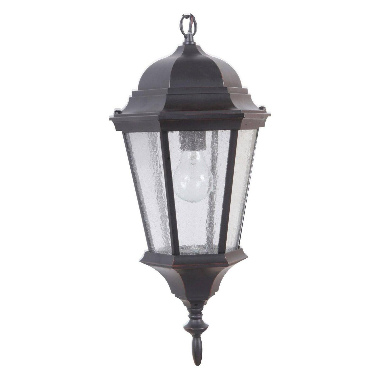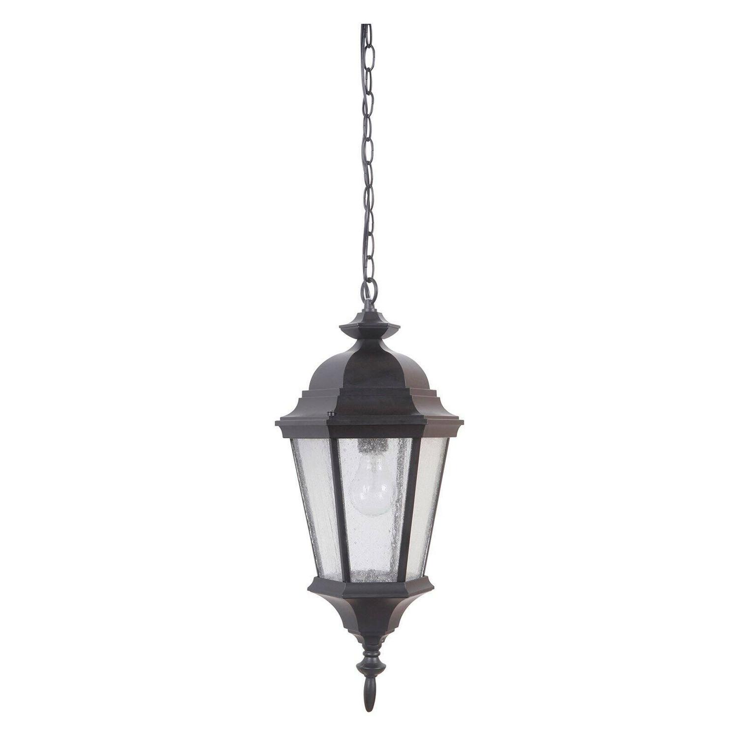 The Craftmade Chadwick Z2911 Outdoor Pendant Light is one of those classic pieces that never seems to go out of style. This hanging lantern is inspired by the hanging lanterns of the Victorian era, with a six-sided design and decorative finial at the bottom. The body is made from sand-cast aluminum with a UV-resistant finish that’s offered in a variety of colors. Six panels of seeded glass add a vintage style to the light that radiates from the single 100-watt bulb within. A matching hanging chain is included, and we recommend that you get the assistance of licensed electrician to perform the installation.