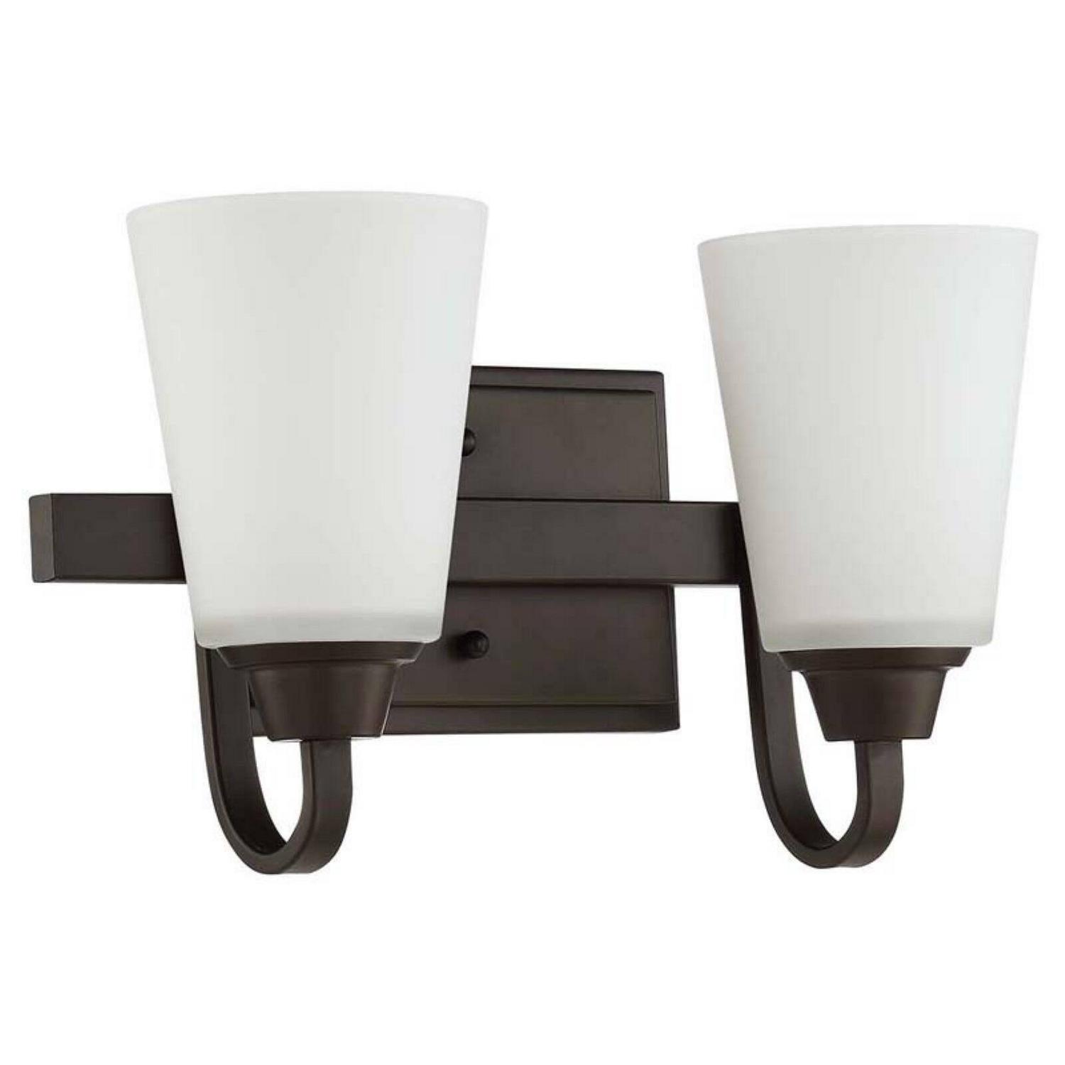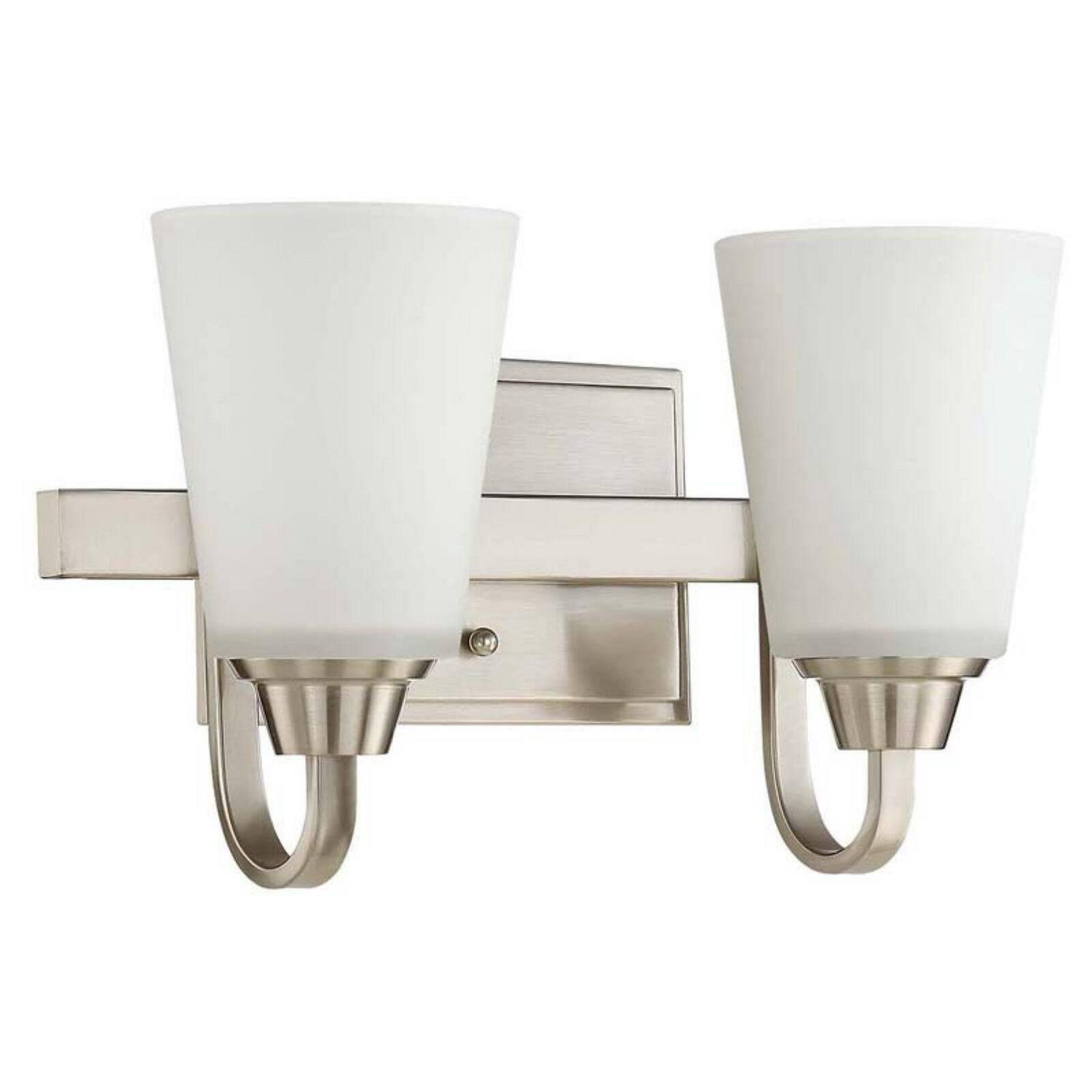 The Craftmade Grace 41902 2 Light Vanity ushers in some new lighting into your modern bathroom or hallway. This wall-mounted vanity light is constructed from sturdy metal with a square backing plate. Two curved, flattened arms support the bulbs and tapered frosted glass shades. The vanity light is designed for 60W incandescent bulbs. Bulbs are not provided. Choose from the available finishes to get the best style for your space.