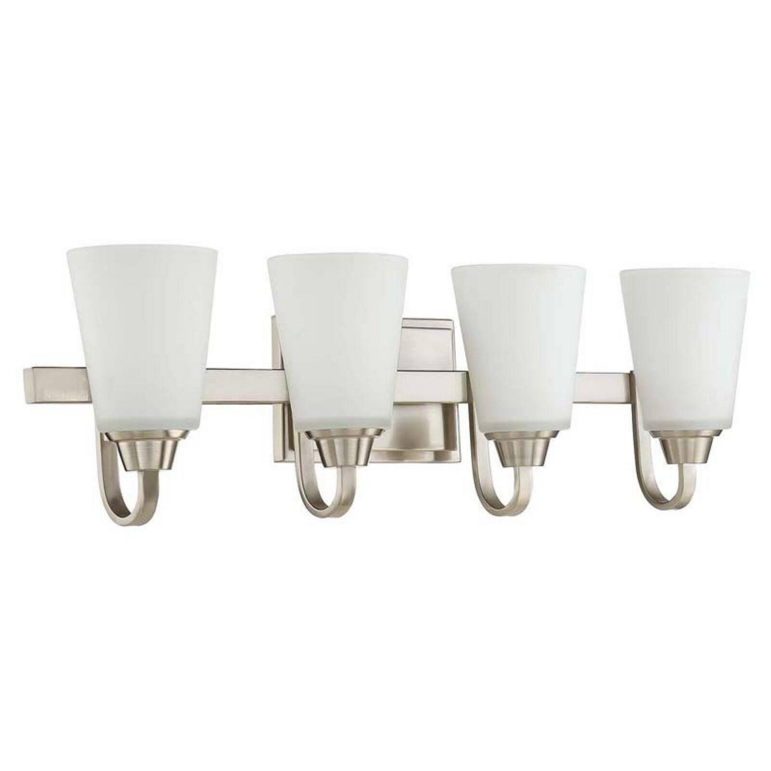 Update your bathroom to include some sleek, new lighting with the Craftmade Grace 41904 4 Light Vanity Light. This vanity light mounts easily to your wall and features four bulb housings at the end of curved arms. Thick metal constructs the piece, which boasts a rectangular backing plate. Each bulb features its own tapered frosted glass shade. Select your desired finish from the available options. This fixture requires 60W incandescent bulbs, the bulbs are not included.