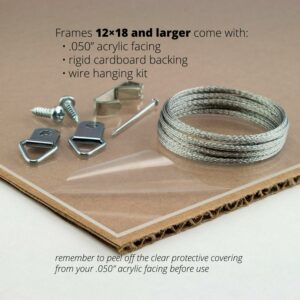 – Frame includes: clear acrylic facing, rigid cardboard backing and wire hanging hardware kit (some assembly required)