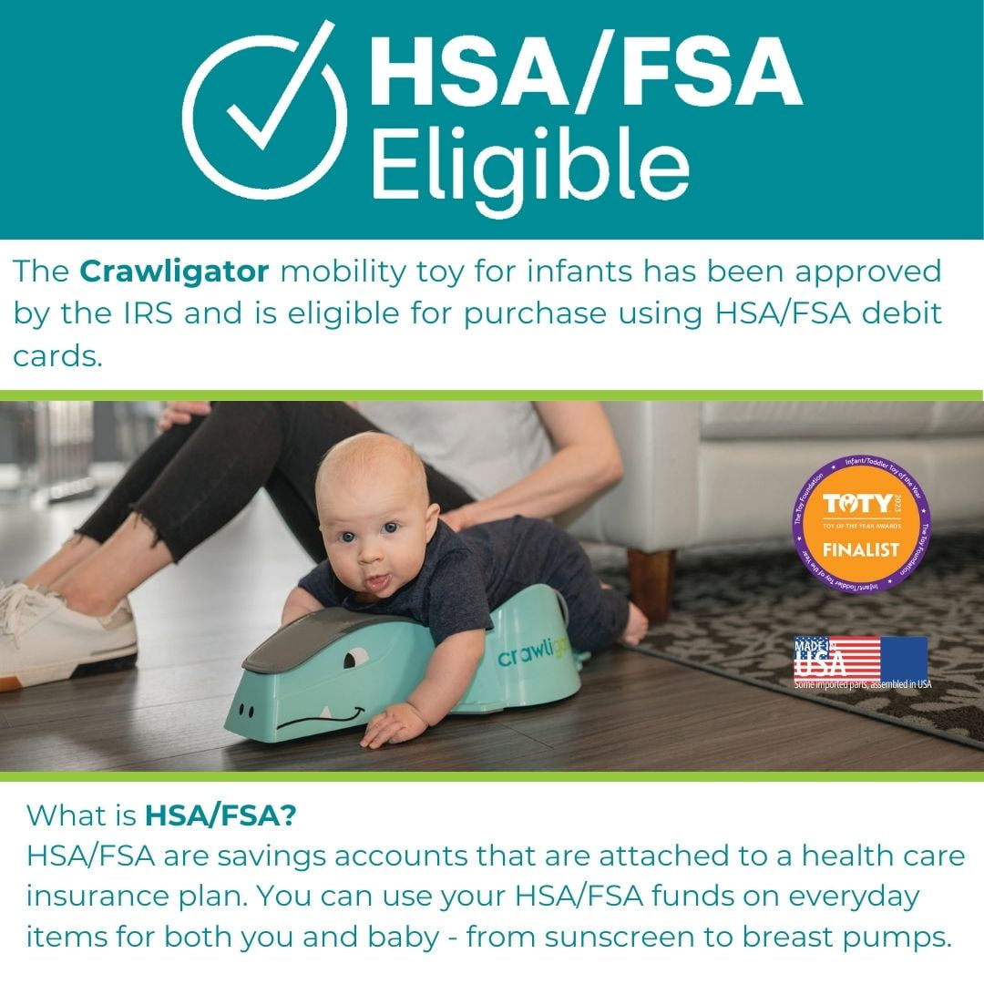 PROVIDES MOBILITY: With high quality caster wheels this toy rolls across a hard floor surface. Does not roll on carpet, although tummy time benefits the same.HSA/FSA Eligible,Authenticated: Early Childhood Product, DEVELOPS GROSS MOTOR SKILLS: This skill development toy provides the ability to move the arms and legs to reach, push and kick. ERGONOMIC DESIGN: Enhances the comfort and positioning of the child encouraging them to enjoy more time on their tummy., STIMULATES: Sensory and cognitive development and hand-eye coordination.,HSA/FSA Eligible