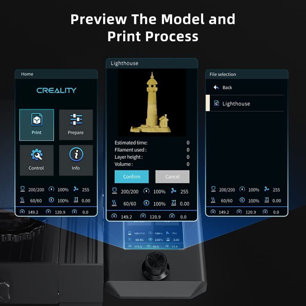 Auto-bed leveling Removable PC spring sheet platform All-metal extruder Screen preview of the 3D model Easy assemble Specification Molding Tech: FDM Build Volume: 220*220*250mm Machine Dimension: 438*424*472mm Package Dimension: 520*505*280mm Net Weight: 7.8Kg Gross Weight: 9.8Kg Printing Speed: maximum 120mm/s Layer Height: 0.05-0.35mm Printing Precision: ±0.1mm Nozzle Quantity: 1 Nozzle Diameter: 0.4Mm(Standard) Nozzle Temperature: Up To 260℃ Heatbed Temperature: Up To 100℃ Build Surface: Pc Spring Steel Magnetic Built Plate Extruder: Bowden Extruder Extrusionmaterial: Full-Metal Leveling Mold: CR-Touch Auto Leveling Display: 4.3″Color Knob Screen Mainboard: 32-Bit Silent Mainboard Resume Printing: Yes Rated Voltage: 100-120V,200-400V~,50/60Hz Rated Power: 350W Slicing Software: Creality Slicer/Cura/Simplify3D Data Transmission Method: Micro USB/TF Card 3D File Format: STL/OBJ/AMF Support Filament: PLA/PETG/ABS Support Language: Chinese/English