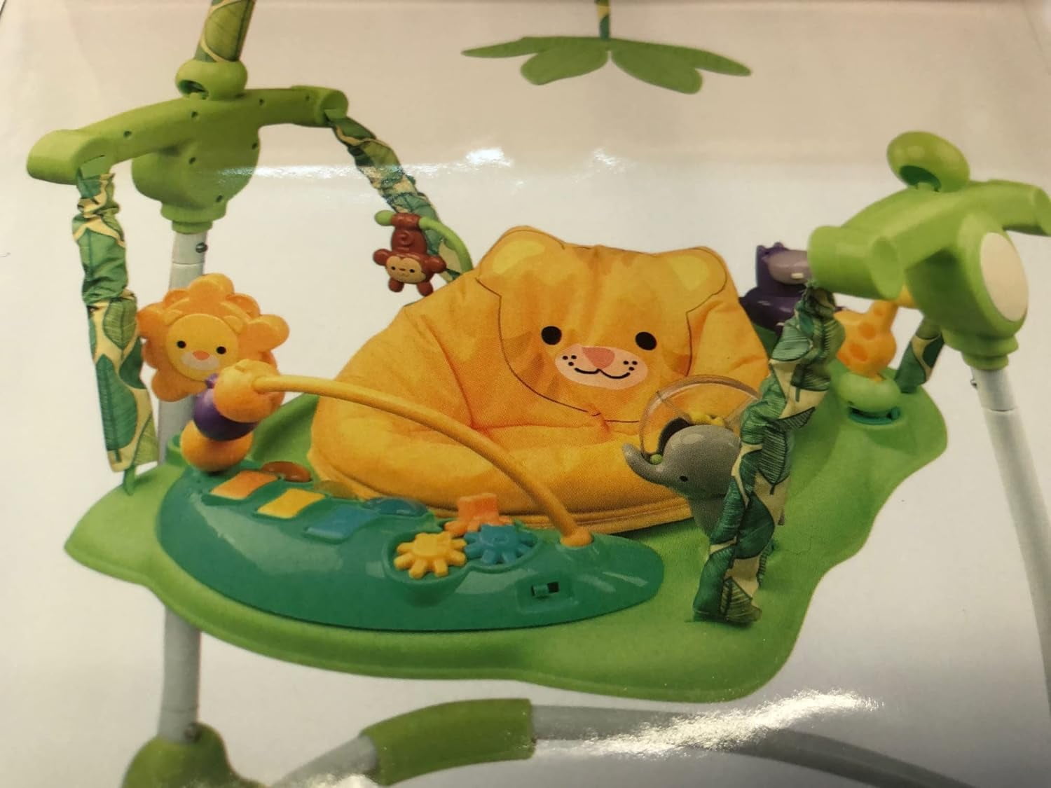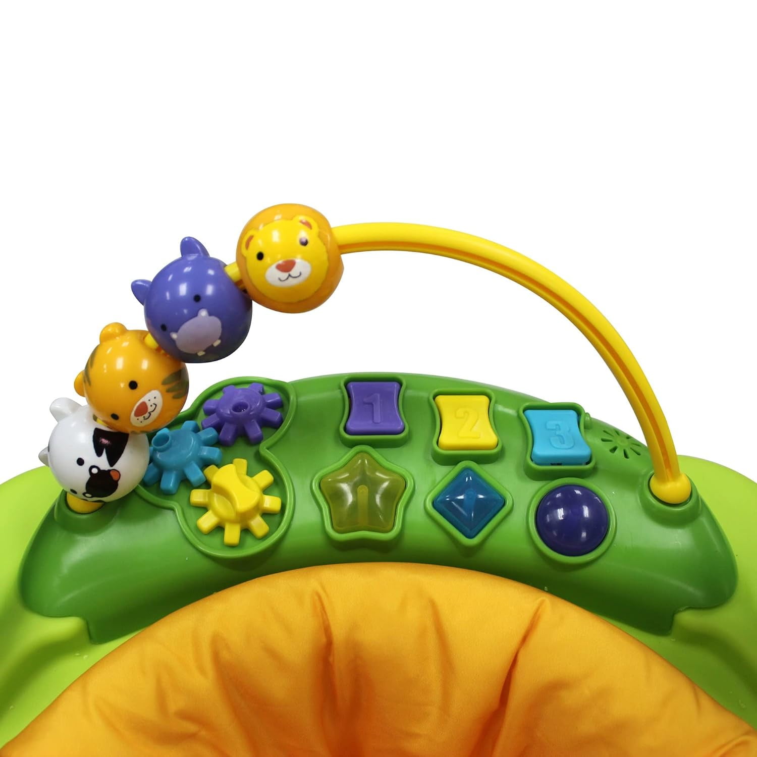 This jungle jumper will get your little one moving. The cushioned seat spins 360 that allow your little one to explore toys around. With over 10 activities including lots toys, lights and music, the Creative Baby Safari Jumper will keep your little one busy. Easy to assemble Imported 2 AA batteries required for music tray (not included) 1-year Ages: 6 months +