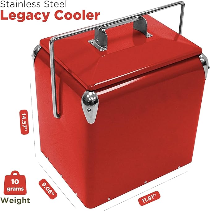 12-qt red legacy retro cooler Ideal for picnics, parties, camping, or tailgating Dual-wall insulated construction to keep beverages cold for longer time Chrome-polished exterior adds nostalgic charm Built-in heavy-duty stainless steel bottle opener