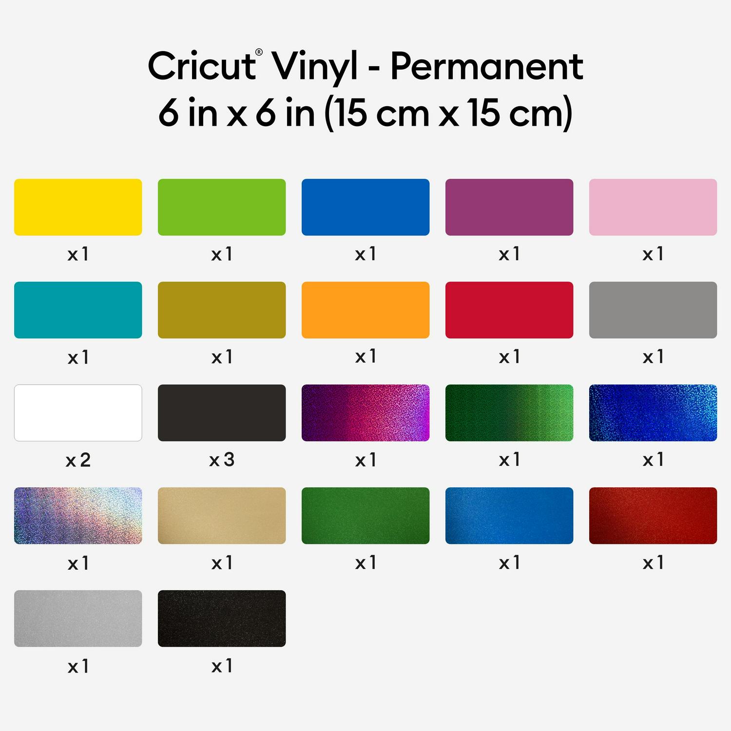 - 25 Sheets of Cricut Permanent Vinyl, 6 in x 6 in (15 cm x 15 cm) – 22 colors