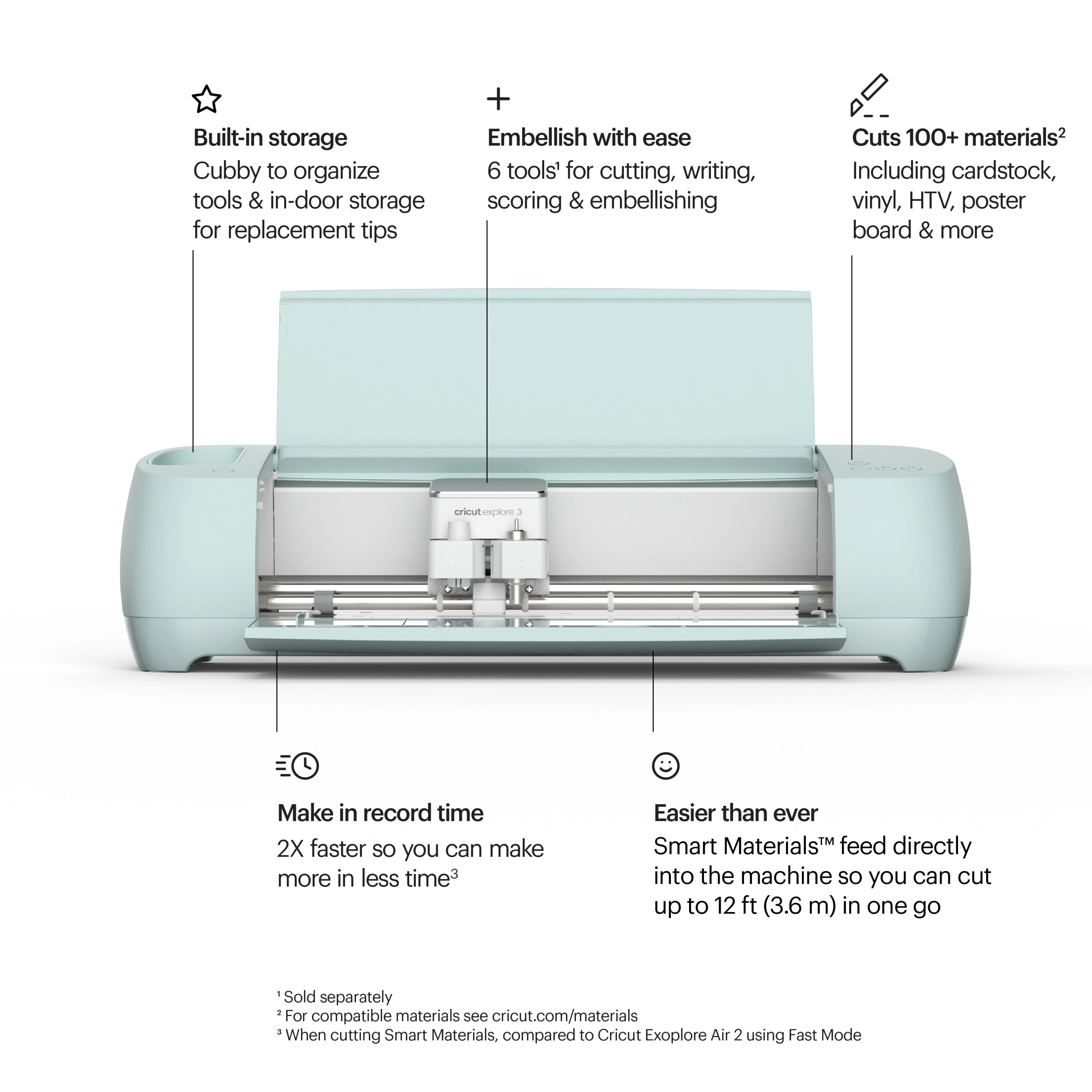 Cricut Explore 3 machine cuts, draws, scores, and more. Works with 100+ materials, including vinyl, iron-on, cardstock, and specialty materials like bonded fabric and cork, bringing incredible speed and precision to every project. Cutting Cricut Smart Materials, you can make long, easy cuts up to 12 ft (3.6 m) without a cutting mat- just load & go! Create custom home decor, decals for your car, heat-transfer iron-on logos t-shirts, or other craft projects. You’ll be ready to tackle every creative task that comes your way. Works with free Design Space app for iOS, Android, Windows, and Mac. -Cuts 100+ materials from cardstock, vinyl & iron-on to glitter paper & bonded fabric -Up to 2X faster than its predecessor -Compatible with Smart Materials for cuts up to 12 ft (3.6 m) in one go -Docking slot for mobile devices & built-in storage -Compatible with Cricut Roll Holder to support rolls of Smart Material up to 75 ft (22.8 m) -Free design app for Windows and Mac computers and iOS and Android device