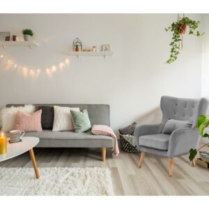 – MODERN AND STURDY: This tufted arm chair with accent pillow is fashionable while remaining comfortable. The cushion is large and perfect to lounge in while relaxing or reading. Use it in a nursery for a fun alternative to a rocker.