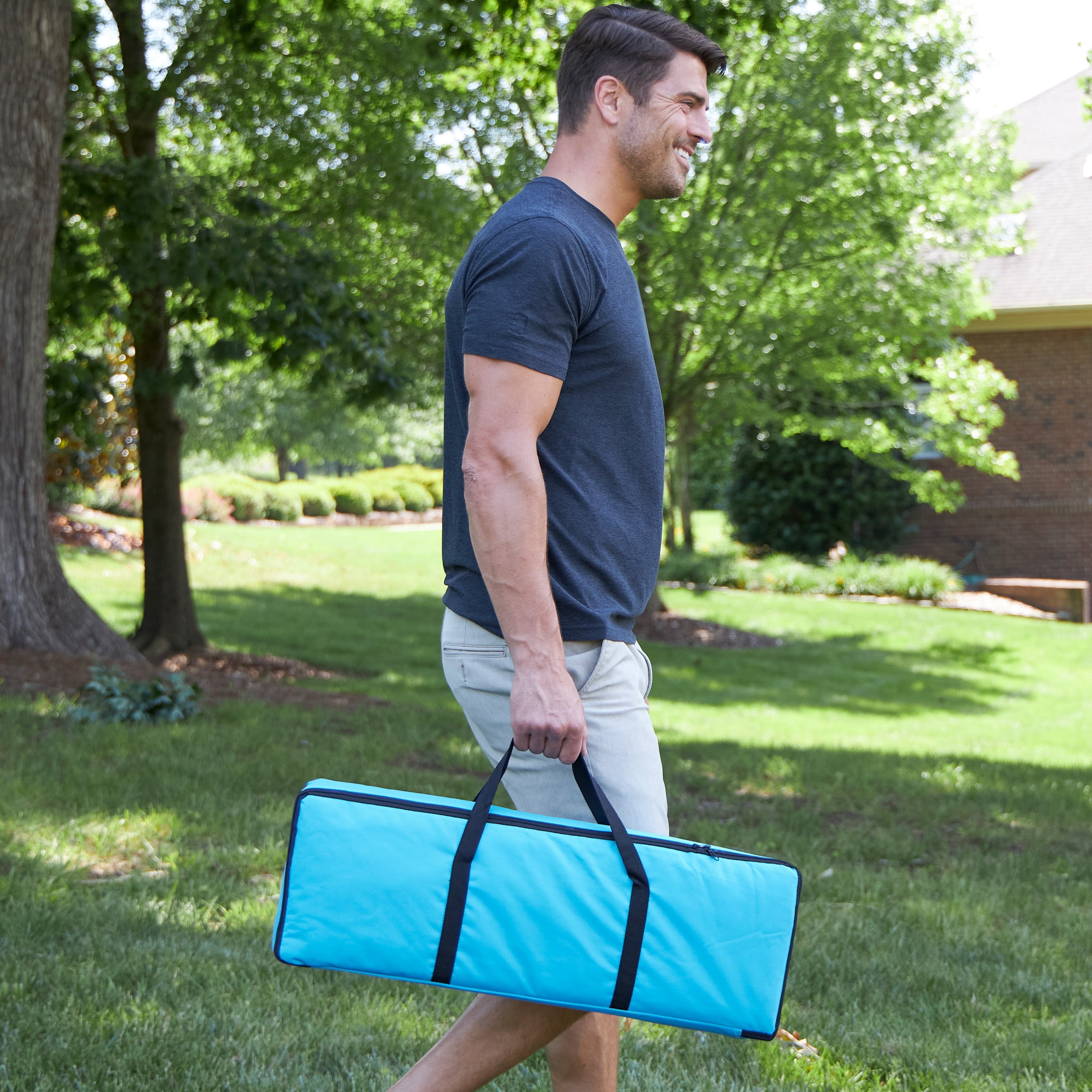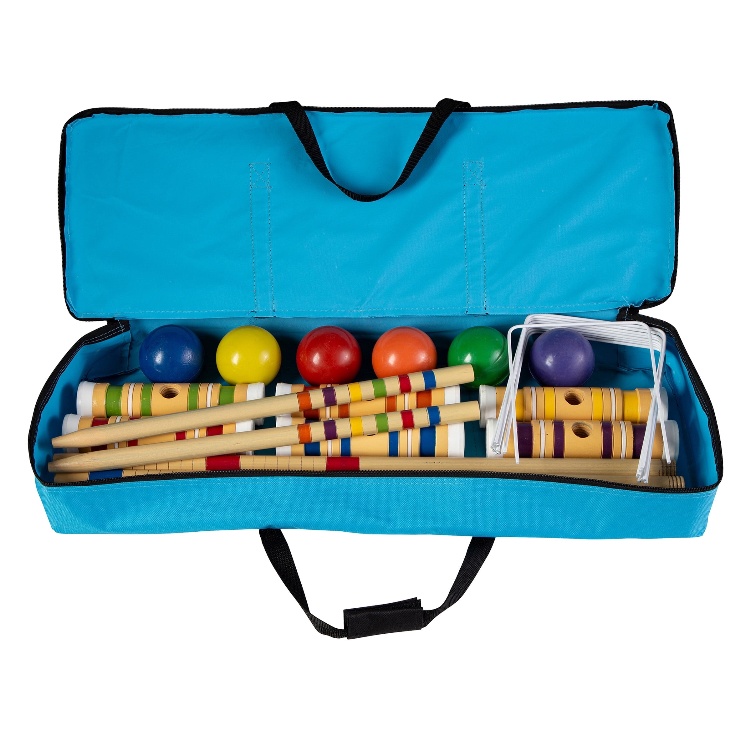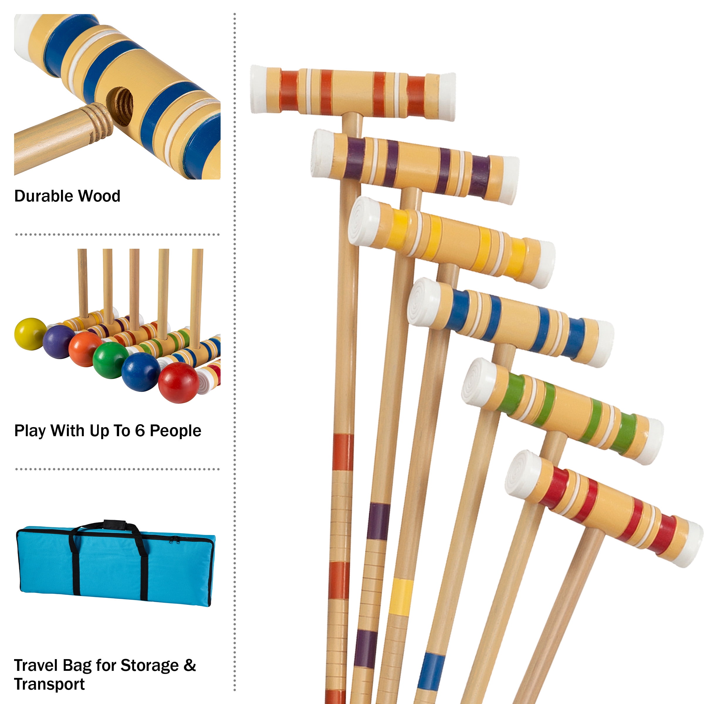 WOOD CROQUET SET – Whether playing traditional USCA Nine Wicket or more fast-paced Golf Croquet, this croquet game is perfect for all abilities and ages. The set comes with 6 mallets, balls, wickets, and post so you can play with up to 6 people at a time. EASY TO PLAY – This game can be set up on almost any flat lawn and can be played at your own pace, making it ideal for adults and kids. Simply set up the wire hoops in the ground, assign colors to players, and try to hit your ball through each hoop. CONVENIENT TRANSPORT – All pieces can be placed into the provided travel bag for storage or transportation. The nylon travel bag also features a zippered closing and two handles with a hook and loop fastener closure for extra carrying comfort. DURABLE BUILD – The backyard games are made of durable wood designed for frequent use and are finished with precision for the feel of vintage lawn games, with the durability of current gear. The wickets are made with vinyl-coated wire for lasting use. PRODUCT DETAILS – Materials: Wood and Metal. Dimensions: Mallets: (L) 8” x (W) 27”; Balls: (L) 3”; Posts: (L) 18”; Wickets: (L) 6.25” x (W) 8”; Carry Bag; (L) 27” x (W) 9”. Includes: 6 Mallets, 6 Balls, 2 Posts, 9 U-Shaped Wire Hoops, and Carry Bag.