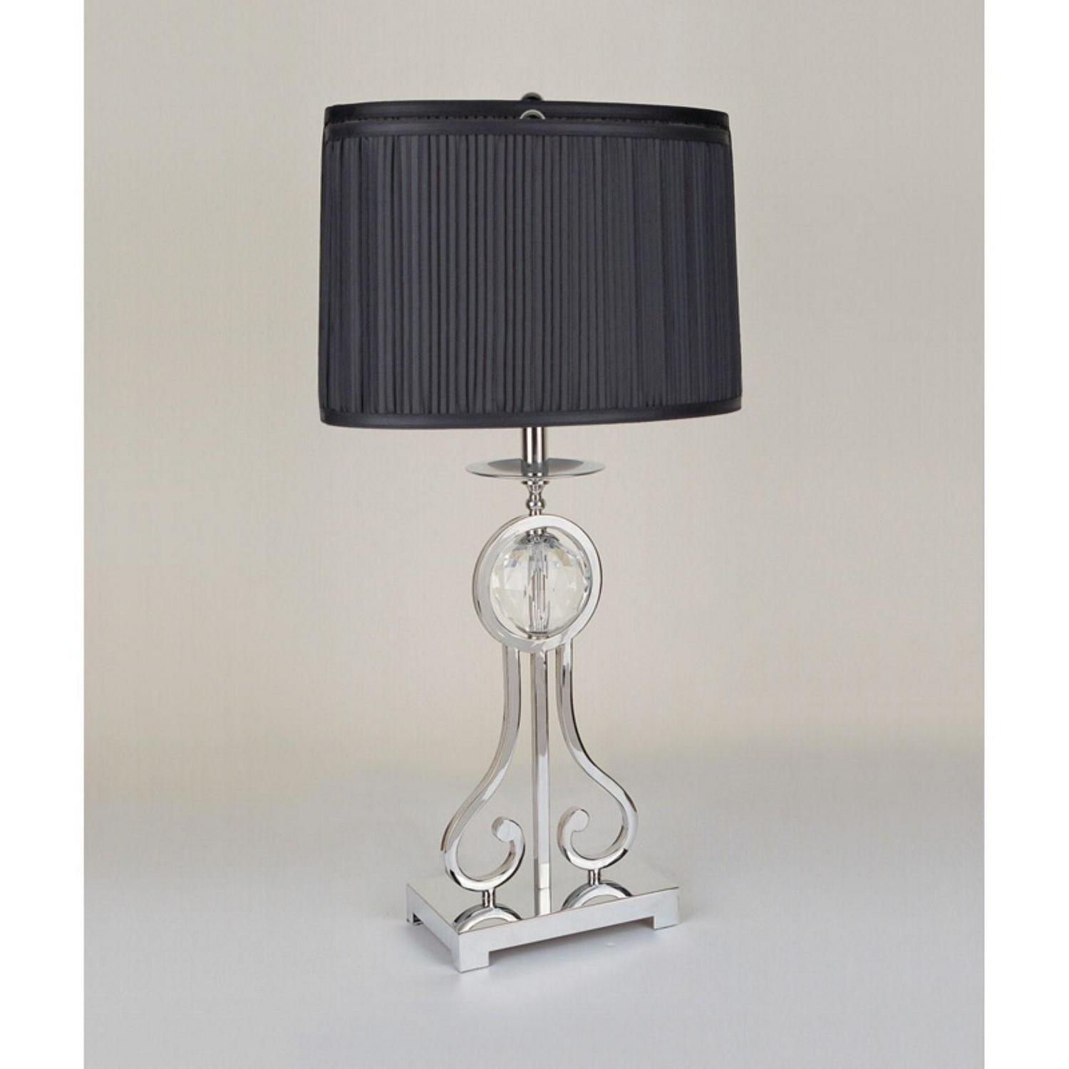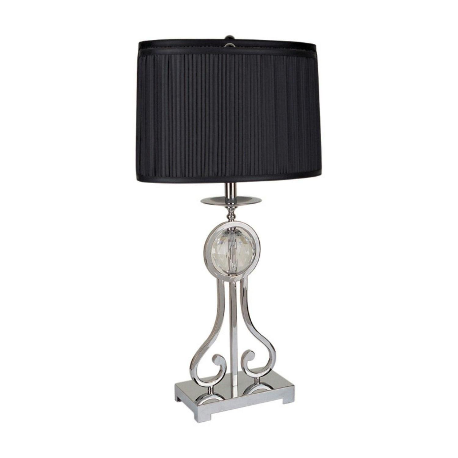 The Crown Mark Chrome Table Lamp with Faceted Crystal Ball Accent strikes a beautiful silhouette and is accompanied with a black pleated oval drum shade. A 3 way switch lets you determine the amount of illumination you want.