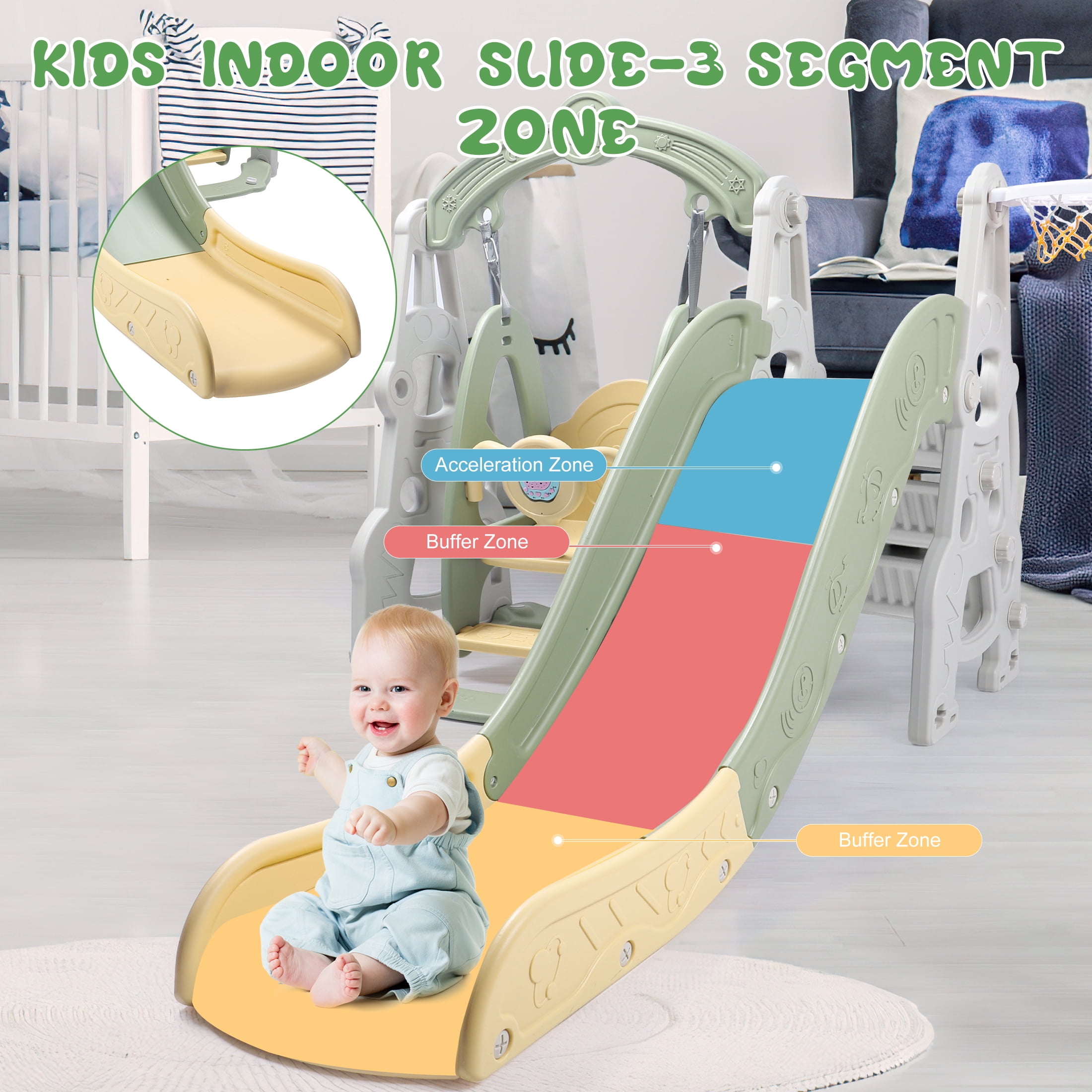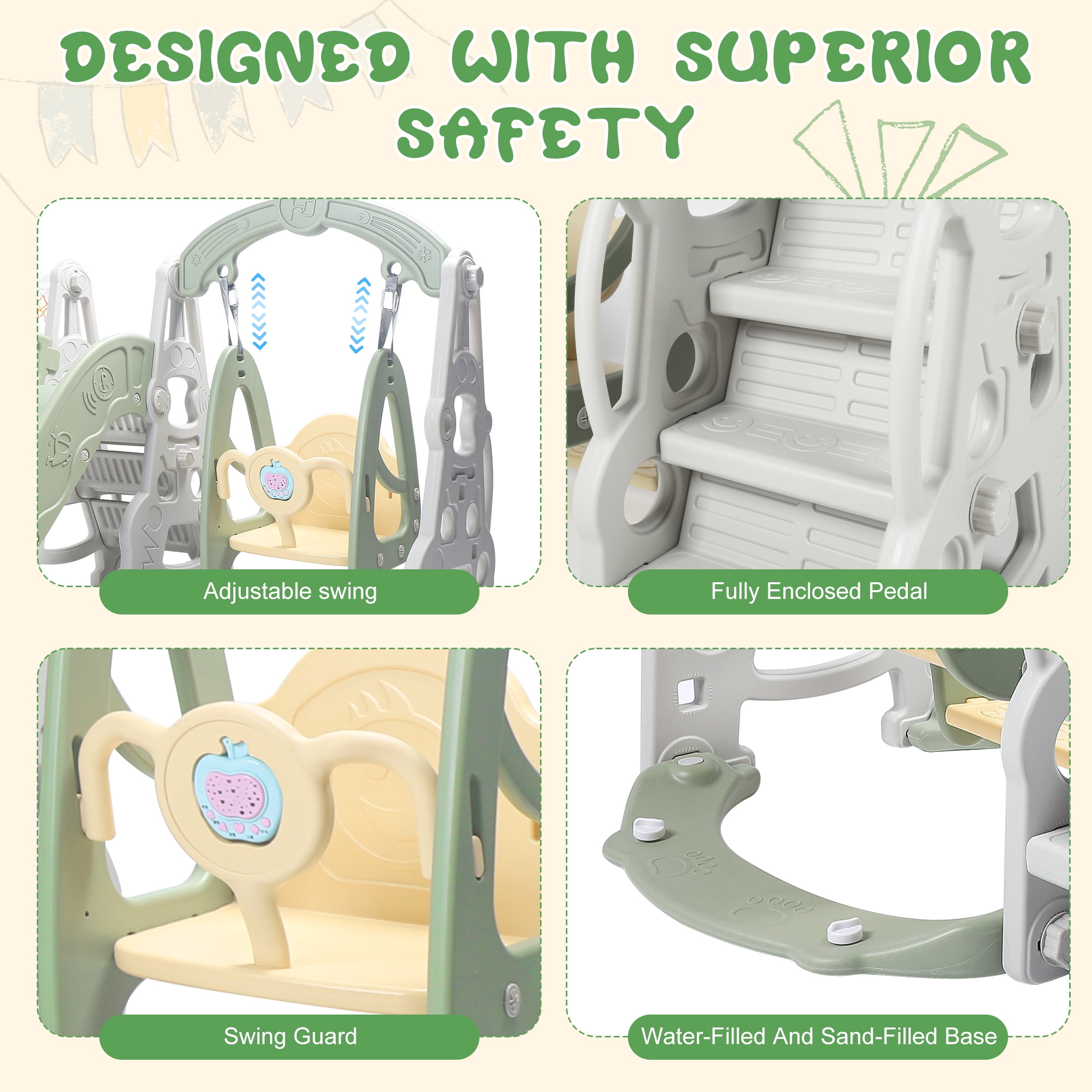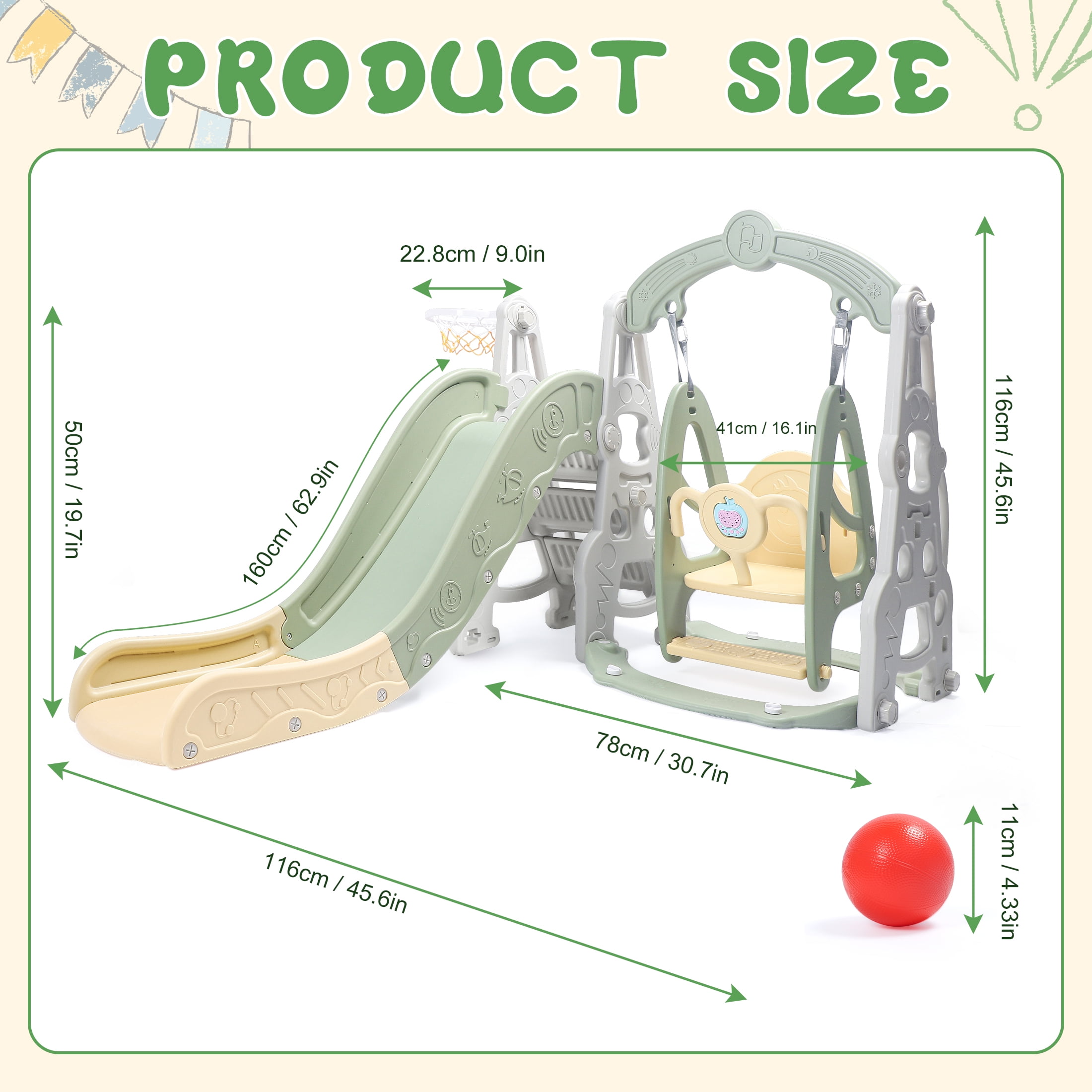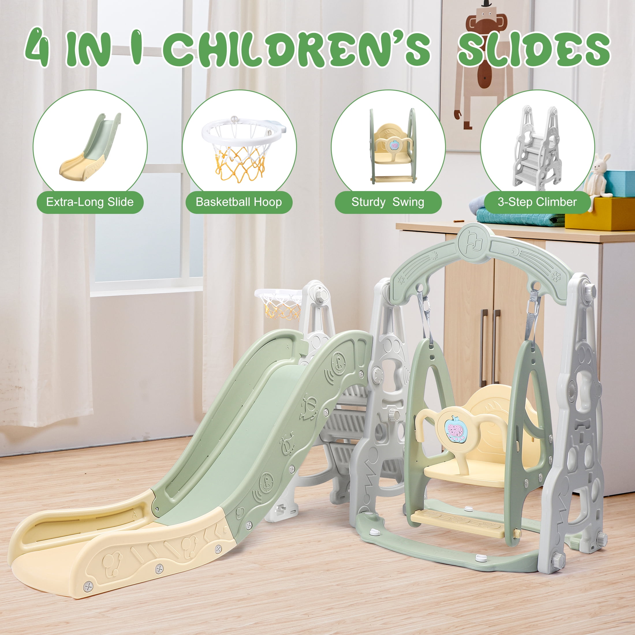4 in 1 Toddler Slide and Swing Set Kid Slide for Toddlers Age 1-3 Baby Slide with Basketball Hoop, Indoor Outdoor Slide Toddler Playset Toddler Playground Product name Indoor Slide MOQ 1 Set Style Plastic Slide Children Indoor Climbing and sliding, closed shooting Adjustable swing with guardrail to prevent baby from leaning forward or sliding down Water-filled and sand-filled base + powerful suction cup Various ways to play: shooting, running, picking up balls, and making hoops Attract baby’s attention at all times and avoid three-minute heat The slide is an adventure for the baby. While feeling the excitement and speed, the baby also undergoes basic sports training. The three-stage slide has heightened height and lengthened guardrails, and the slide is scientifically zoned to enhance the buffering force during sliding, effectively preventing the baby from hurting the little buttocks. Fully enclosed foot pedal to avoid the risk of missing the pedal Widen and enlarge the sliding area to create a spacious activity space for the baby Color: green Material: HDPE Package includes: 1 x children’s slide, 1 x children’s swing, 1 x basketball hoop 1 x Instruction