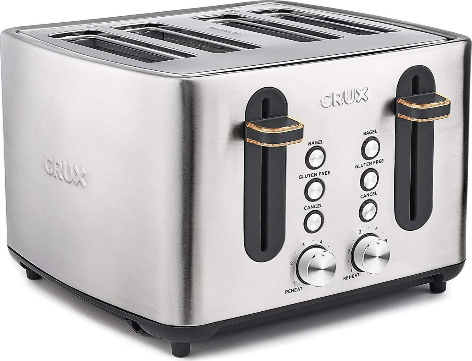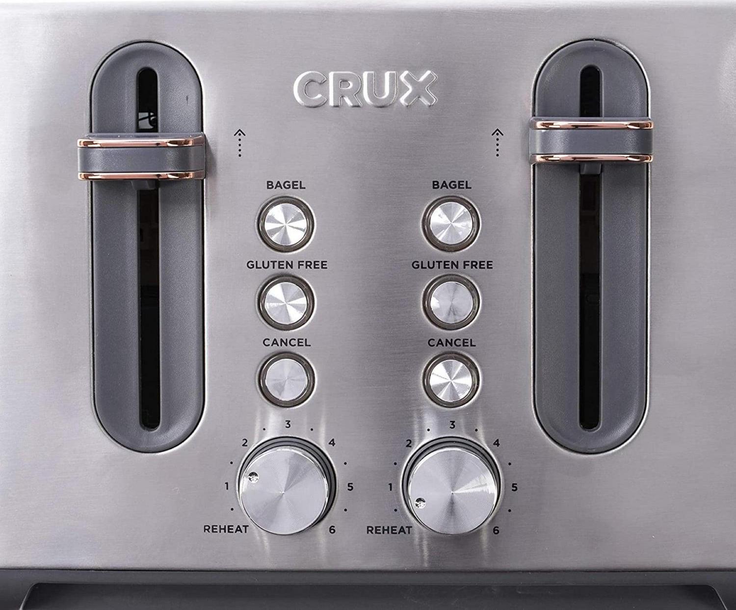 The CRUX 4 Slice Toaster makes meal prep easy for family and friends. Utilize the six-setting shade control dial designed to create consistent and even browning, every time. Toast up to four slices of bread at a time and if they get cold, utilize the reheat feature for instant warming. Designed with extra wide slots, the CRUX 4 Slice Toaster can accommodate standard sliced bread, bagels and thick baguettes. Gluten free A newly developed feature provides the ideal cooking environment for your favorite breads. Often denser in quality, gluten free breads require a longer cooking time. The gluten free feature adjusts and adds the ideal amount of time to your toasting cycle, accommodating all your gluten free needs. We ve added white LED lights to indicate when your toast is ready, high lifting levers to easily remove your toast, and anti jam and auto shut off features for your safety. The CRUX 4 Slice Toaster is sleek, easy to clean, and gets the job done every time. Toasting as it should be: simple, straightforward, and perfectly browned.