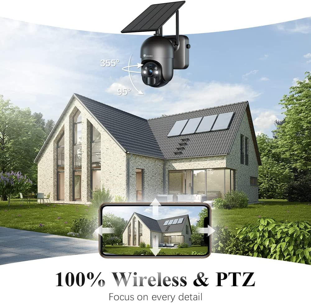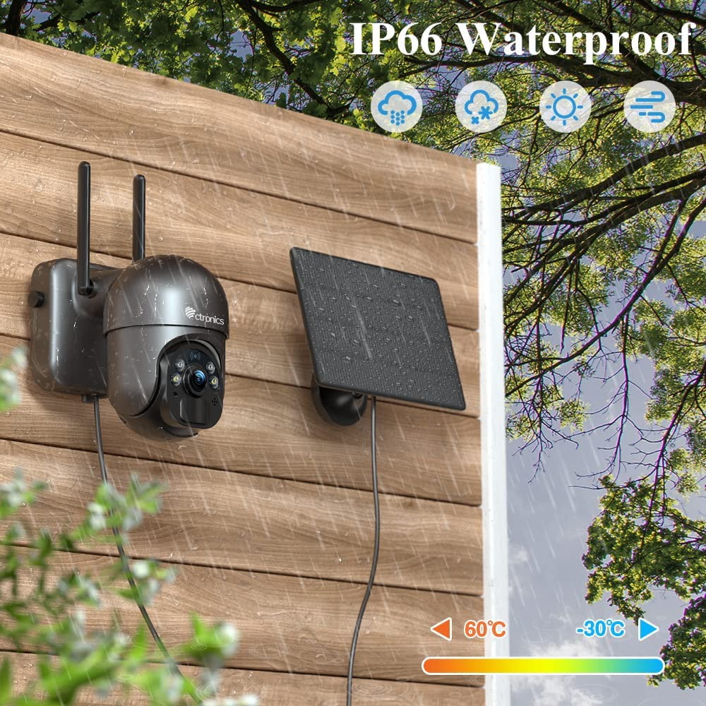 🔋📷1. 2K 4MP & 82FT COLOR NIGHT VISION: Ctronics Outdoor Wireless Security Cameras, its clearer and smoother images/videos with full-color night vision up to 82 feet for better home security. 🔋📷2. SPOTLIGHT COLOR NIGHT VISION: This 2K solar camera outdoor wireless is equipped with 2 spotlights and 2 infrared LEDs offering 2 night vision modes: color mode and infrared mode. This 2K 4mp outdoor surveillance camera gives you bright and vivid color images, even in complete darkness. Provides visibility up to 82 feet. 🔋📷3. BATTERY OR SOLAR POWERED & 100% WIRELESS 2-WAY INSTALLATION: Uninterruptible power supply and 100% wireless installation with all-in-one or separated options. With powered by the 3.5W solar panel powered and the 10000mAh battery, the security camera can last for 4 weeks continuously use or 12 weeks on standby, btw the battery life is determined by the detection sensitivity and the number of detections you set. We recommend enabling person detection and setting the appropriate detection sensitivity. 🔋📷4. PIR HUMAN DETECTION & INSTANT ALERTS: The solar Wi-Fi camera has a high-sensitivity PIR sensor, which can react within 0.2s when motion is detected, and allows the security camera to wait on standby with ultra-low power consumption. Human detection can reduce false alarms caused by things like rain and insects by 95%. Alarm sensitivity is adjustable from low to medium to high, with a monitor distance of up to 10 m/32 ft. 🔋📷5. TWO-WAY AUDIO & MULTI-USER VIEWING: Ctronics Solar home surveillance camera with the built-in high-quality speakers and microphones make sure to communicate with people in the surveillance area even you’re away from home.Ctronics Solar home surveillance camera with the built-in high-quality speakers and microphones make sure to communicate with people in the surveillance area even you’re away from home.