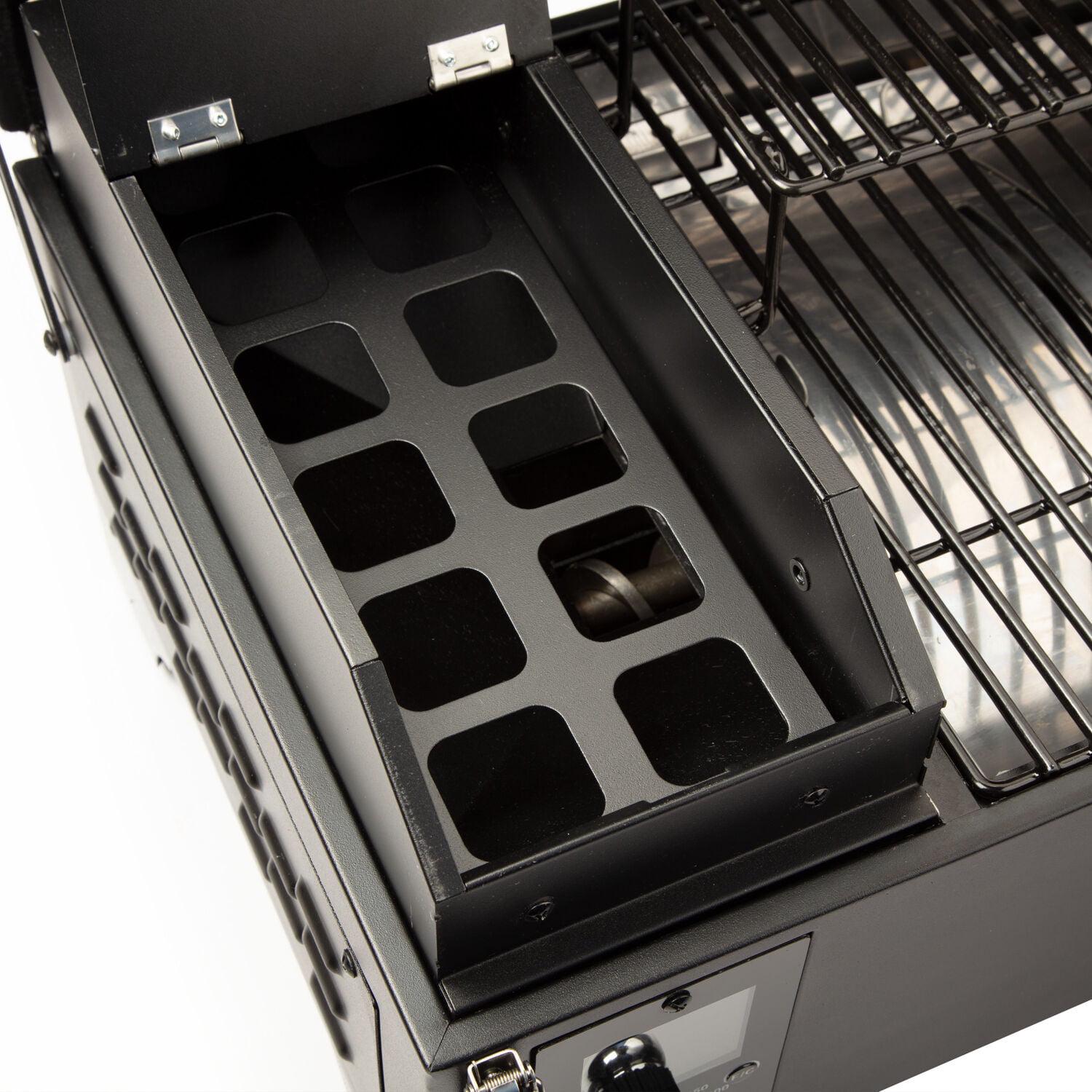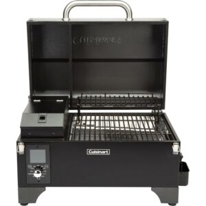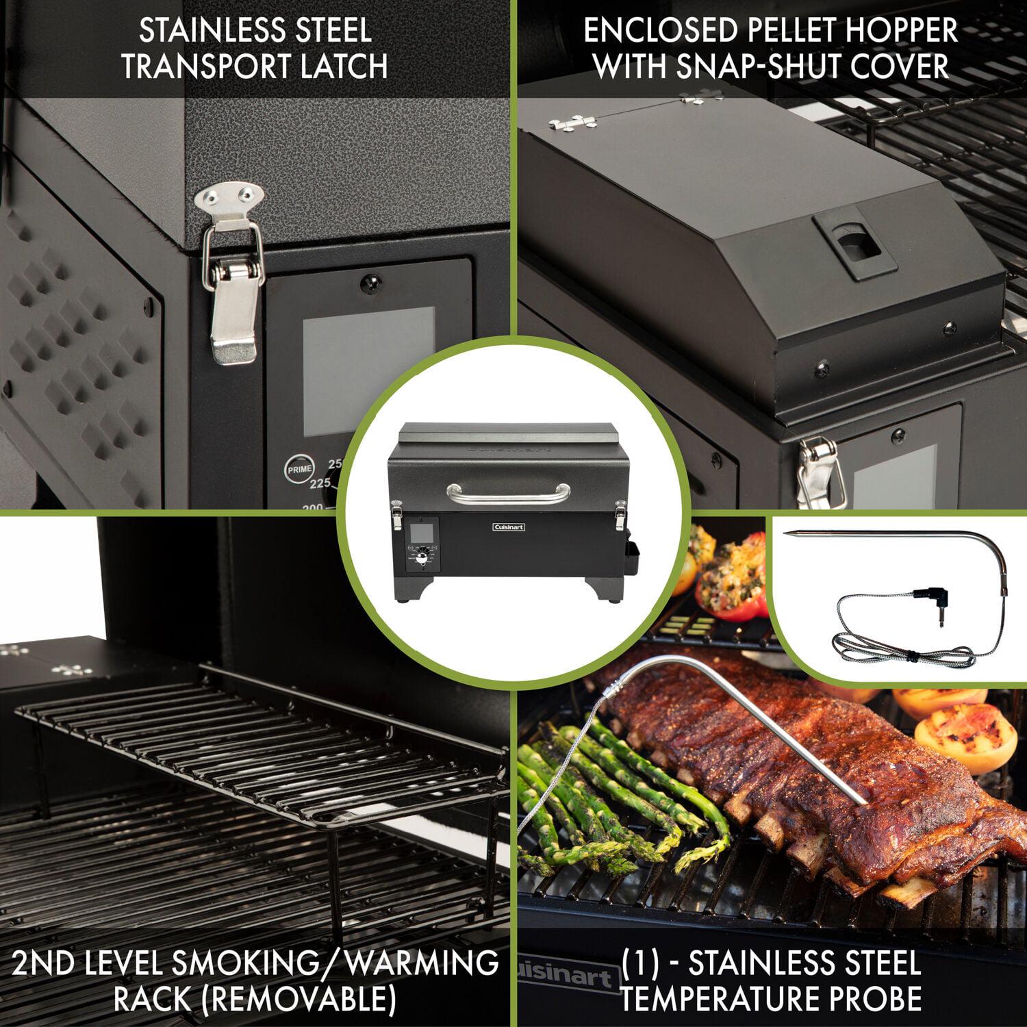Get smokin with the Cuisinart portable wood pellet grill and smoker! This small but mighty grill has 256 sq.in. of cooking space and an integrated sear zone, allowing for direct or indirect grilling. It offers 8-in-1 versatility cooking: smoke, BBQ, grill, roast, sear, braise, bake, and char-grill. With a wide temperature range from 180F to 500F, the digital control automatically adds pellets as needed to regulate the temperature. The 4 lb. hopper capacity allows this pellet grill to smoke for hours without refilling. Enjoy the set it and forget it style cooking with one meat probe included to help you keep an eye on the food temperature. This portable unit is great for backyard dinners, camping, tailgating, and more!