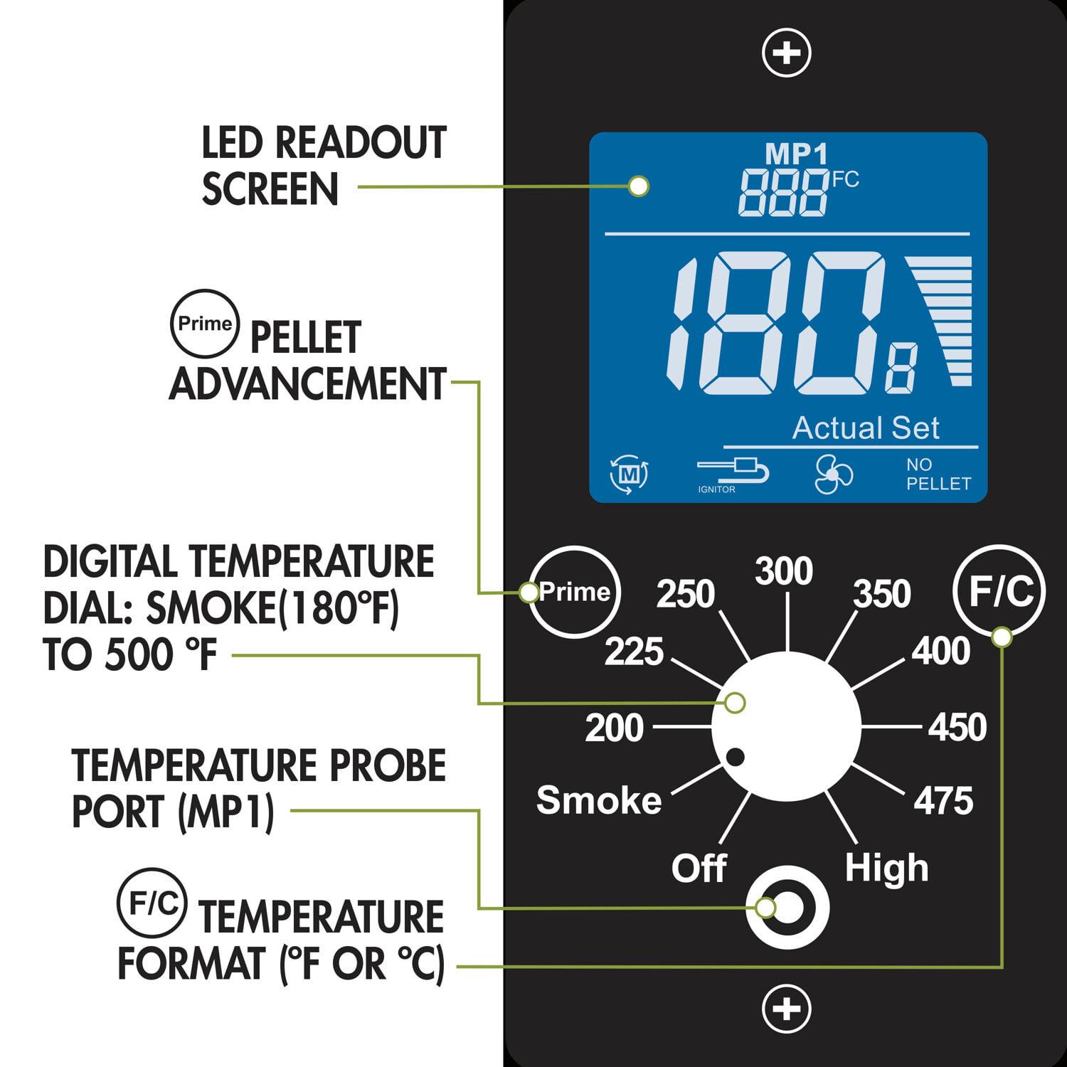 – With a wide temperature range from 180F to 500F, the digital control automatically adds pellets as needed to regulate the temperature