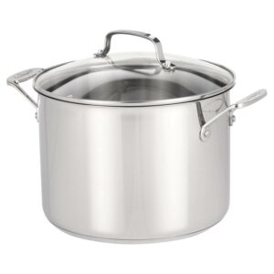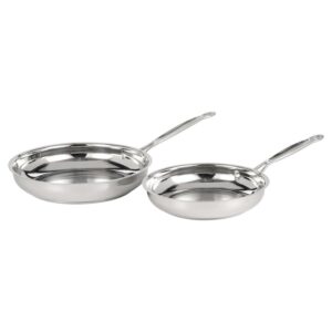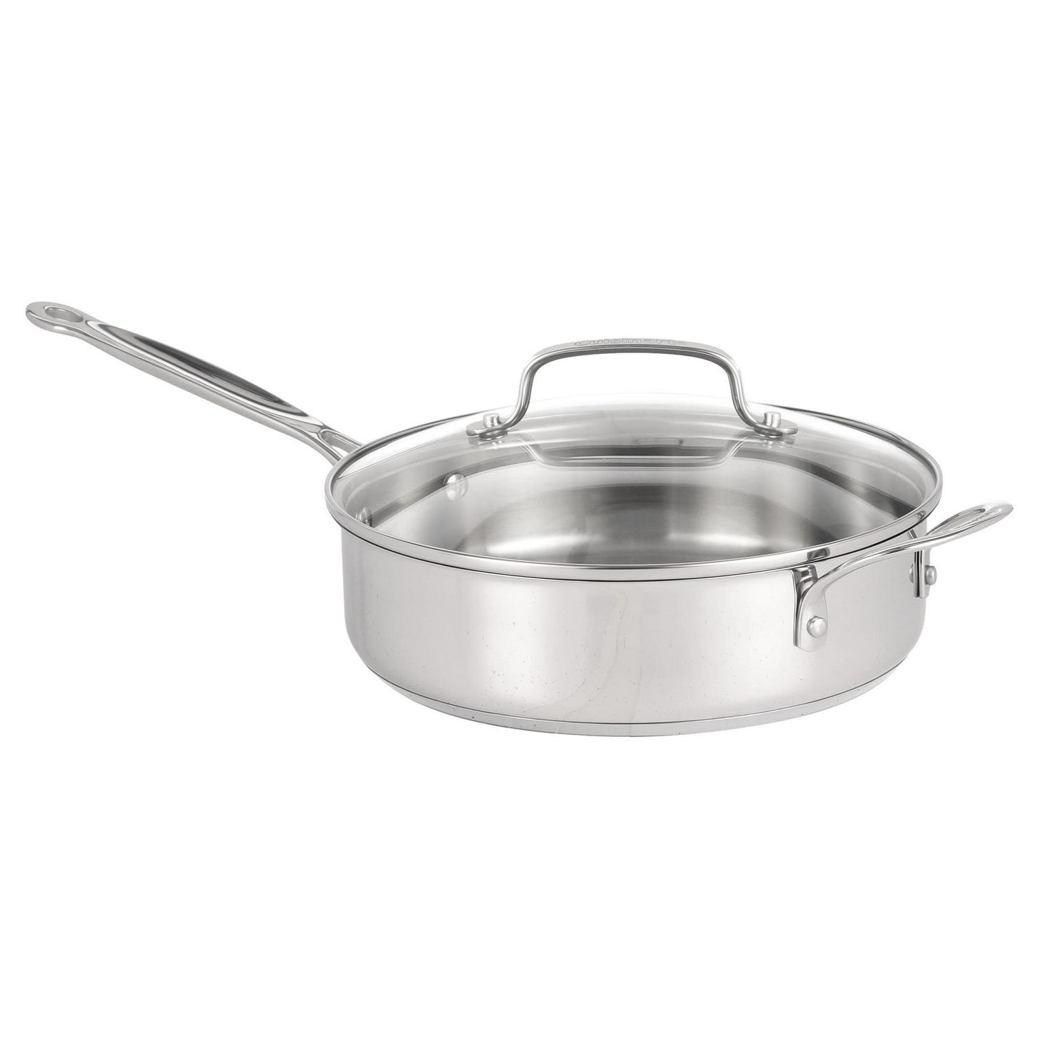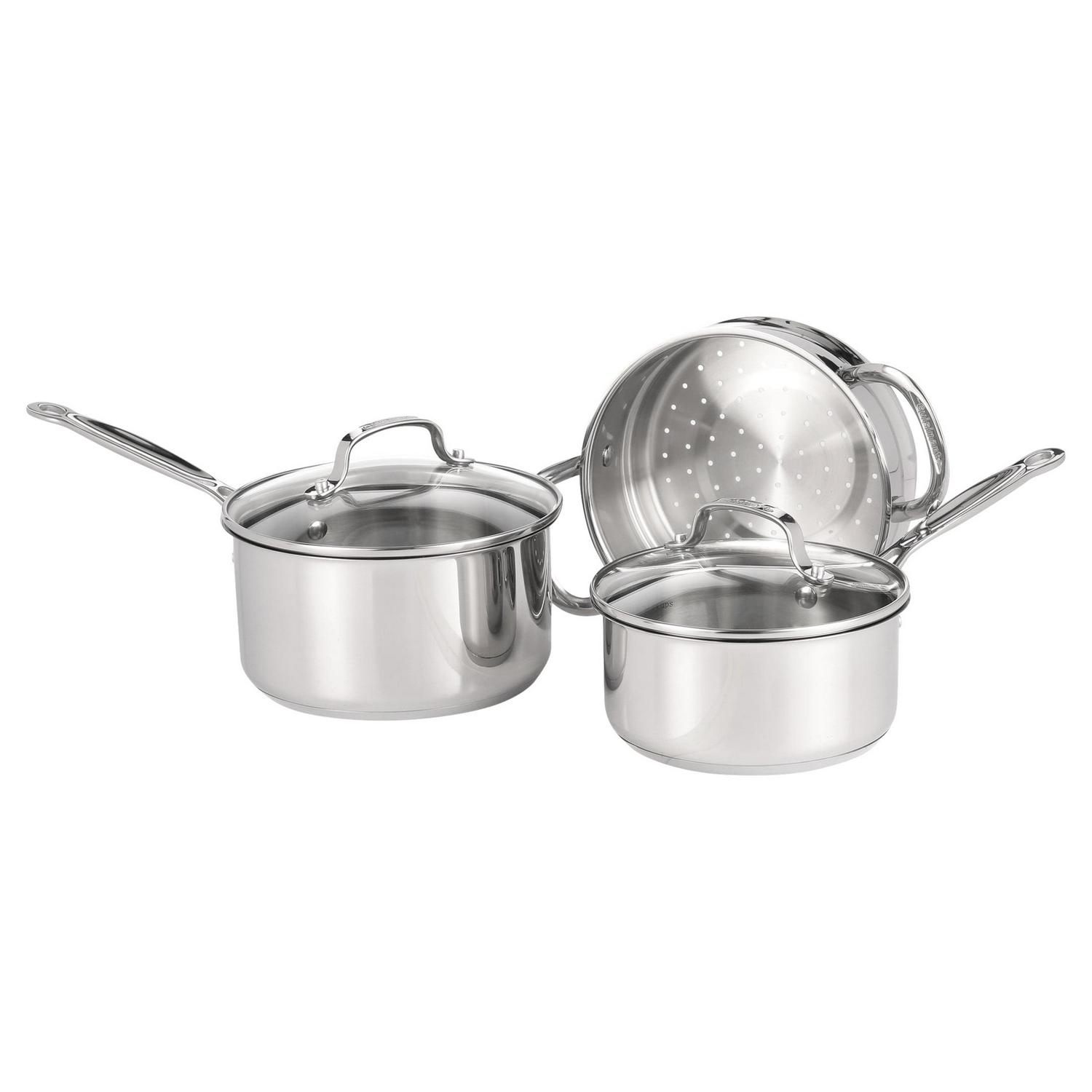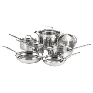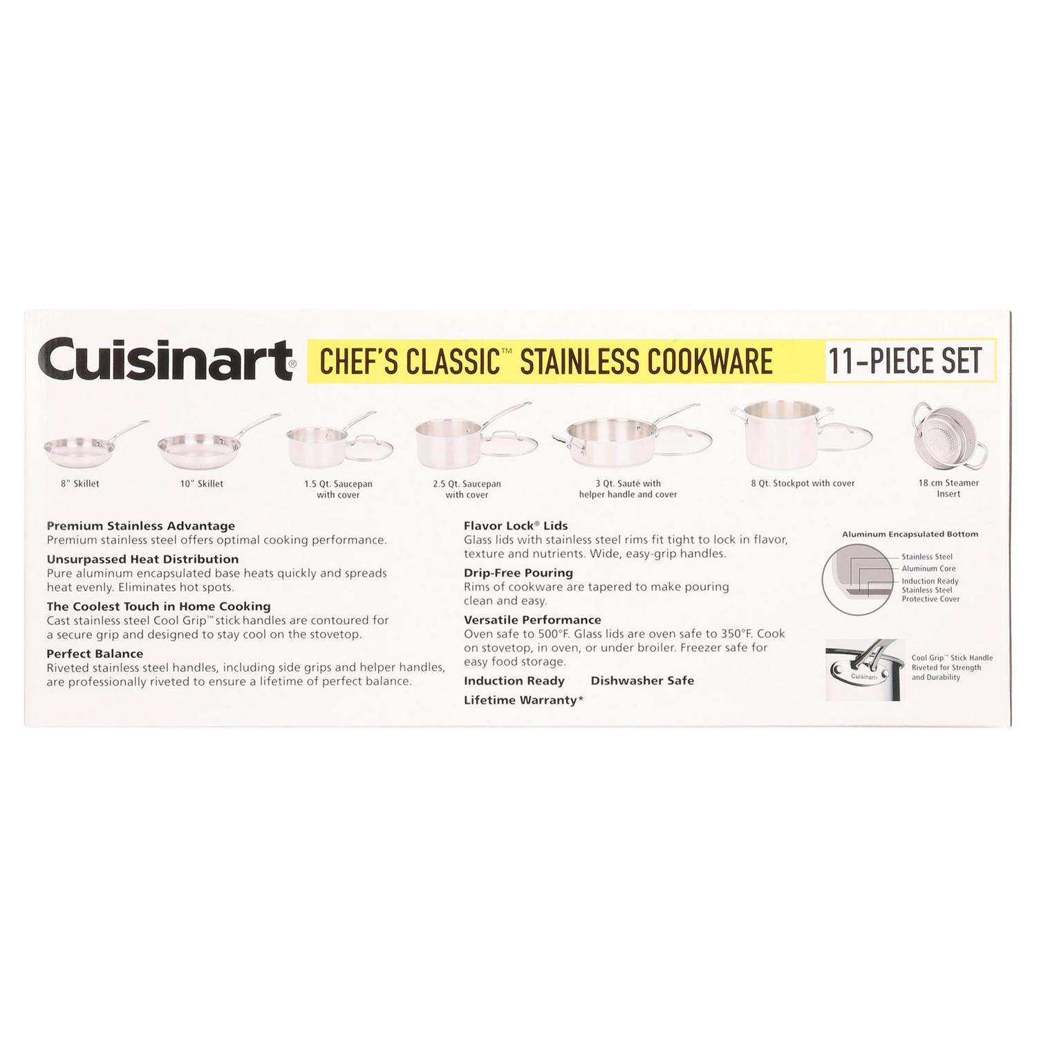 All the essentials every kitchen needsProduct Information The kitchens of France were the inspiration behind the Cuisinart Chef’s Classic Stainless 11-Piece Cookware Set. Cuisinart knows their way around the kitchen, and have included everything you need to perfectly perform all the basic cooking tasks, large or small. From reheating a single portion of soup, to preparing appetizers, entrées and side dishes for the entire family, you’ll find every tool you need in this deluxe set. The set features stainless steel construction with pure aluminum encapsulated bases for fast and even heating. Included is a 1.5 qt saucepan with glass cover, 2.5 qt saucepan with glass cover, 3 qt saute pan with glass cover, 8 qt stockpot with glass cover, 8″ skillet, 10″ skillet, and 18cm steamer insert.Product FeaturesProvides all the essentials a serious chef needs including 2 saucepans, a saute pan, a stockpot, 2 skillets, and a steamer insertUse the pots and pans to saute veal, simmer stock, slow-cook oatmeal, grill fish, and moreMade with a 18/10 stainless steel cooking surface which does not discolor, react with food or alter flavorsDesigned with tapered rims which allow for easy drip-free pouringIncludes solid stainless steel cool grip riveted handles that stay cool on the stove-topAluminum-encapsulated bases heat quickly and spread heat evenly, virtually eliminating hot spotsBreak-resistant glass covers allow you to monitor food while it is cooking without losing heat or food flavorsTight fitting covers seal in moisture and nutrients for healthier, more flavorful results, every time you cook.Includes1.5qt Saucepan w/ Glass Cover2.5qt Saucepan w/ Glass Cover3qt Saute Pan w/ Glass Cover8qt Stockpot w/ Glass Cover8″ Skillet10″ Skillet18cm Steamer InsertSpecificationsColor: Stainless SteelOven Safe: 400 Degrees (lids up to 350 degrees)Construction: 18/10 stainless steel with aluminum disk encapsulated in the baseLid Construction: Tempered glassMaterial: Stainless SteelHandle Attachment: RivetedWarranty: Limited Lifetime Manufacturer Warranty