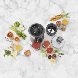 Skip the juice bar lines and create healthy, freshly extracted juices from home using the Cuisinart Combo Juice Extractor & Citrus Juicer! This dual-purpose juicer makes quick and easy work of juicing your favorite fruits and veggies, enabling you to easily maintain a healthy lifestyle. The extractor quickly blends fruits and vegetables using 220 watts of centrifugal force paired with a durable grinding disc and separates the pulp from the juice with the micro-mesh basket – letting the finely strained juice freely flow into the juice container below. When juicing oranges, grapefruit, or other citrus fruits, the push-activated citrus juicer thoroughly grinds straight to the rind. Equipped with an adjustable ream that allows you to choose between high, medium, or low pulp control, as well as easy-to-use controls, the Cuisinart Combo Juice Extractor & Citrus Juicer is the choice juicer to craft an endless variety of fresh and fun juice blends!