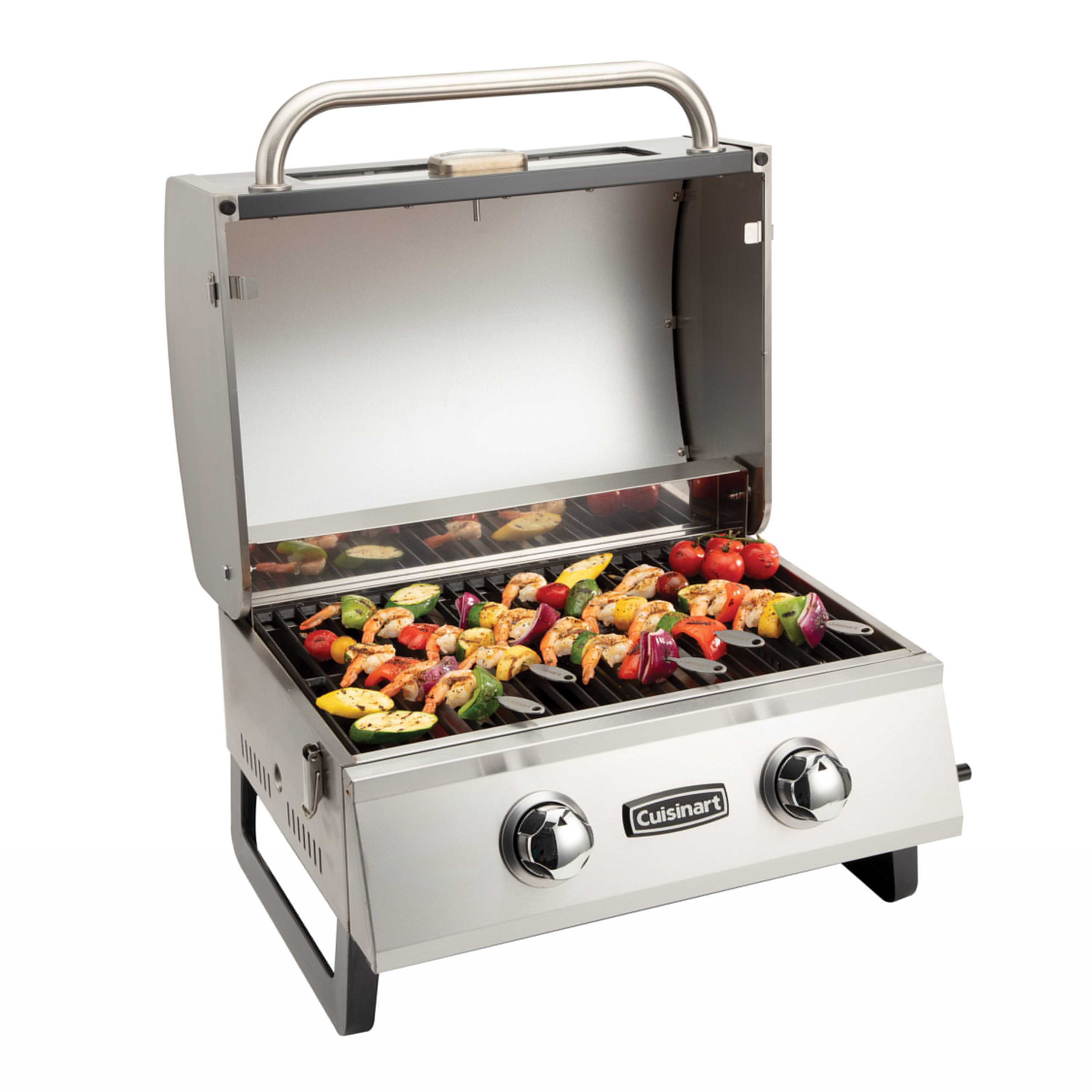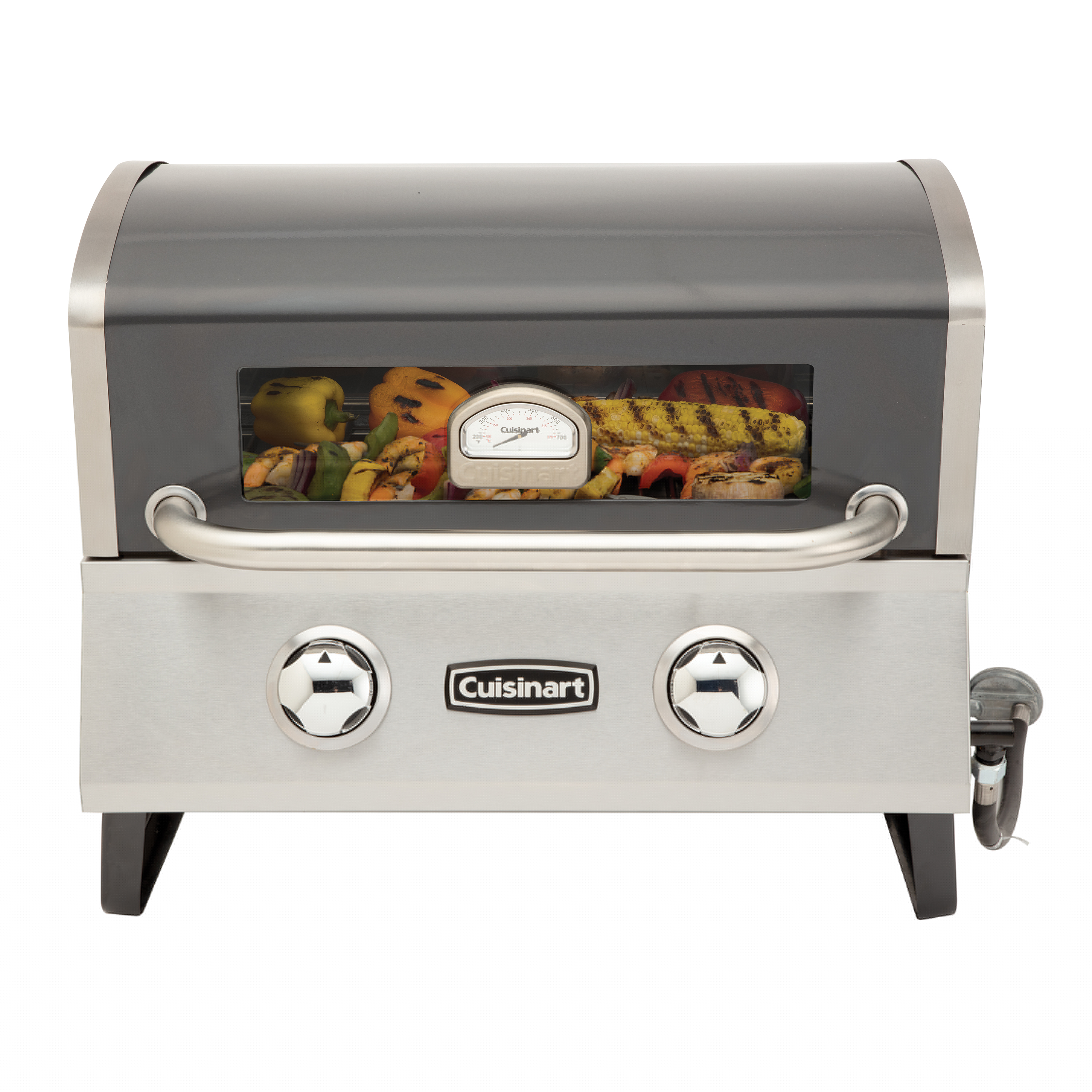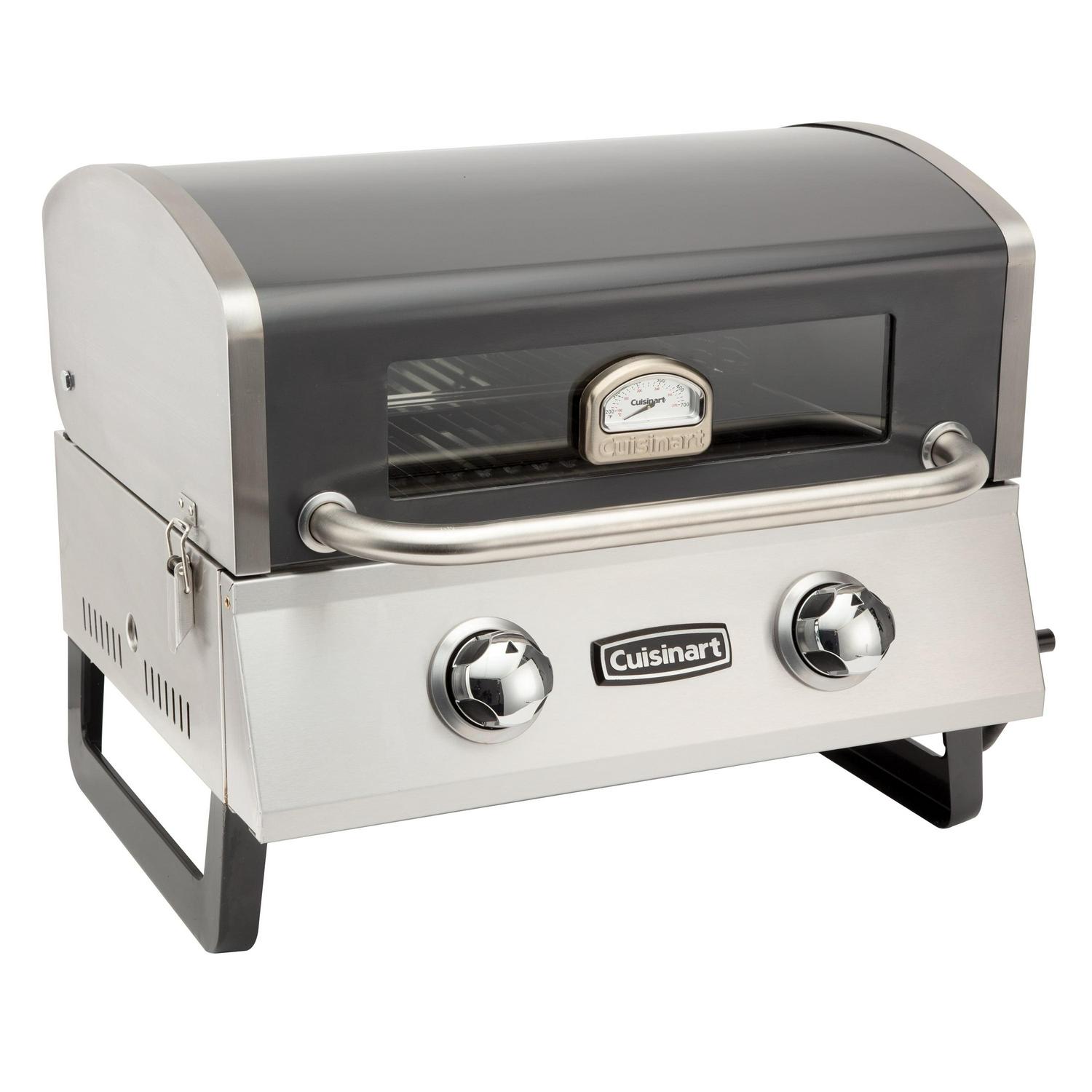 The Cuisinart Deluxe Two Burner Portable Gas Grill combines the convenience of a smaller portable grill, with the performance of a traditional full size grill. The lid features double-walled insulation that is ideal for retaining heat while cooking. In addition, the glass viewing window allows you to monitor your cook from the outside, cutting down on how much you need to open the lid. The window is equipped with a temperature gauge, allowing you to easily track the temperature grill while cooking. The extra height on the lid allows for grilling of larger cuts of meat, like whole chickens or pork shoulders. The grate is made from durable cast iron and provides 275 square inches of cooking space. The grill includes an LP gas hose that allows for connection to any standard 20 lb. propane tank. Underneath the grill is a grease tray for catching any drippings and debris from food. Simply wash out after each use and replace, so it is ready for your next BBQ. When on-the-go, this grill is easy to take with you, use the locks to latch down the lid, fold up the legs and you’re good to go.