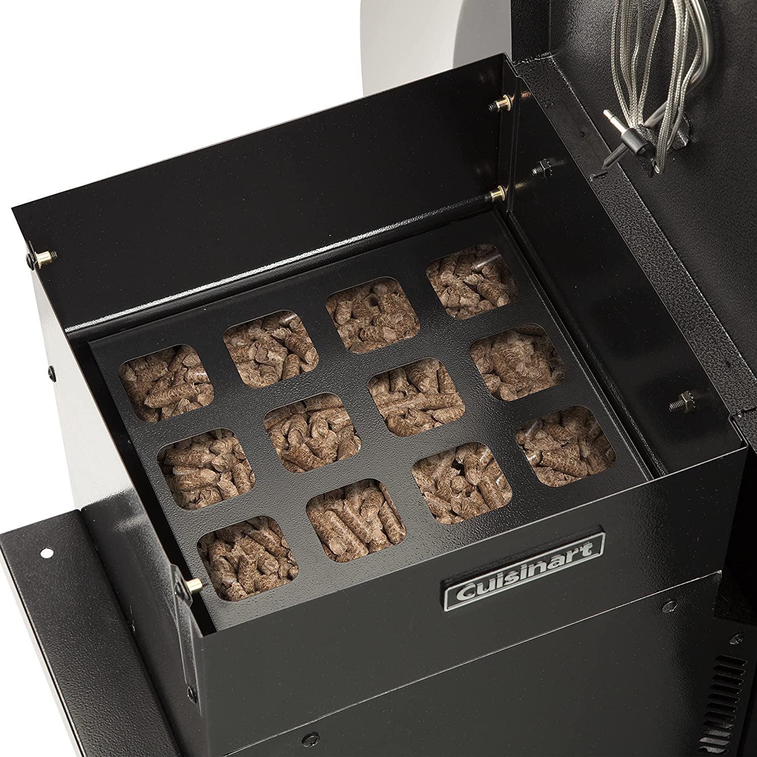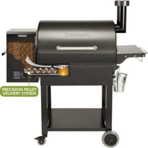 Make some mouthwatering meals with the Cuisinart Deluxe Wood Pellet Grill and Smoker! This grill has 700 sq.in., 484 sq.in. main rack + 216 sq.in, of cooking space and an integrated sear zone, allowing for either direct or indirect grilling, offering 8-in-1 versatility cooking; Smoke, BBQ, Grill, Roast, Sear, Braise, Bake, and Char-Grill. With a wide temperature range from 180°F to 500°F, the digital control automatically adds pellets as needed to regulate the temperature. The 21 lb. hopper capacity allows this pellet grill to smoke for hours without refilling. All-Terrain Wheels and Lift Handle makes it easy to move when not in use. Also features 13 inches of prep space with a bottle opener, tool hooks, and a paper towel holder. Enjoy the set it and forget it style cooking with two included meat probes to help you keep an eye on the food temperature. This smoker is great for backyard dinners, camping, tailgating, and more!